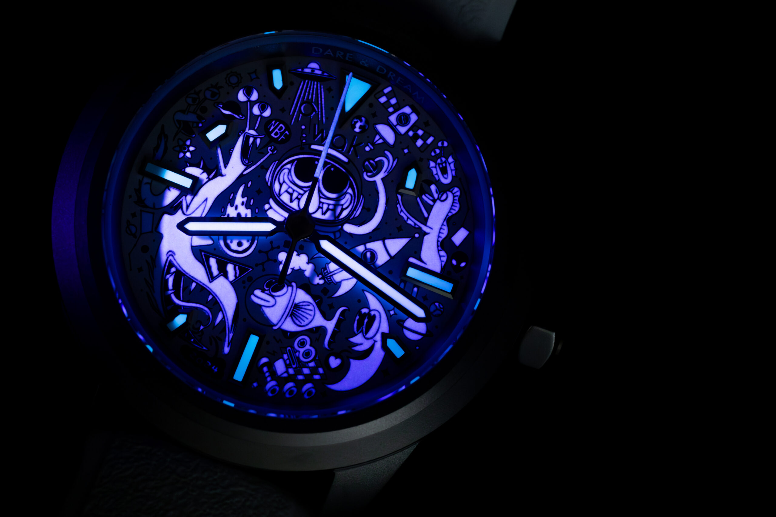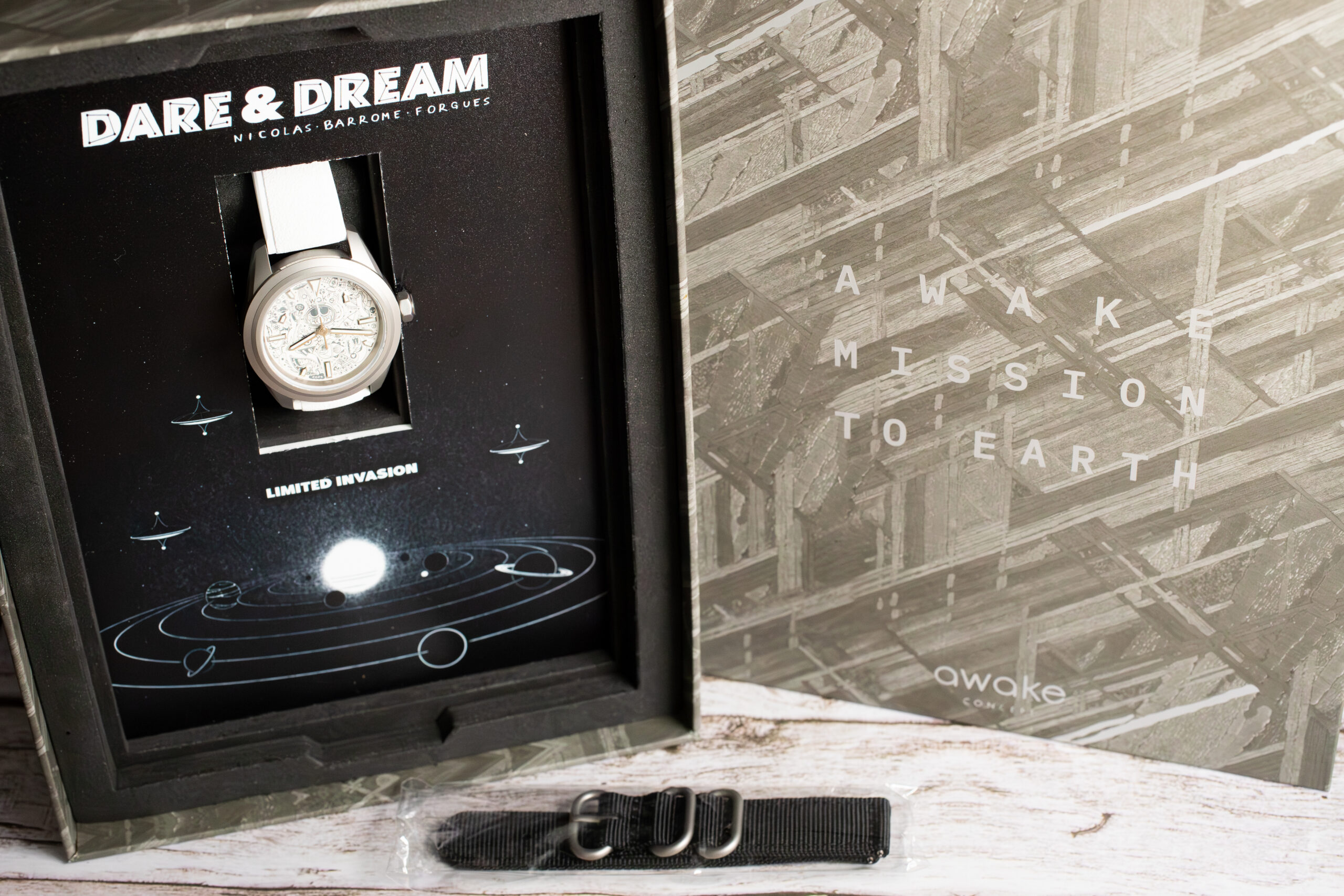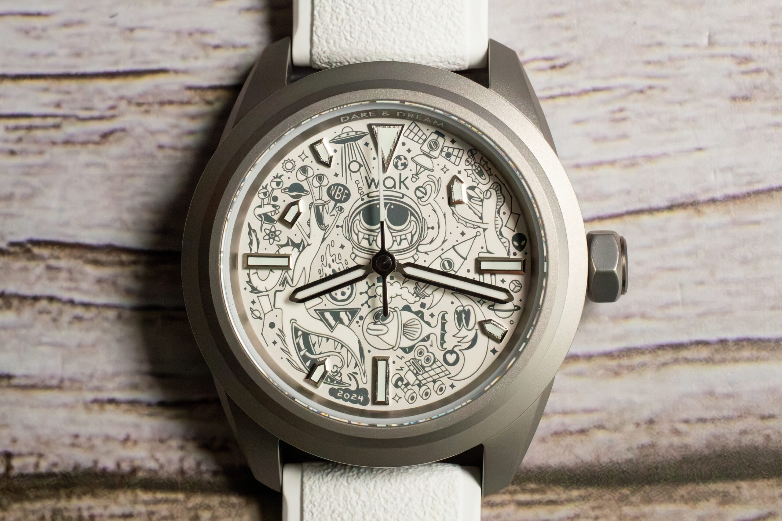 The AWAKE Dare & Dream x Nicolas Barrome Forgues Limited Edition 40mm represents exclusive creative collaboration limited to just 50 pieces worldwide, now completely sold out, between the French microbrand founded in 2019 and the artist to conclude the Mission To Earth space epic through whimsical Bifrons characters. The recycled Grade 2 titanium construction demonstrates environmental consciousness whilst the lightweight 65g total weight ensures exceptional wearing comfort.