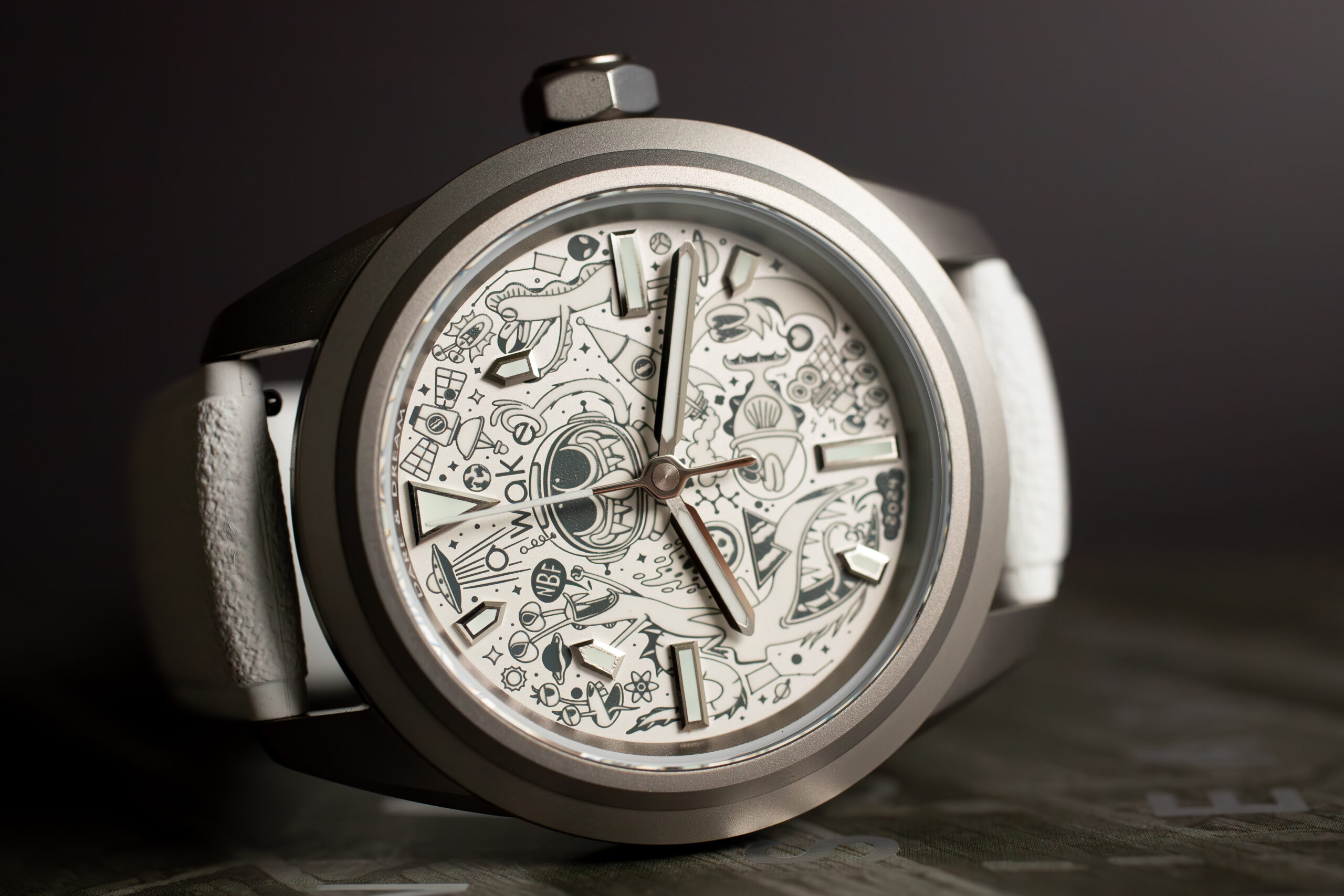 At 40mm with 11.3mm thickness, this provides optimal proportions through recycled titanium case that offers superior strength-to-weight ratio whilst the white dial serves as metaphorical blank canvas for Nicolas’s imaginative artwork. The mischievous Bifrons characters interact playfully with the dial elements, stealing indexes and dismantling the logo through pad-printed motifs that create unique personality.