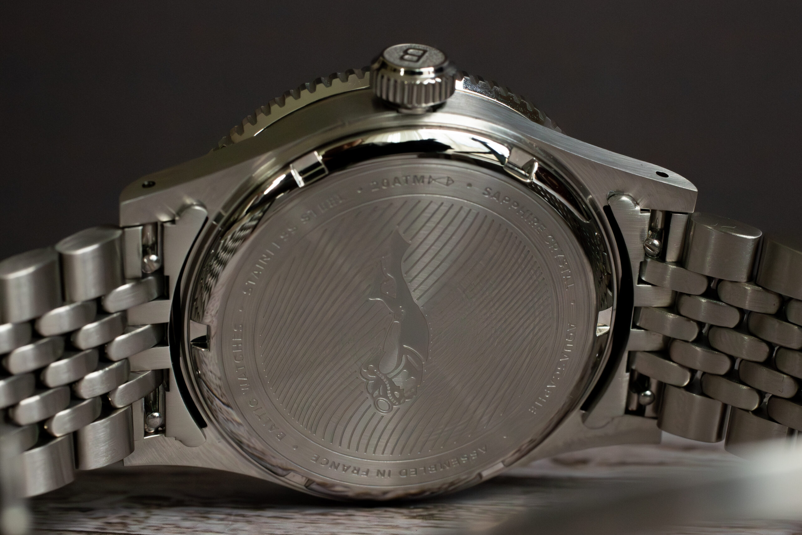 The gilt accents on hands and markers create sophisticated vintage character whilst maintaining optimal legibility essential for professional diving timing. The double dome sapphire crystal provides authentic vintage aesthetic whilst offering modern scratch resistance impossible with period-correct materials.