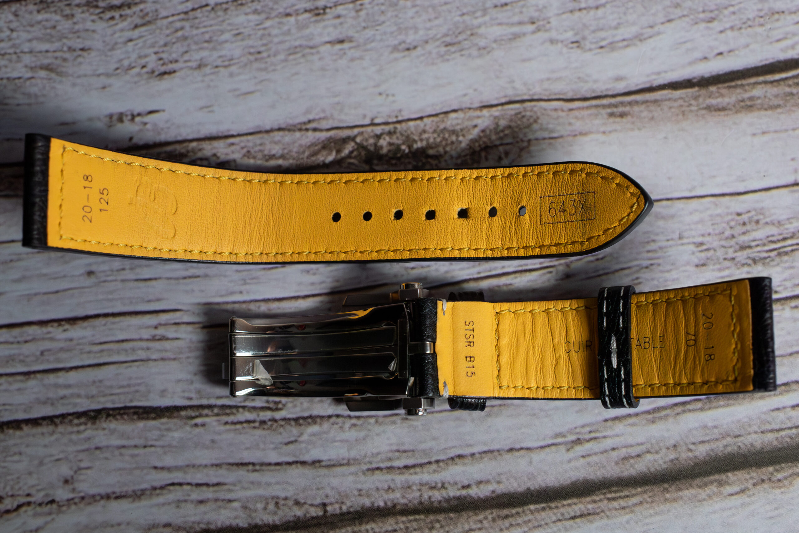 The Breitling Black Racing 20mm Calfskin Strap (Ref. 643X) captures 1960s motorsport heritage through vintage-inspired perforated leather construction that honours the experimental spirit of Willy Breitling’s original Top Time design. The distinctive racing holes create authentic period character whilst the premium calfskin leather provides comfort and durability appropriate for both automotive enthusiasm and daily luxury wear.