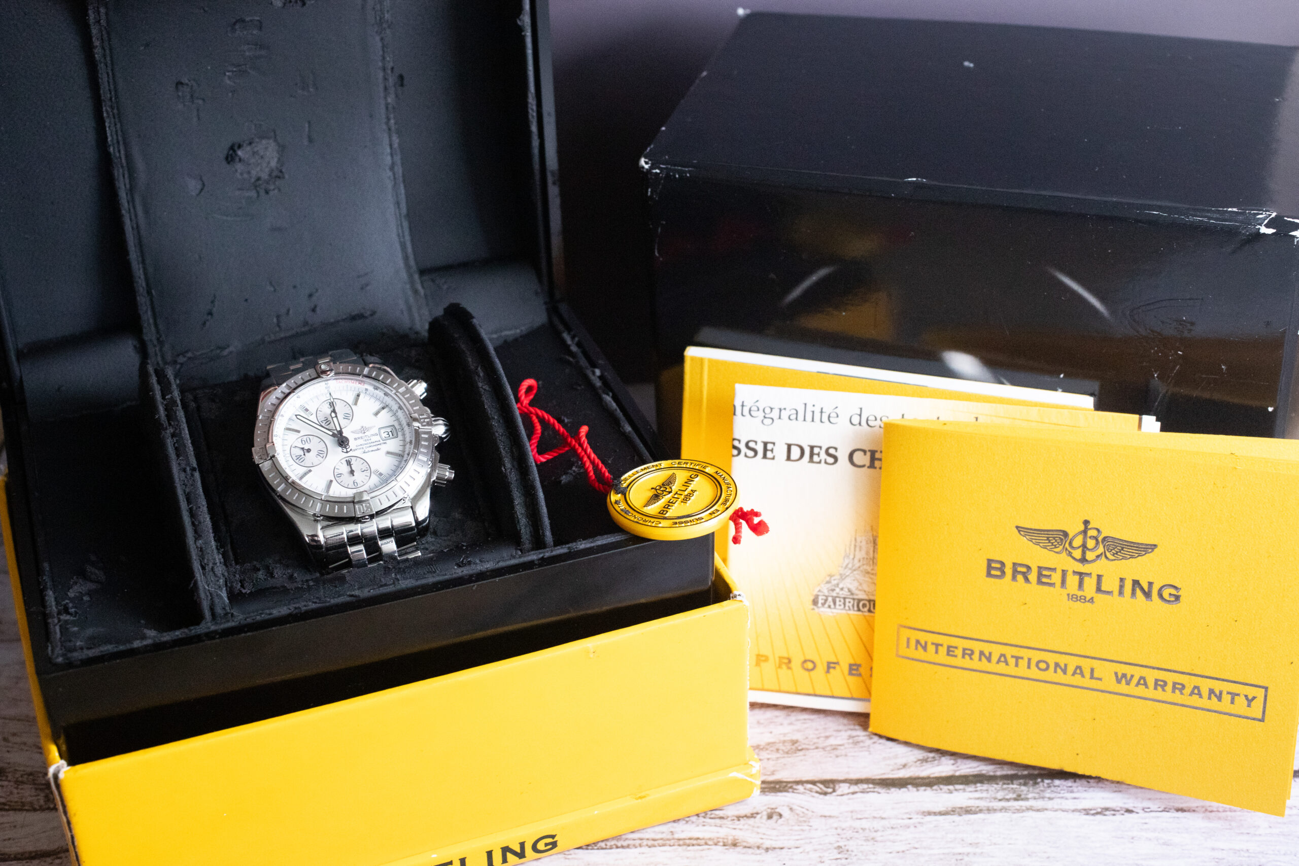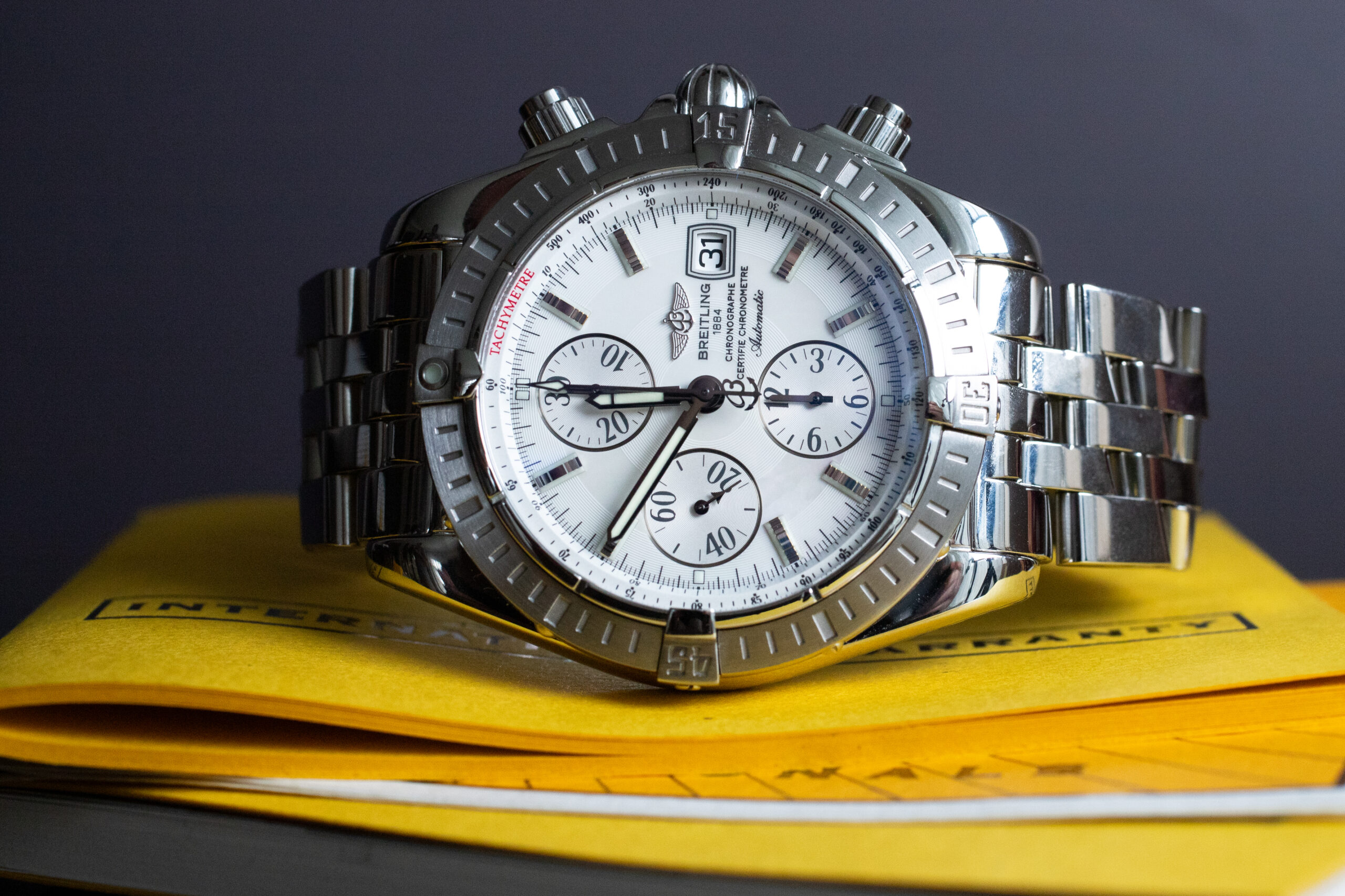 This 43.7mm stainless steel chronograph features the reliable Breitling 13 movement, delivering 42-hour power reserve and COSC chronometer certification that ensures precision timing worthy of professional aviation applications. The distinctive white mother of pearl dial with applied baton hour markers creates sophisticated contrast against the robust stainless steel construction, while the professional pilot bracelet provides secure attachment essential for demanding flight operations. The Chronomat Evolution demonstrates Breitling’s mastery of combining technical excellence with luxury materials, creating timepieces that honour the brand’s authentic aviation heritage while serving contemporary pilot requirements and luxury watch expectations with equal distinction and uncompromising reliability.