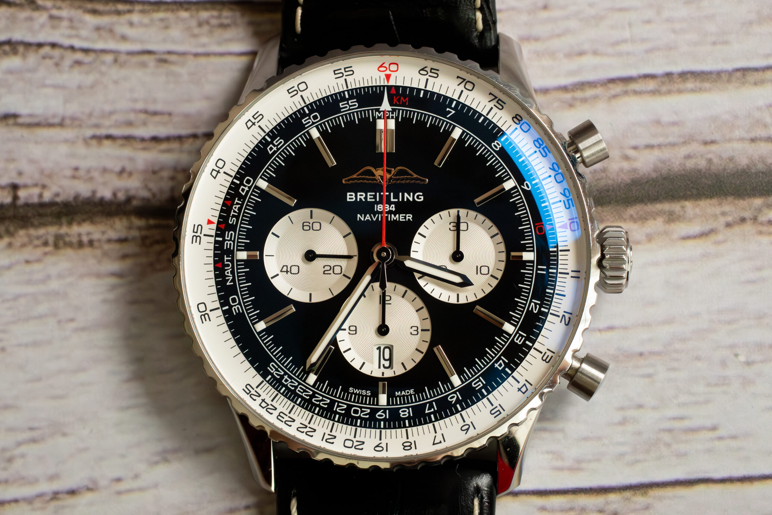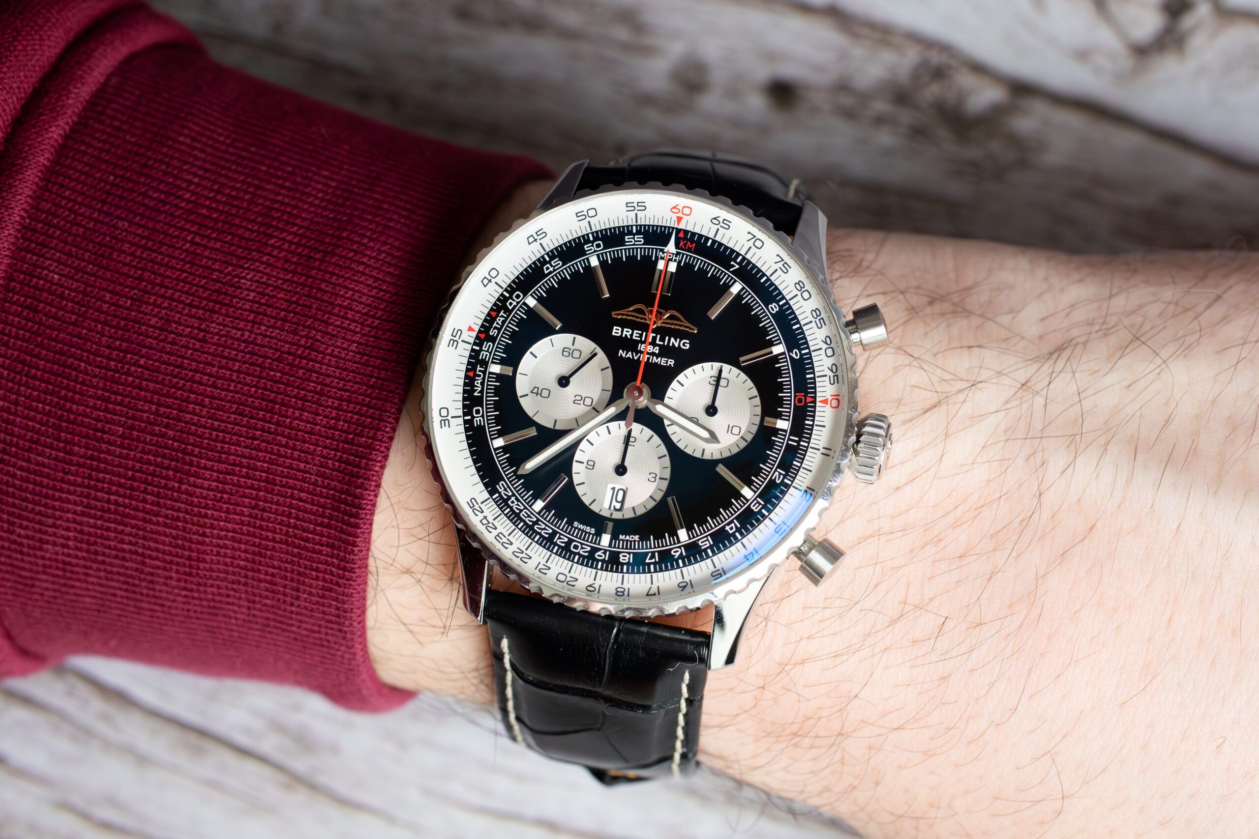 At 46mm with substantial construction, this provides commanding pilot’s watch presence through flattened slide rule and domed crystal creating sleeker profile illusion whilst maintaining authentic aviation calculation capability. The alternating polished and brushed metal elements create lustrous yet understated finish whilst the bidirectional slide rule enables complex flight computations including fuel consumption and navigation calculations.
