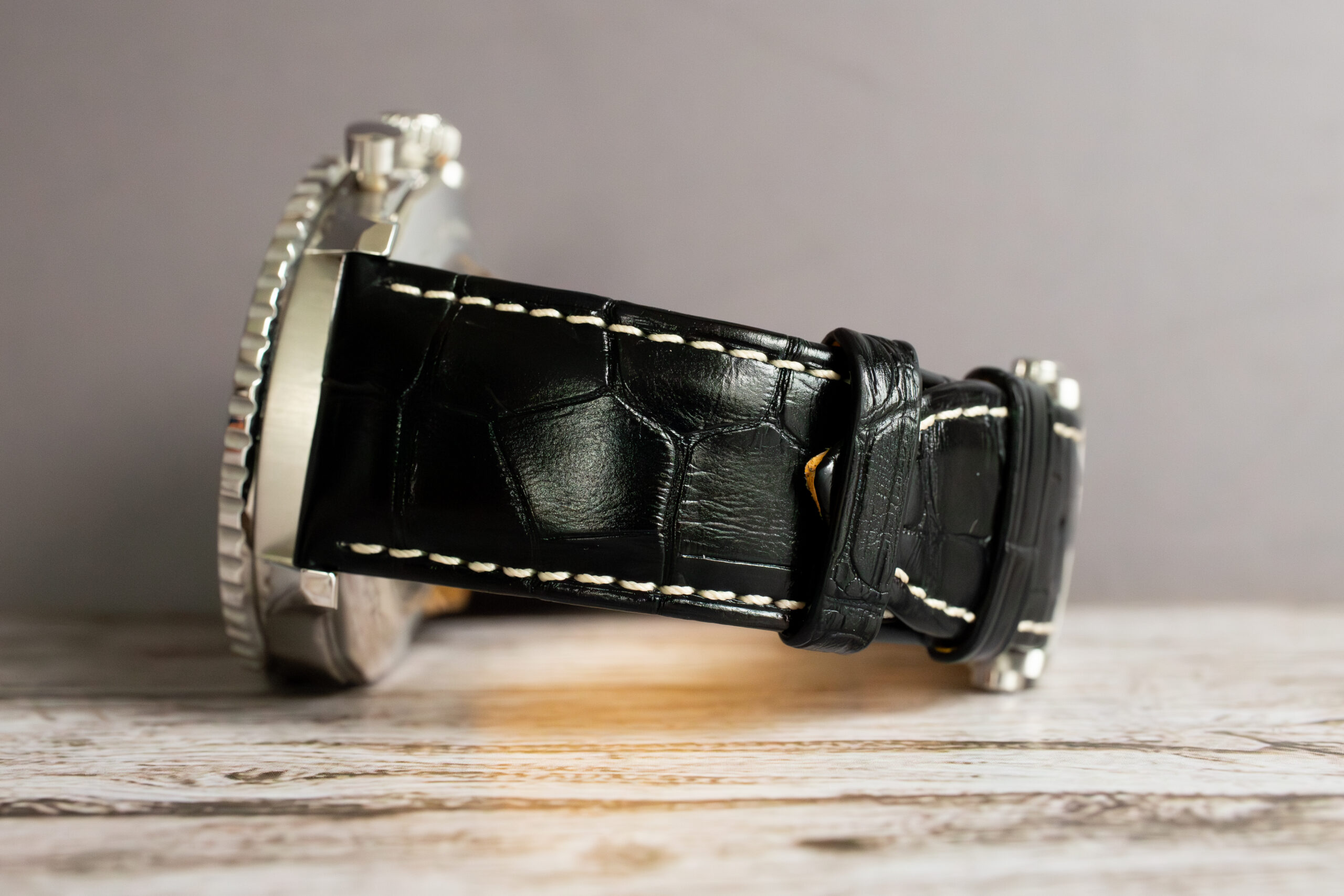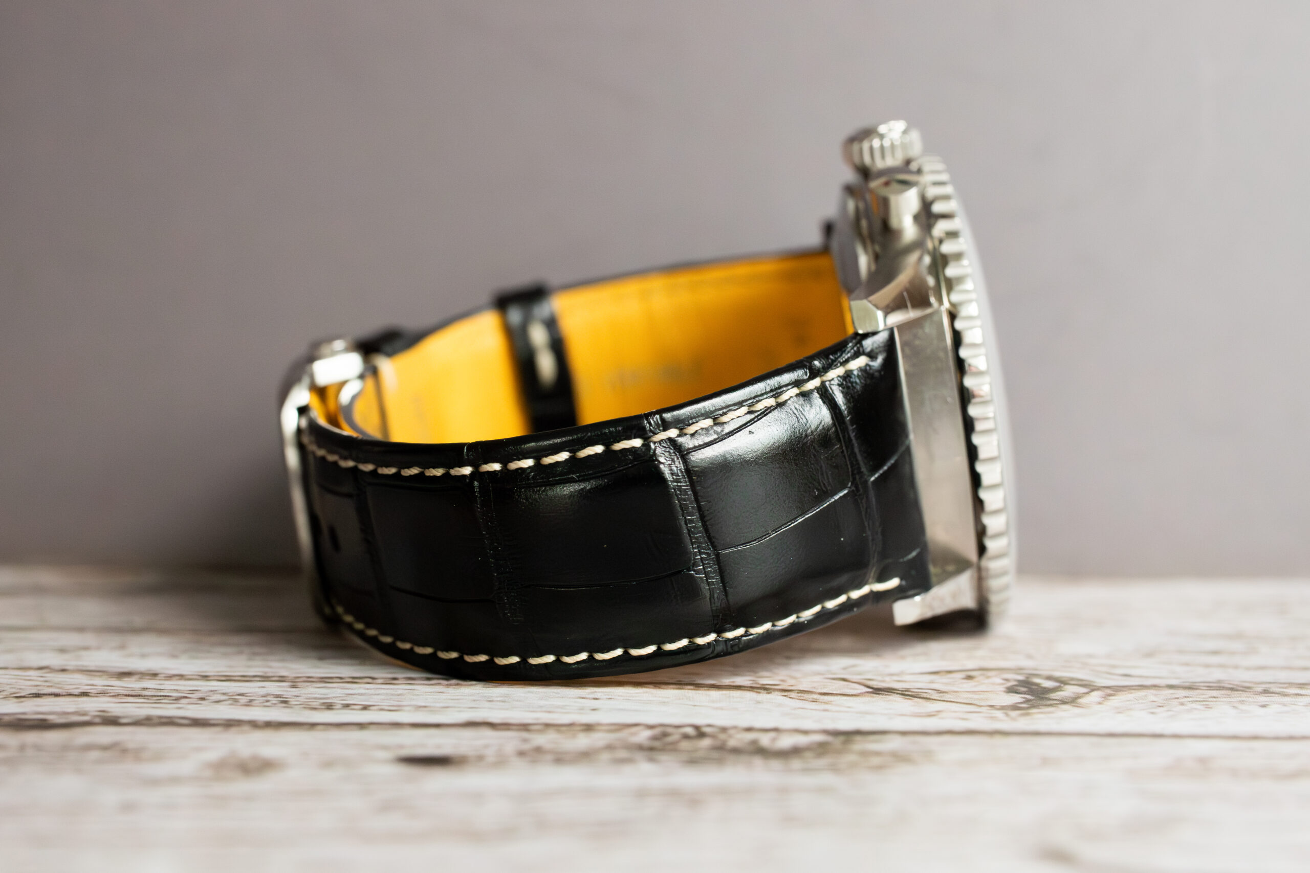 The return of AOPA wings to original 12 o’clock position creates nostalgic authenticity whilst the cambered sapphire crystal and alternating finishes demonstrate modern refinements. The black alligator leather strap with folding clasp provides sophisticated presentation.