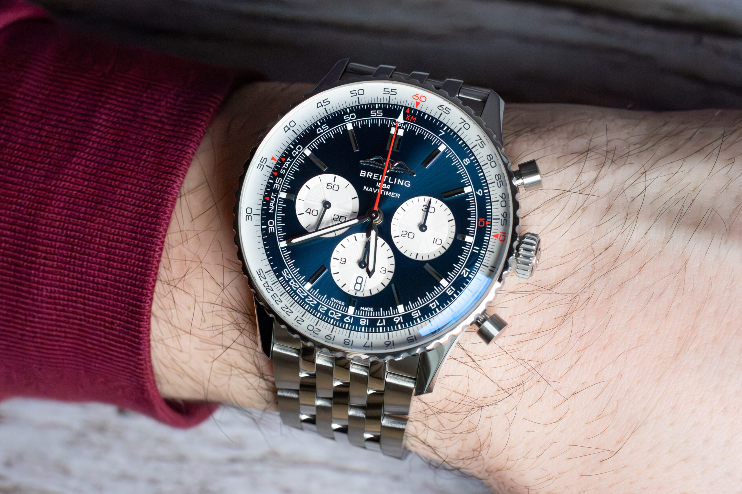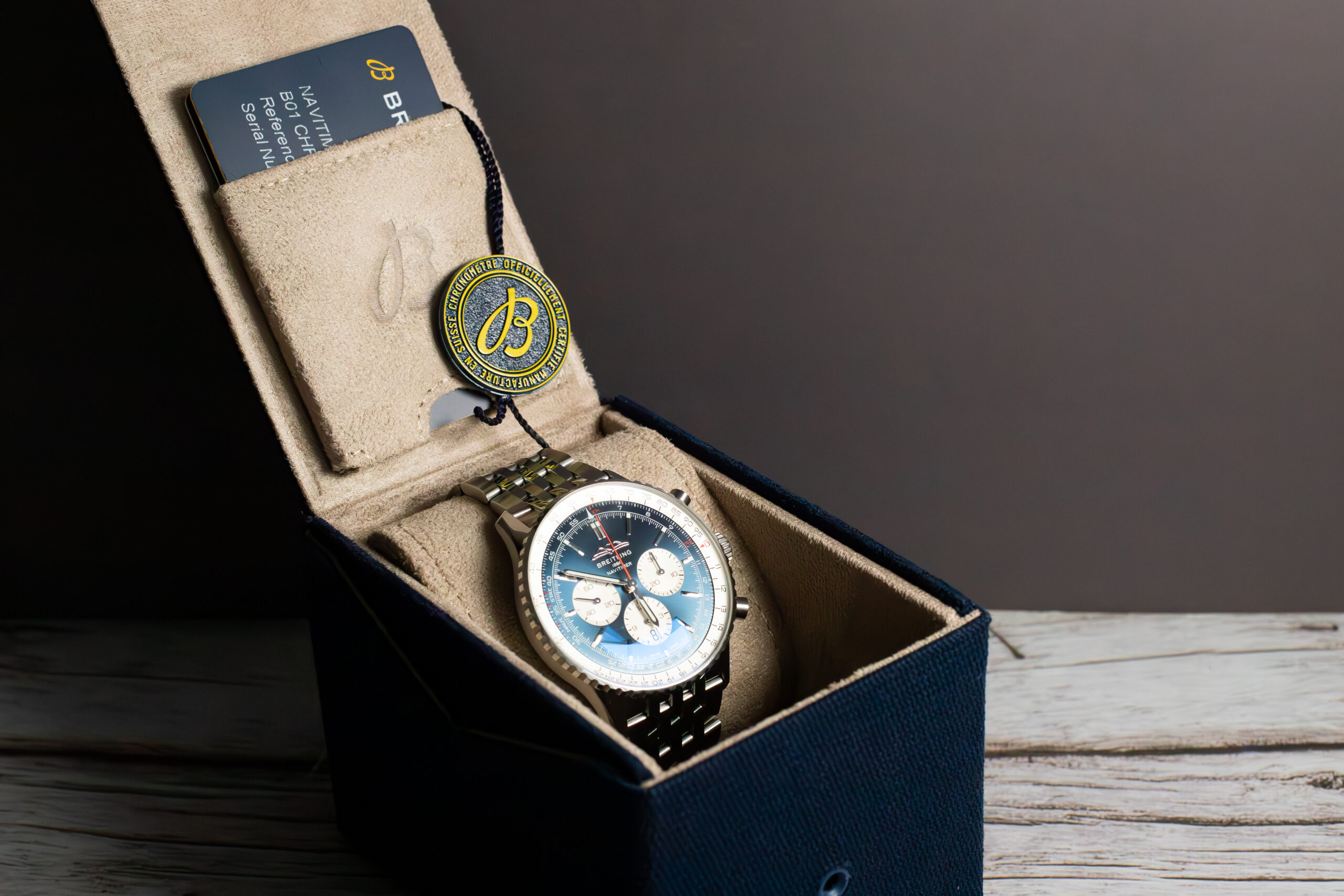 This Navitimer B01 suits professional pilots and aviation enthusiasts seeking authentic flight instrument capability with luxury chronograph sophistication. The slide rule functionality provides genuine operational capability rather than decorative aviation imagery whilst the substantial 46mm sizing and blue dial create distinctive character that honours seven decades of professional pilot timekeeping heritage.
