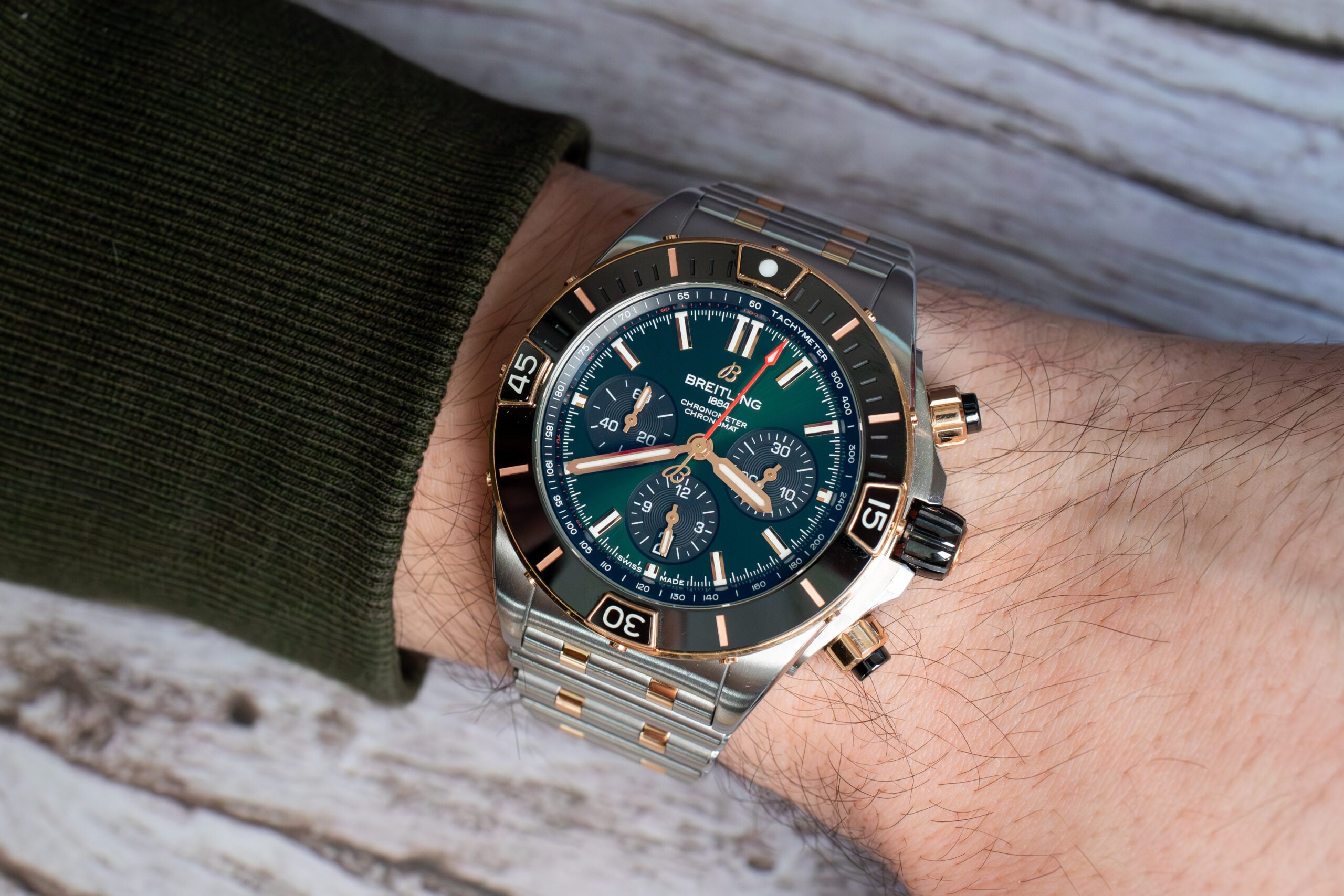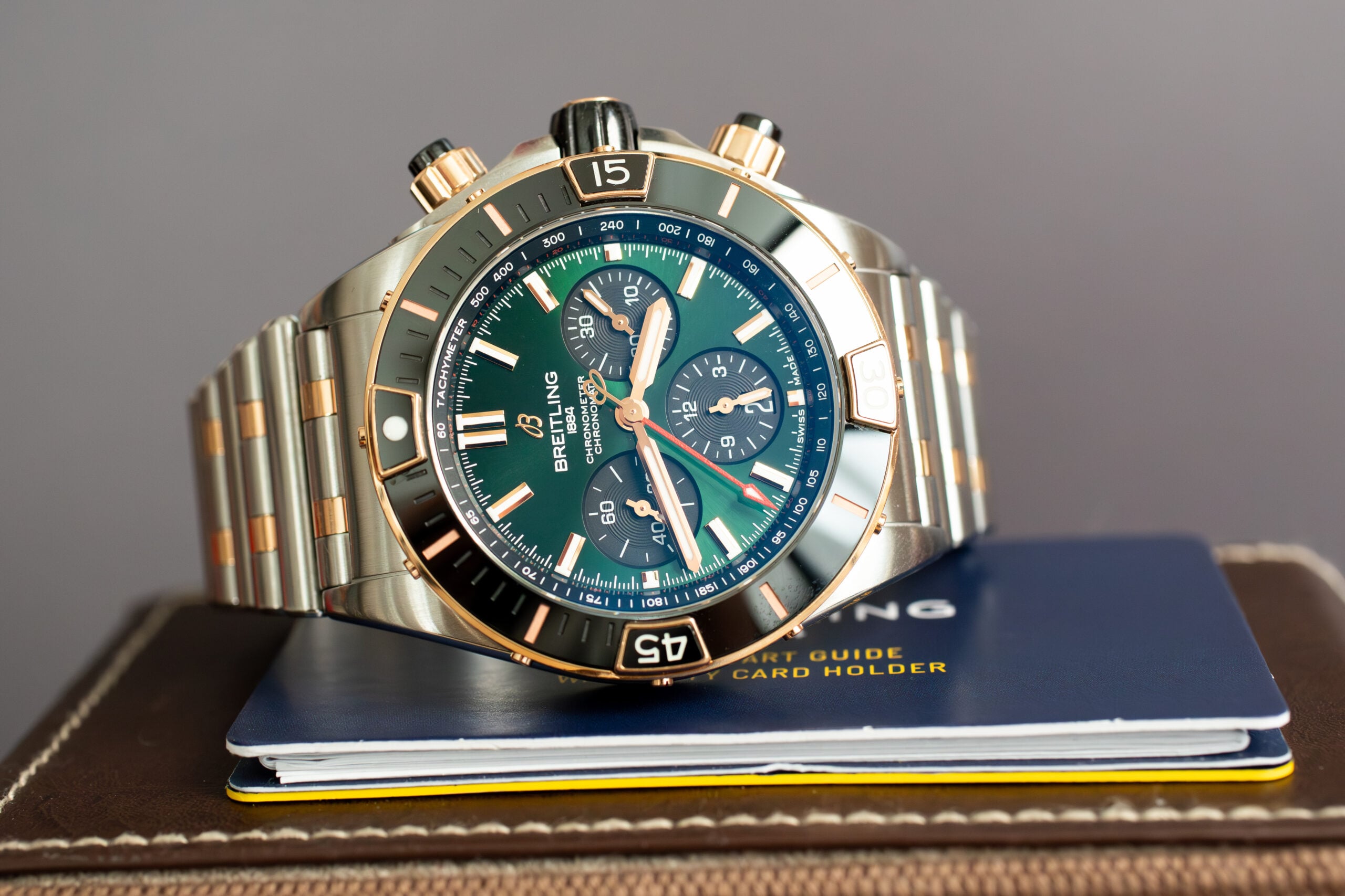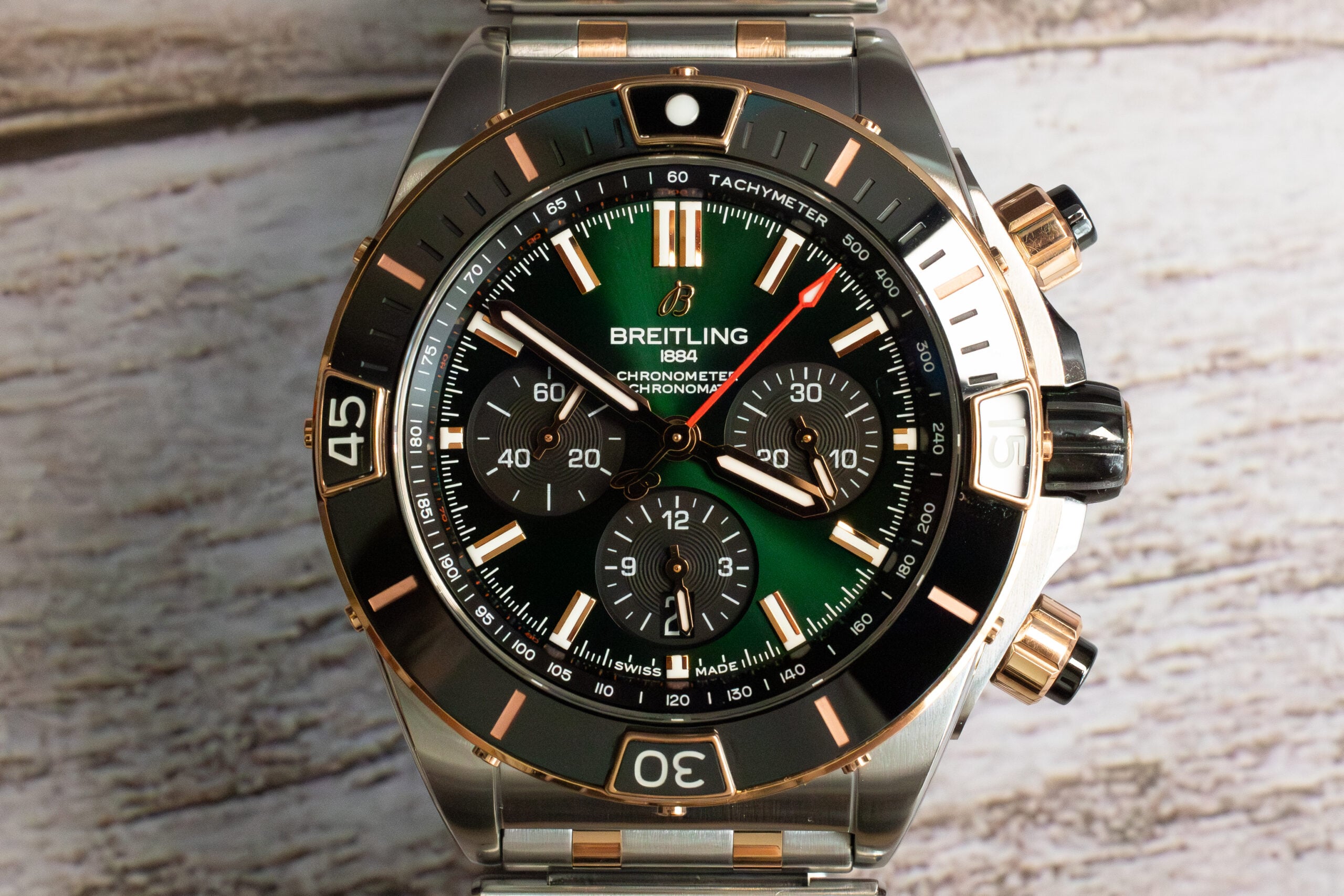 The Breitling Super Chronomat B01 44mm (Ref. UB0136251L1U1) represents the boldest evolution of Breitling’s supercharged chronograph inspired by the original 1980s Chronomat created for aerobatic squadron hotshots. The stainless steel and 18k red gold construction with ceramic inserts on bezel, chronograph pushers, and crown creates distinctive luxury sport aesthetic whilst the Manufacture Calibre B01 delivers proven chronograph performance.