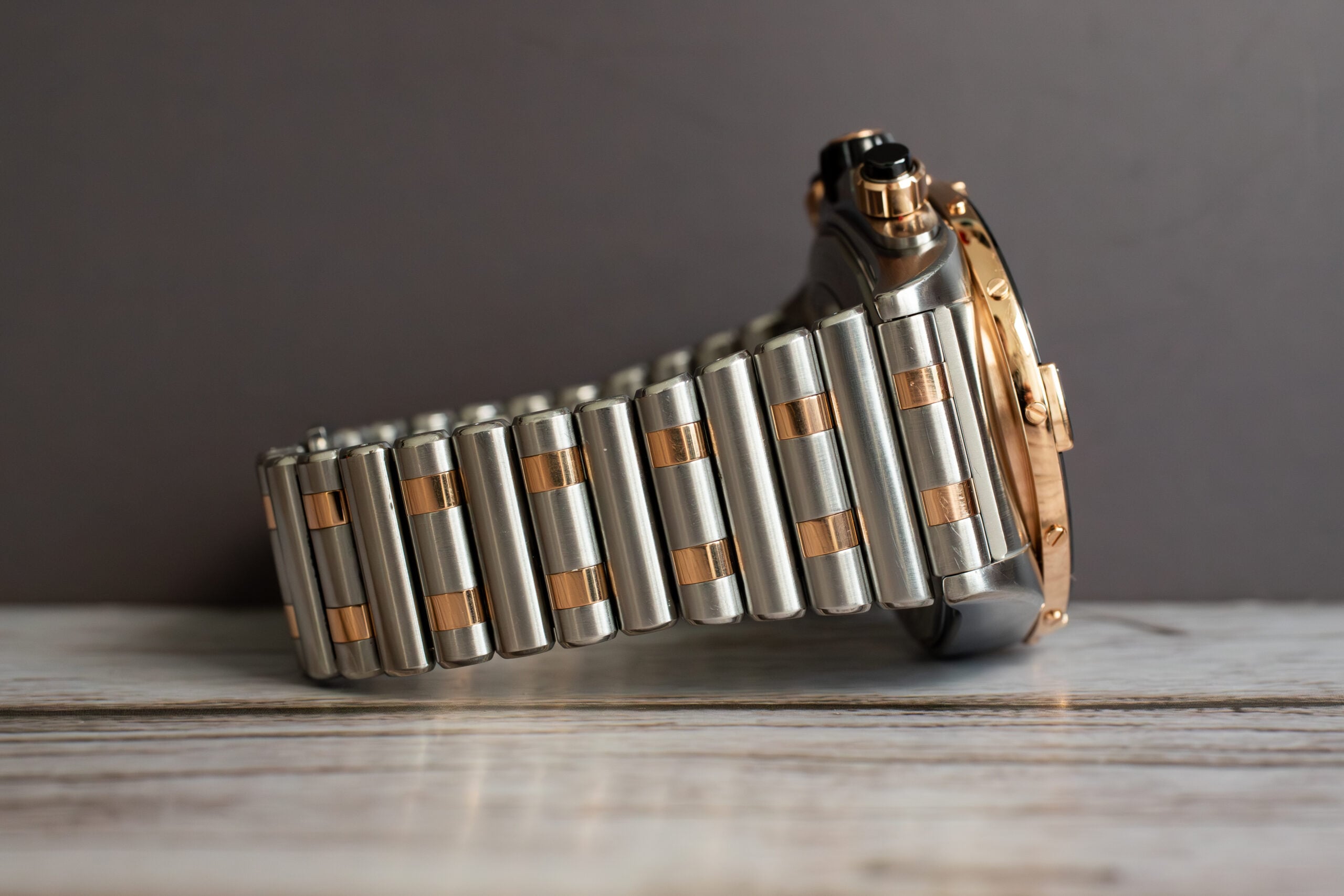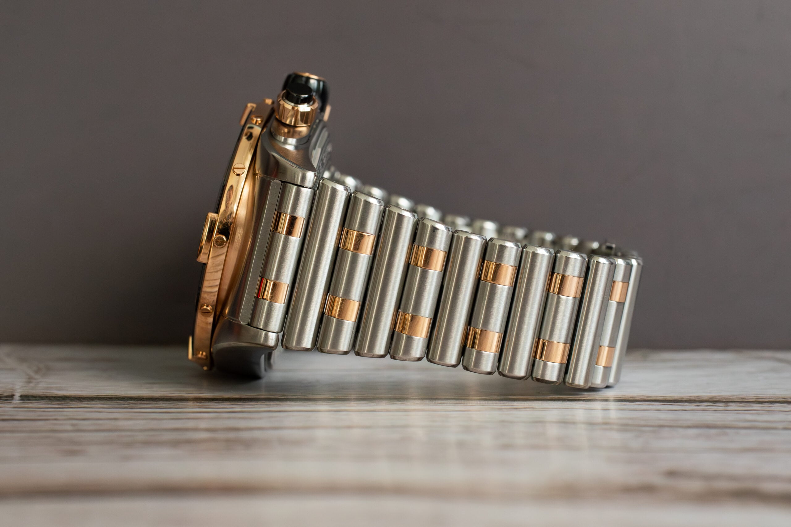 At 44mm with 14.45mm thickness, this provides commanding presence through two-tone construction whilst the unidirectional ratcheted rotating bezel with ceramic elements ensures durability and precise timing functionality. The 18k red gold accents create warm contrast against stainless steel whilst the ceramic components offer superior scratch resistance and luxury appeal.