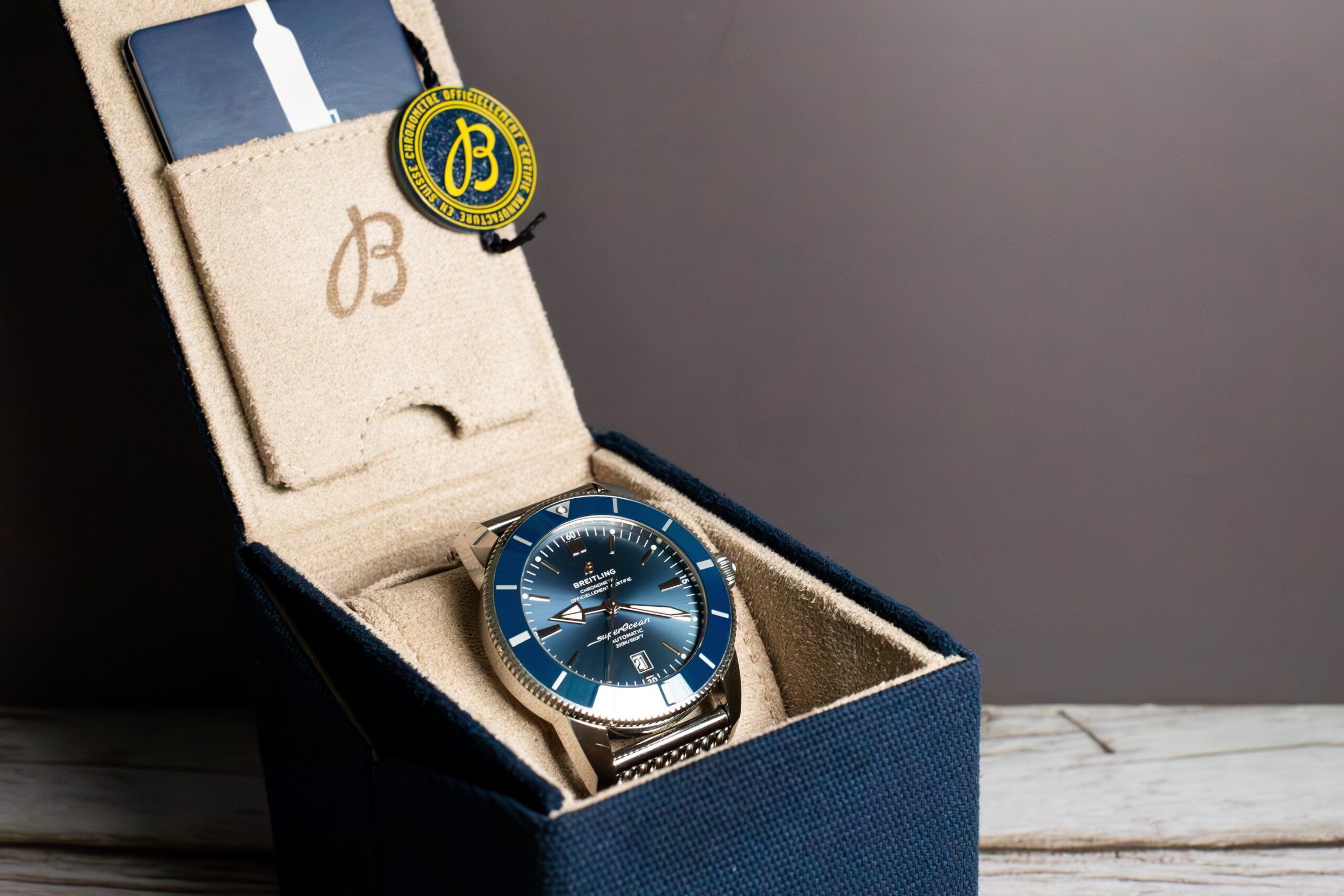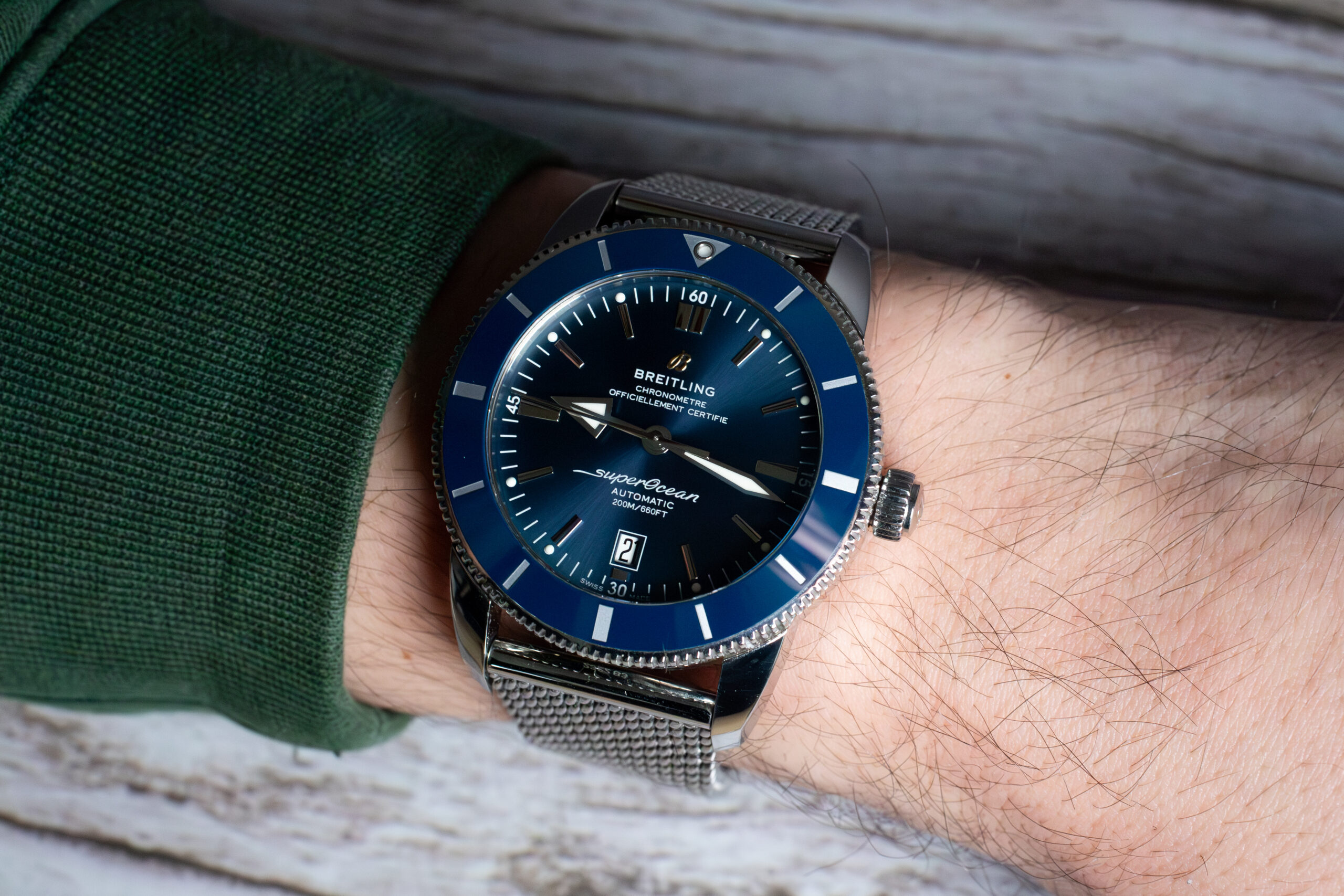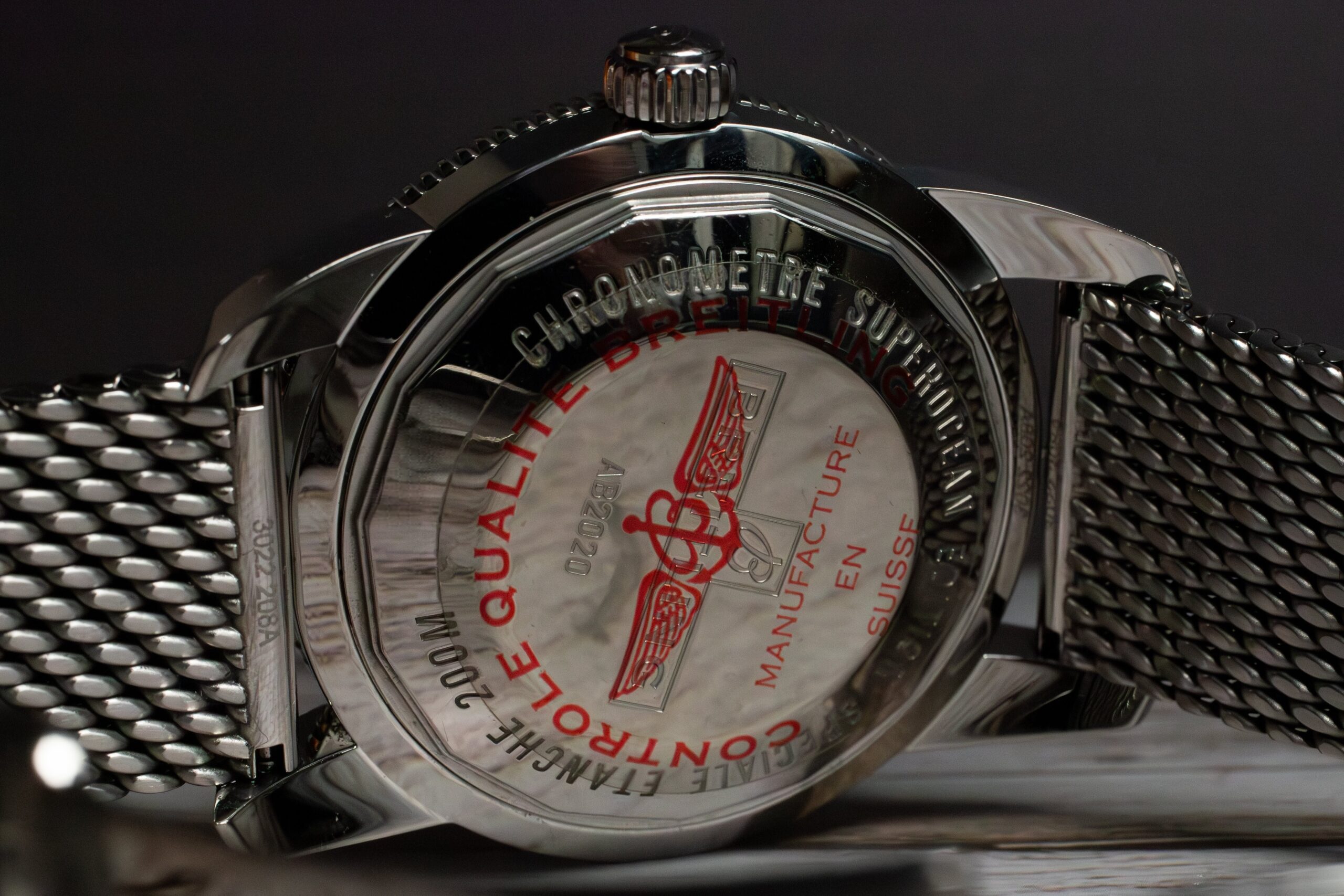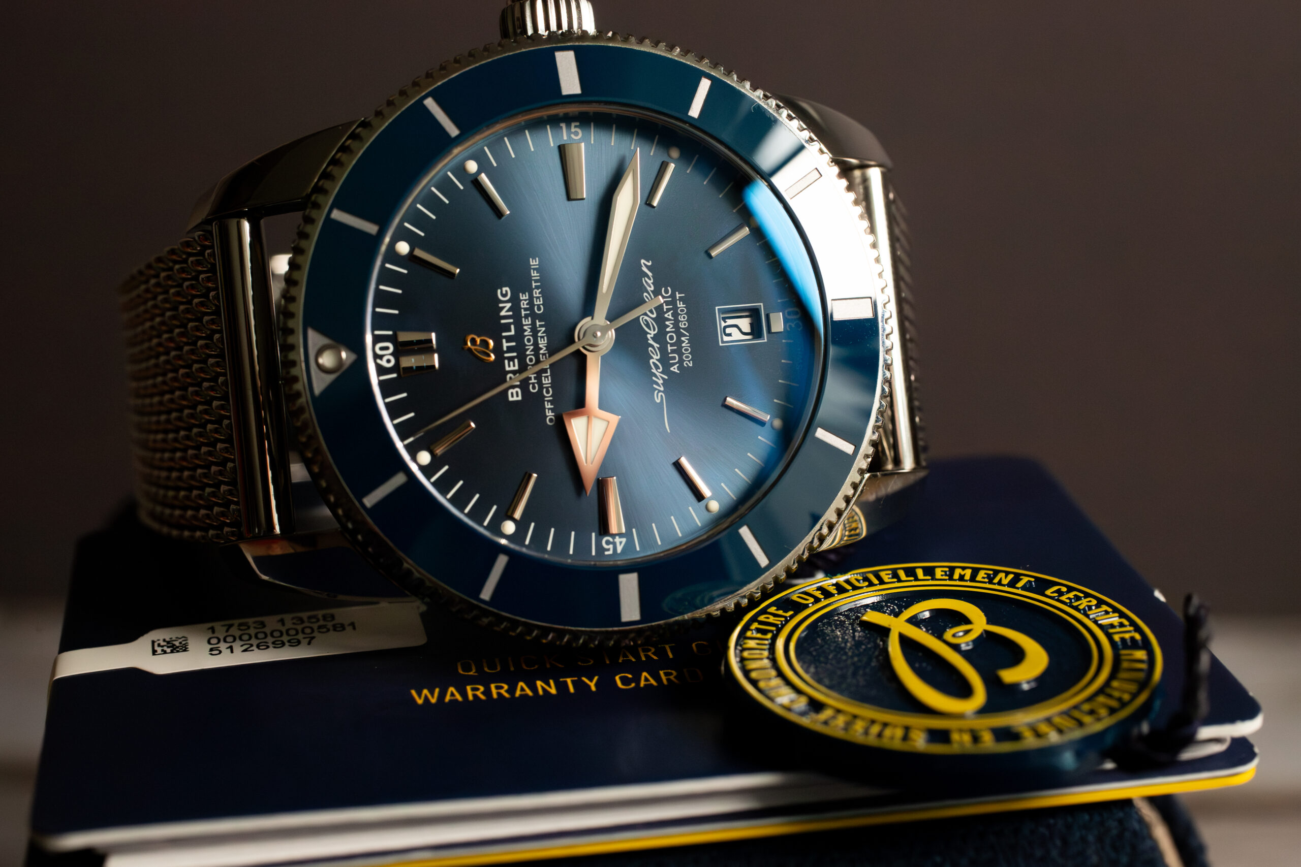 At 46mm with 14.99mm thickness, this provides commanding presence appropriate for serious diving applications whilst the mesh bracelet ensures comfortable wear during extended underwater operations. The substantial sizing reflects the original Superocean’s tool watch proportions, offering optimal legibility and robust construction essential for professional diving environments.
