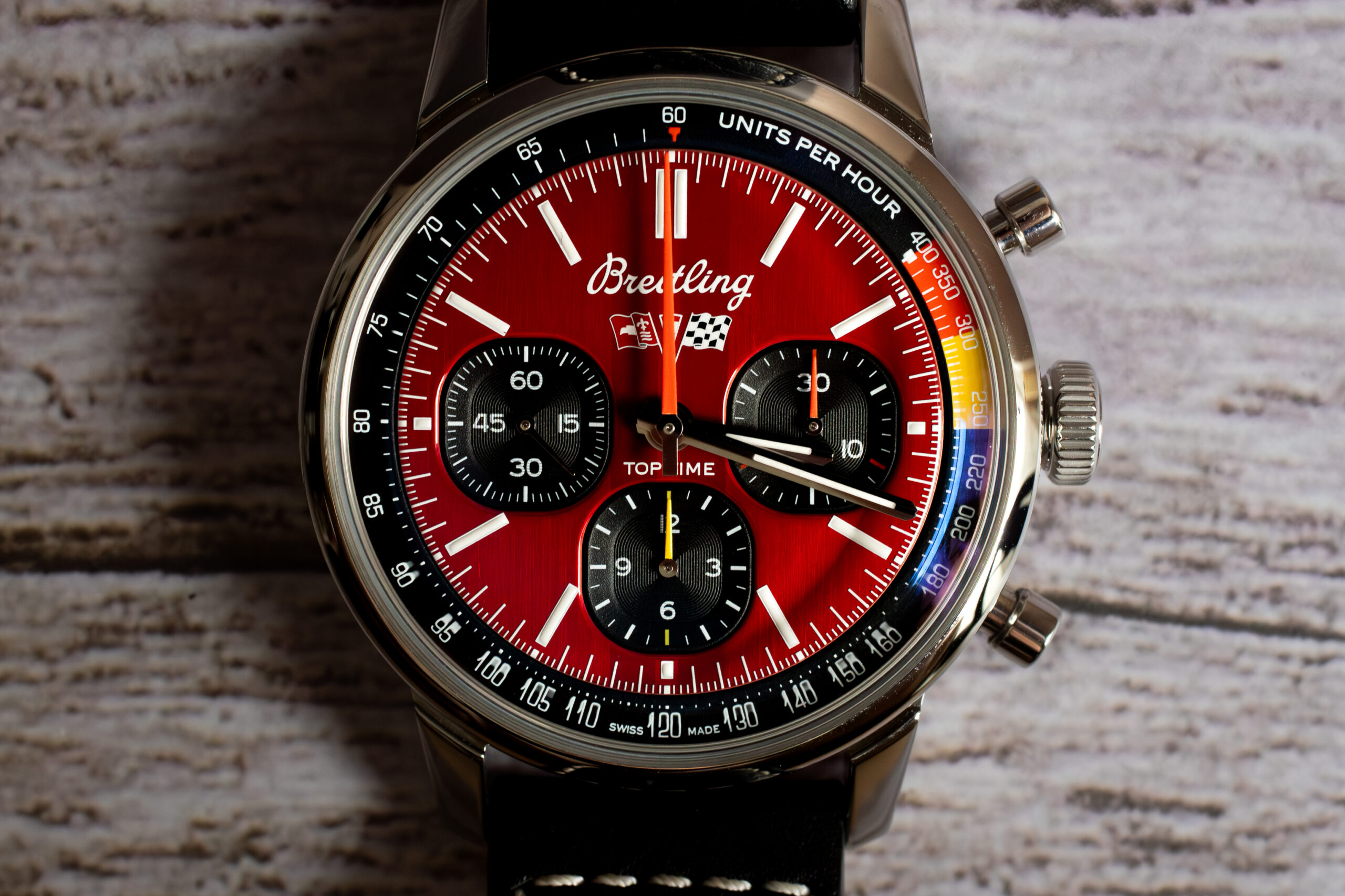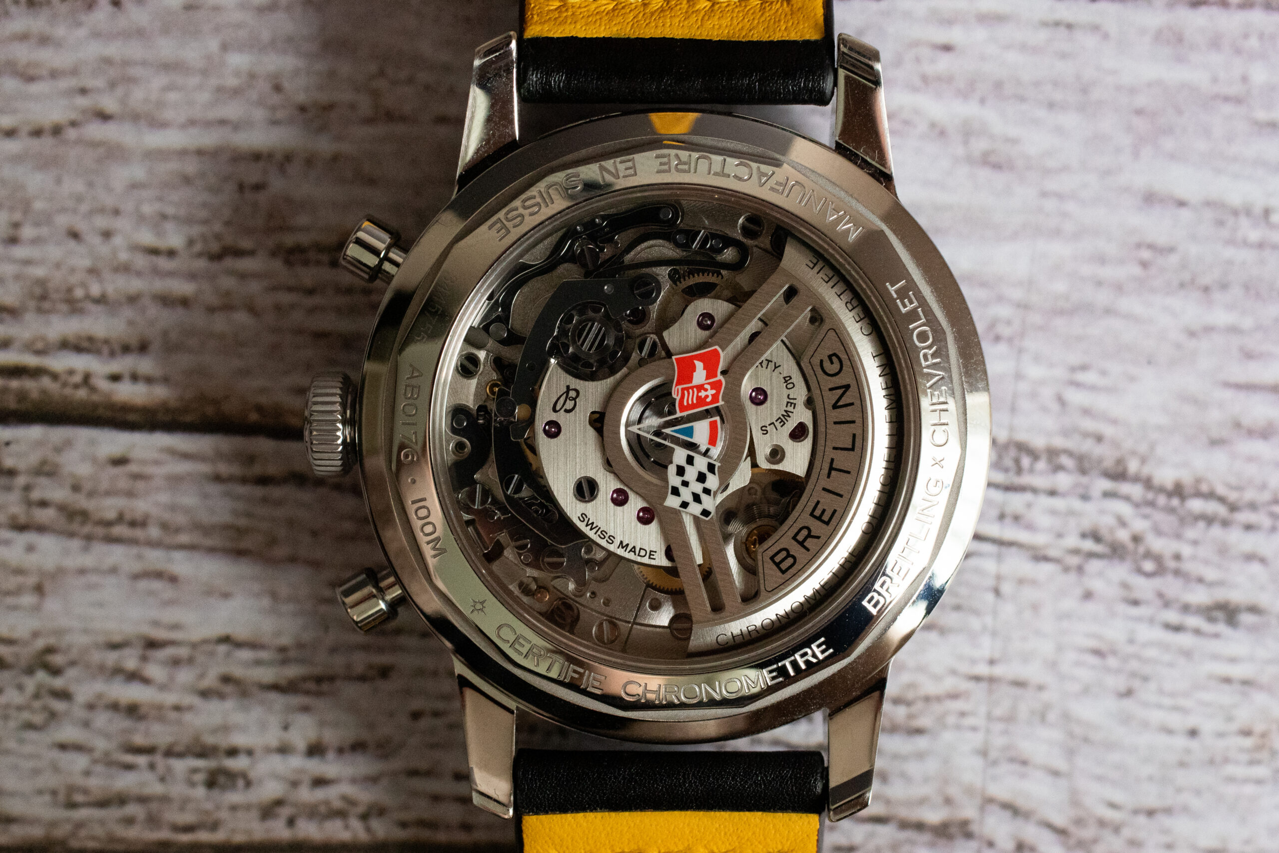 The subdial design demonstrates Breitling’s commitment to functional innovation rather than superficial styling, ensuring the automotive inspiration enhances rather than compromises chronograph performance. The unique shape creates immediate visual identification of the watch’s Corvette heritage while providing practical advantages for timing applications. For collectors who appreciate distinctive design solutions and automotive enthusiasts seeking genuine connection to Corvette aesthetics, the “squircle” subdials provide compelling blend of innovative functionality and authentic automotive heritage that distinguishes this timepiece from conventional chronograph alternatives.