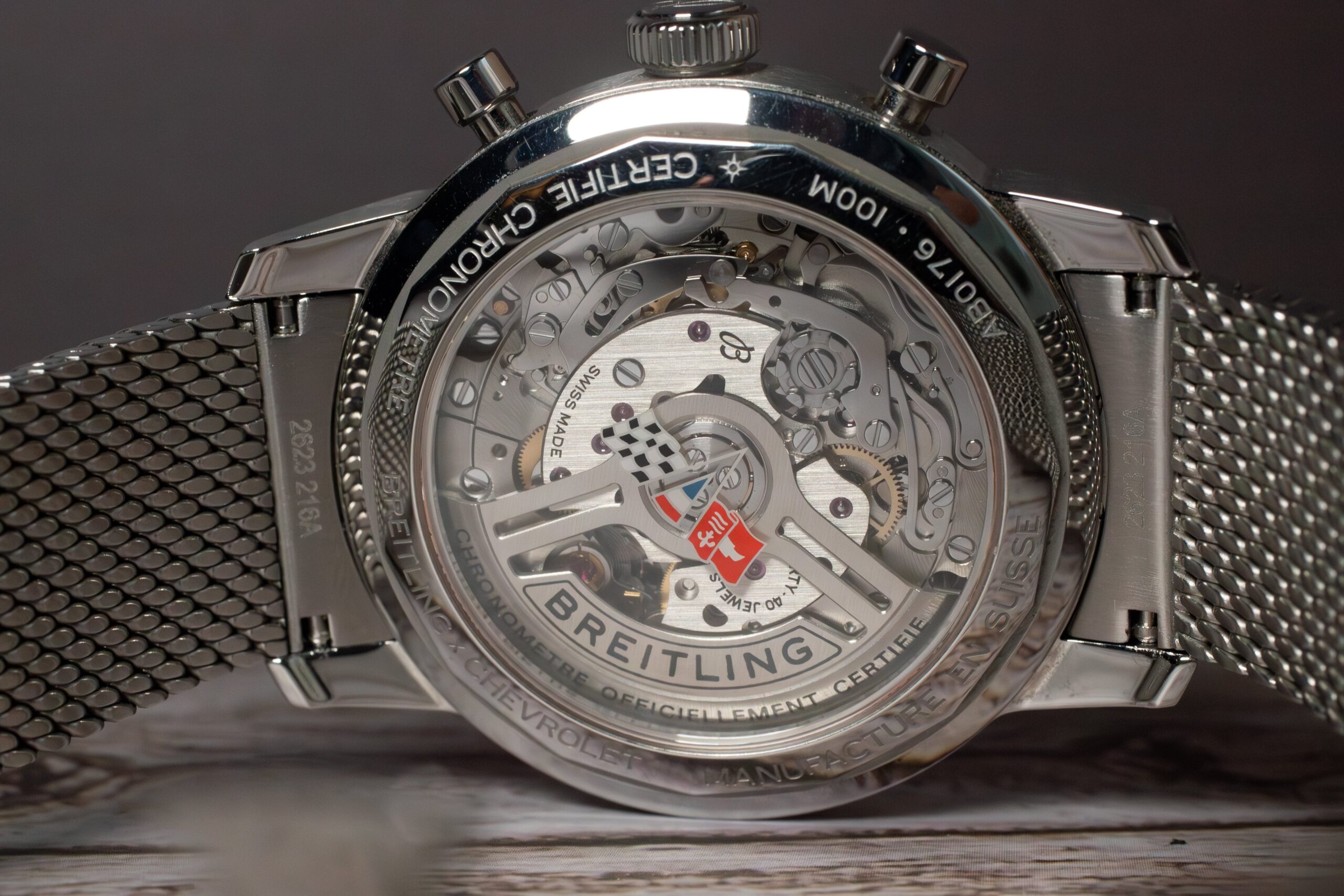 Breitling’s flagship Manufacture Calibre B01 delivers 70-hour power reserve with COSC chronometer certification and column wheel construction. This provides the smooth chronograph operation and weekend-proof reliability expected from a serious timing instrument. The 1/4 second precision and proper 30-minute/12-hour totalisers make this genuinely useful for motorsport timing.