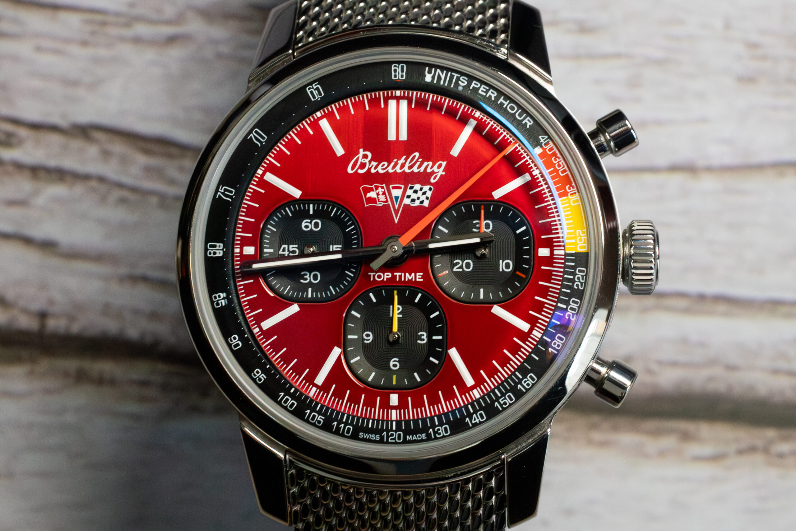 The Breitling Top Time B01 Chevrolet Corvette (Ref. A25310121B1X1) captures genuine automotive heritage through thoughtful design rather than superficial branding. The “squircle” subdials reference vintage dashboard gauges from the 1963-1967 Corvette Sting Ray, whilst the perforated leather strap and official Chevrolet colours create authentic motorsport connection without feeling gimmicky.