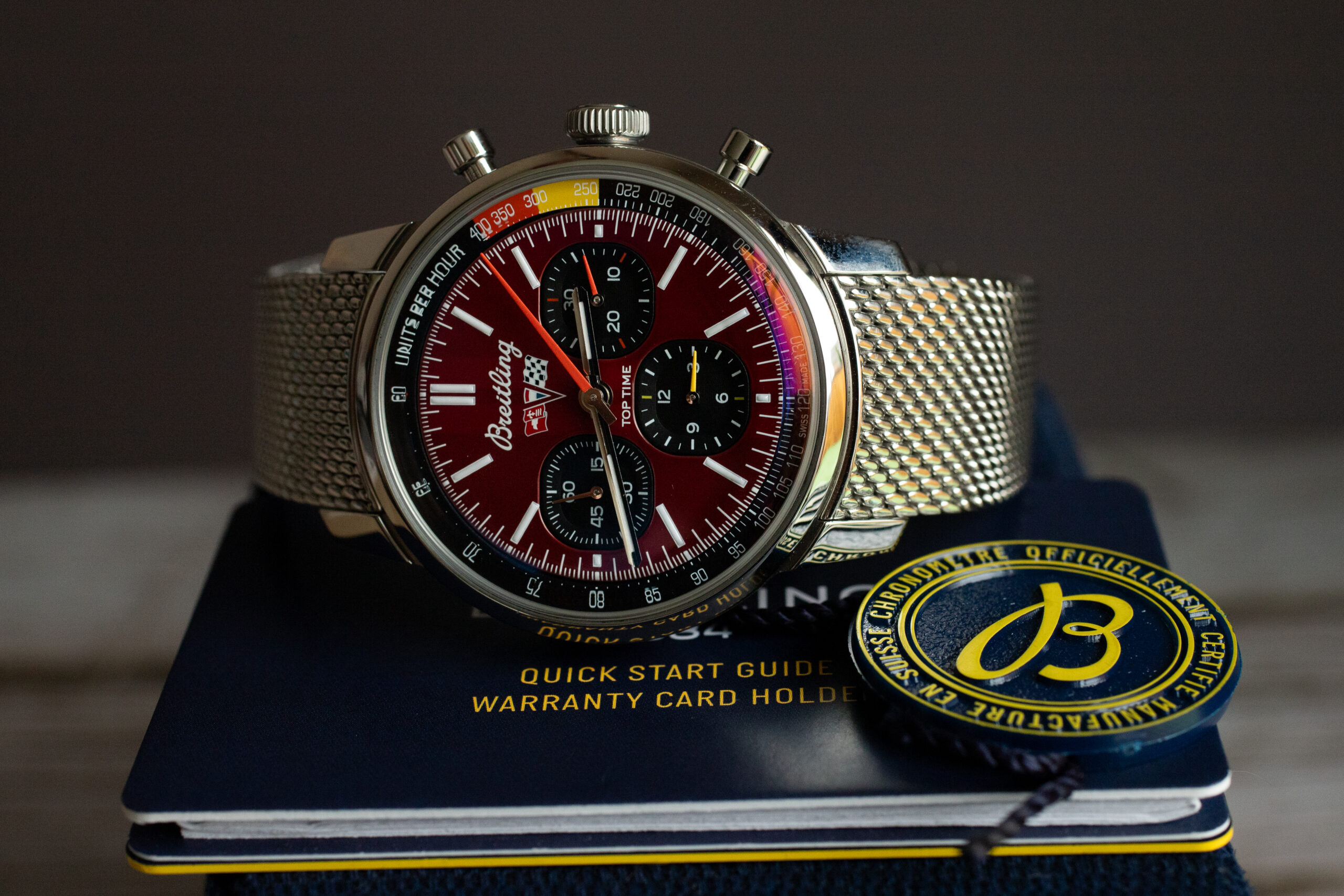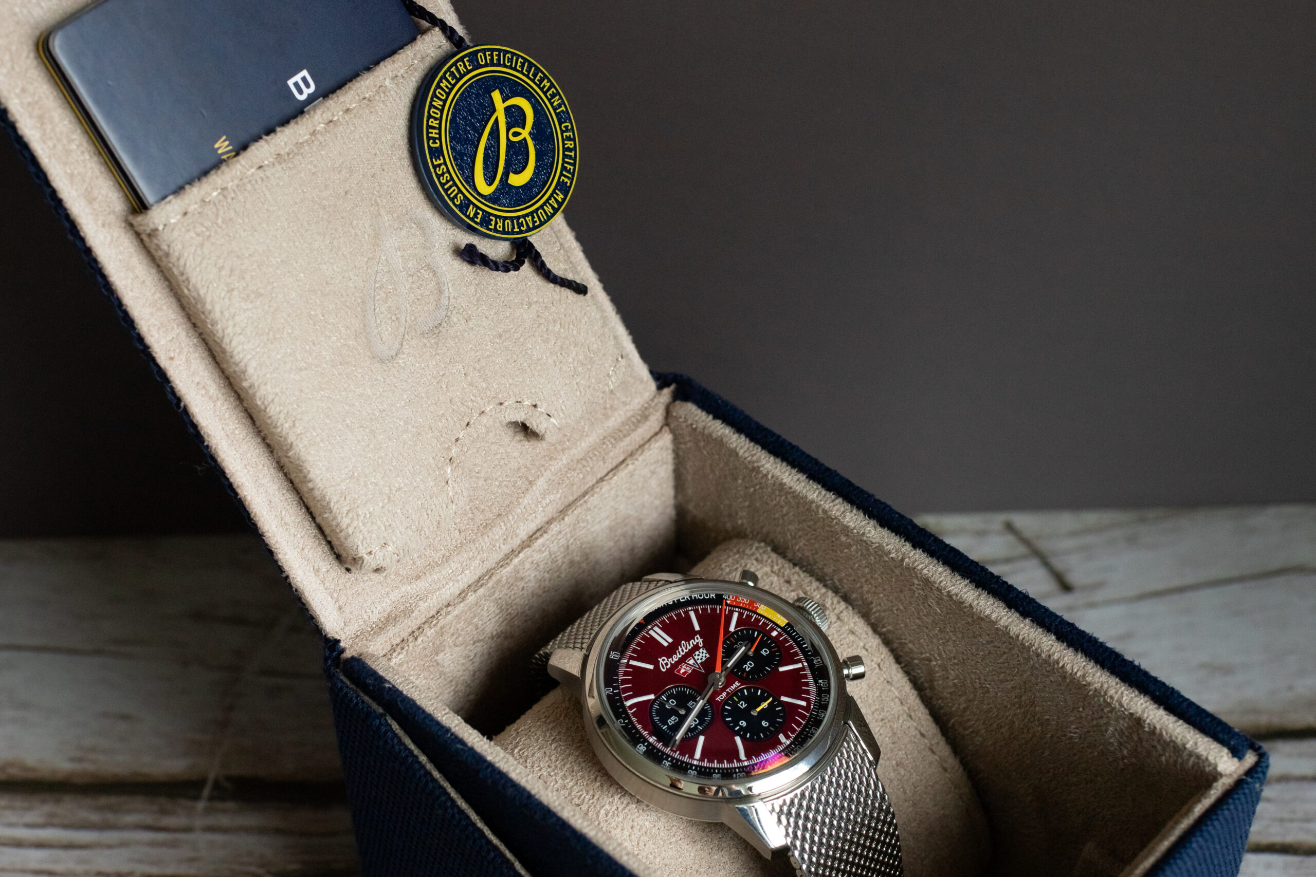 Beyond their aesthetic appeal, the unusual shape helps differentiate the Top Time from conventional chronographs, highlighting Breitling’s willingness to experiment with traditional watch design elements. The contrasting colour treatment of these subdials enhances legibility while reinforcing the automotive connection through their gauge-like appearance. This thoughtful design choice exemplifies how the Top Time Corvette transcends being merely a timepiece with a car logo, instead creating a genuine dialogue between automotive and horological design languages.