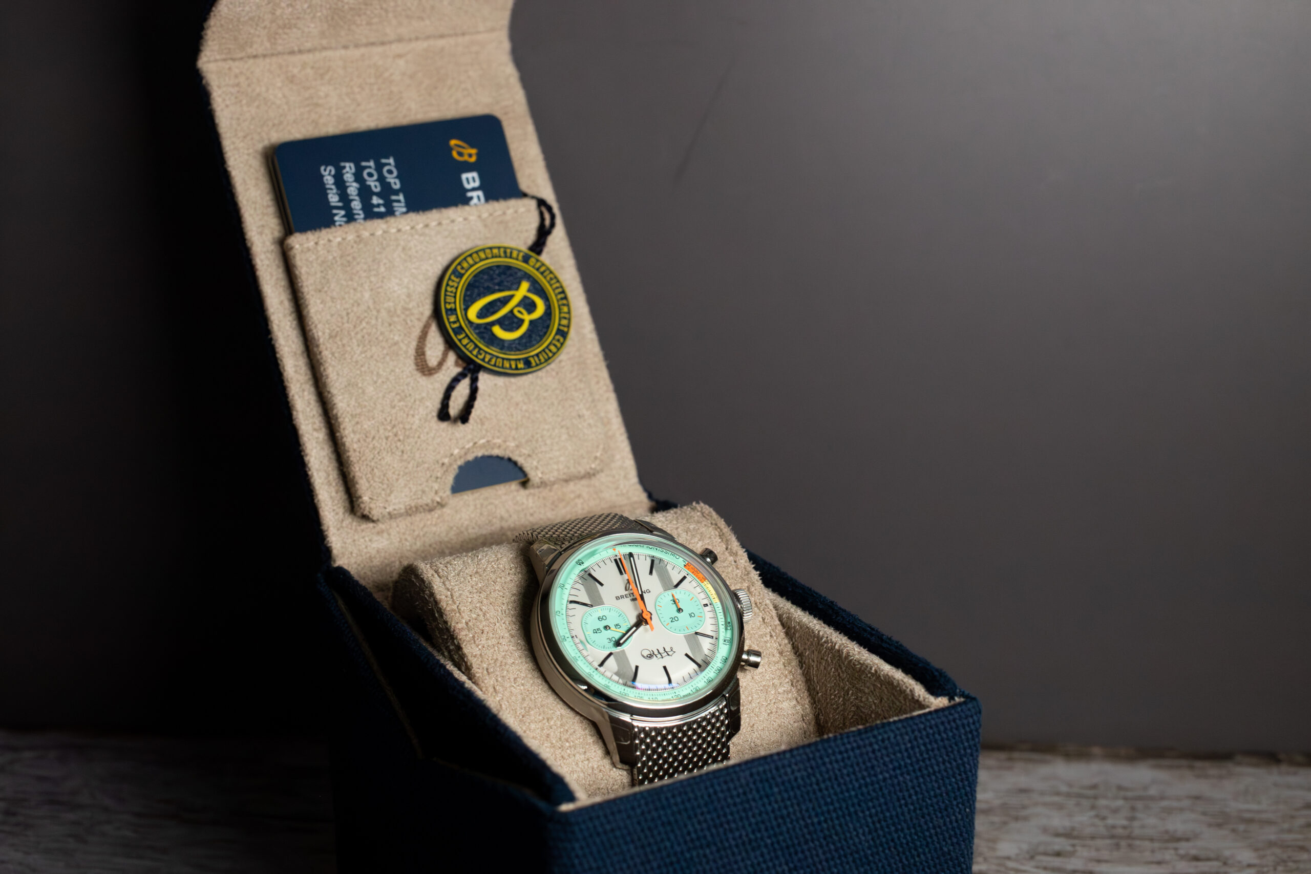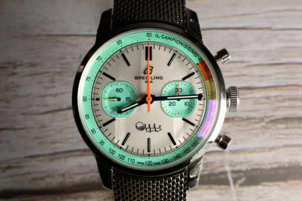The Breitling Top Time B01 Fausto Coppi (Ref. AB01768A1A1A1) celebrates cycling legend Fausto Coppi through authentic design elements that reference his distinctive bicycle colours rather than superficial sporting imagery. Limited to 750 pieces worldwide, the turquoise subdials and orange lightning-bolt seconds hand directly connect to “Il Campionissimo’s” legendary racing machine that dominated post-war European cycling.