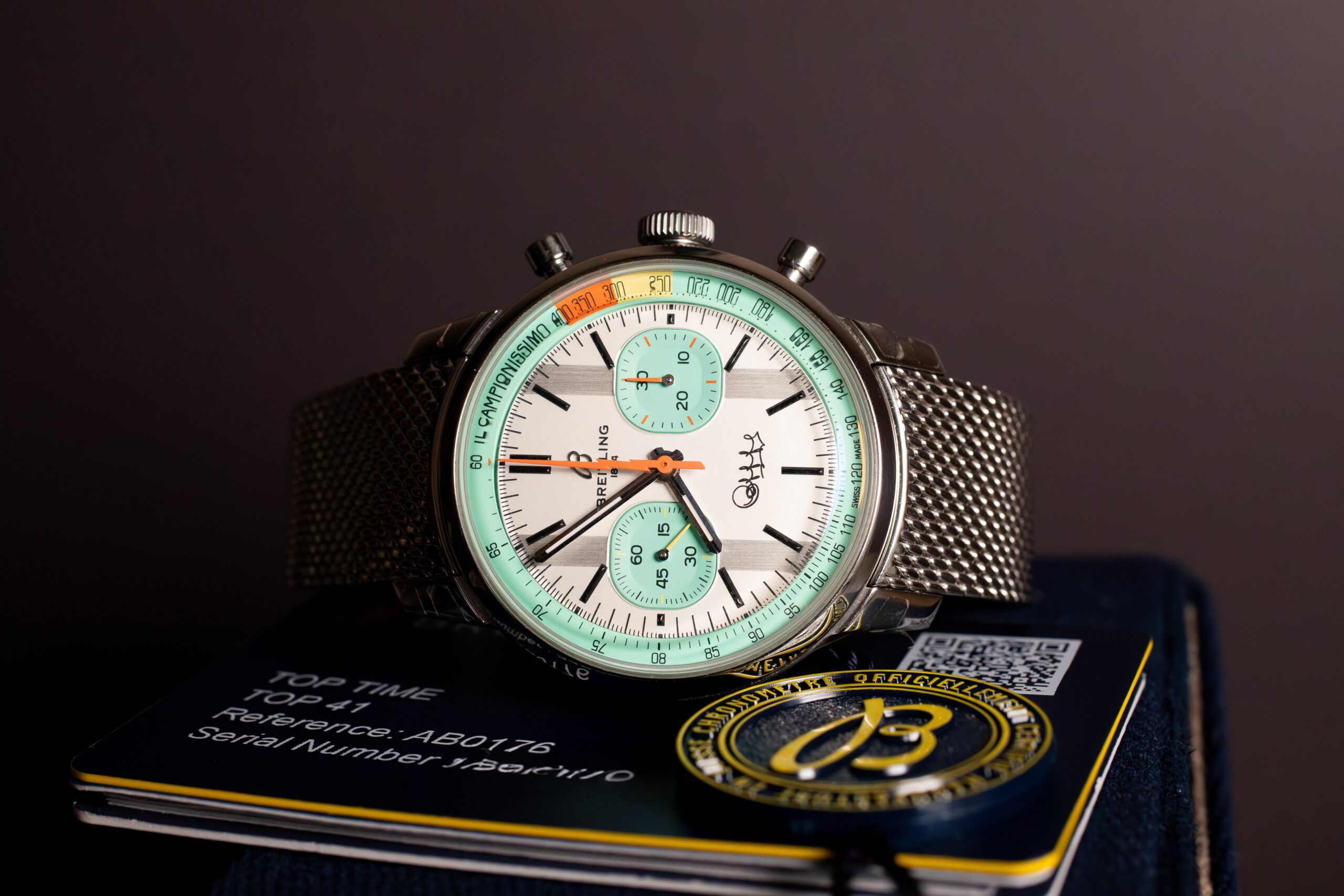 At 41mm with robust stainless steel construction, this provides substantial presence appropriate for sporting applications whilst maintaining the refined finishing expected from luxury chronographs. The crisp white dial with bold colour accents creates immediate visual impact, whilst Coppi’s signature at 6 o’clock and “Il Campionissimo” inscription within the tachymeter scale provide authentic heritage connection.