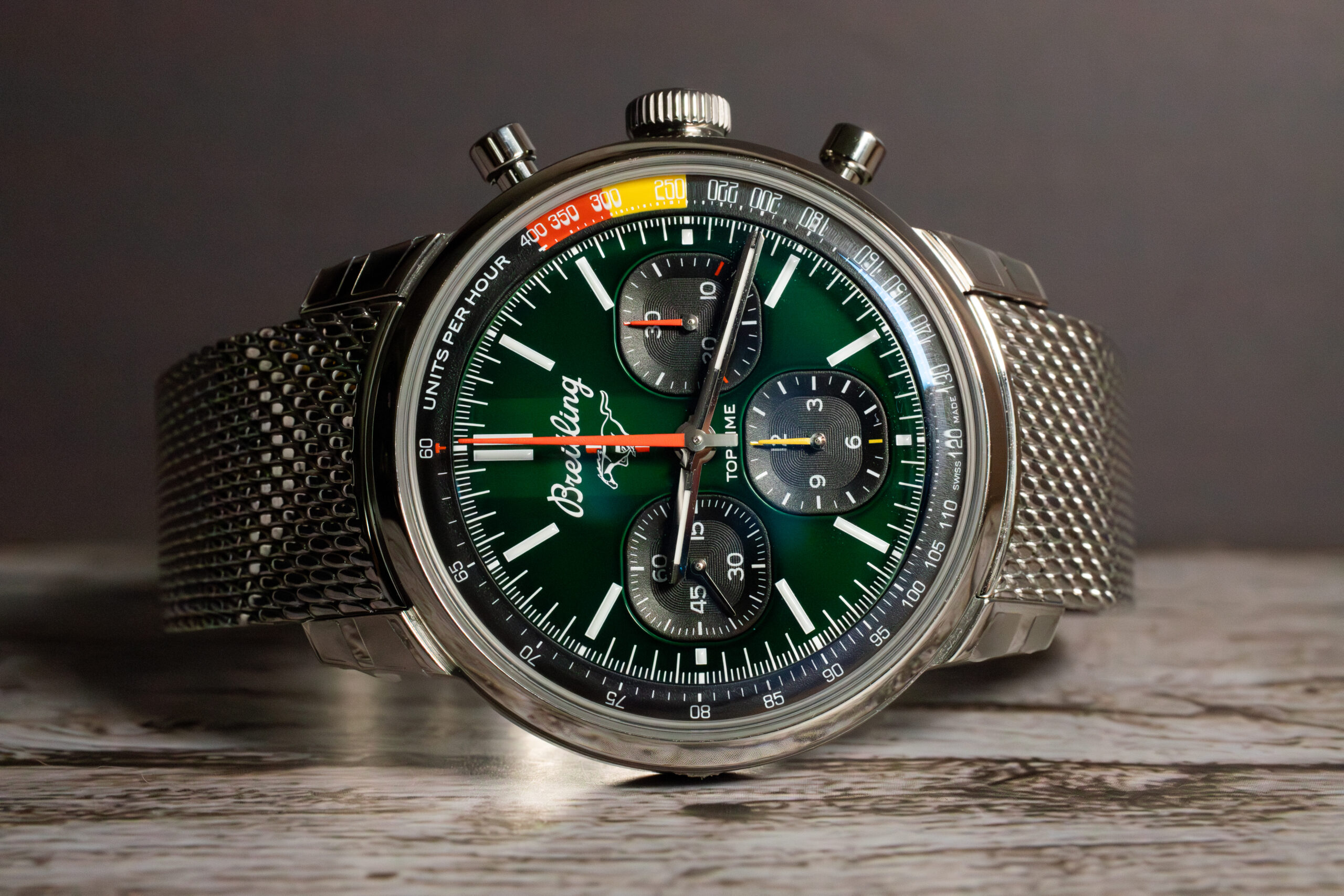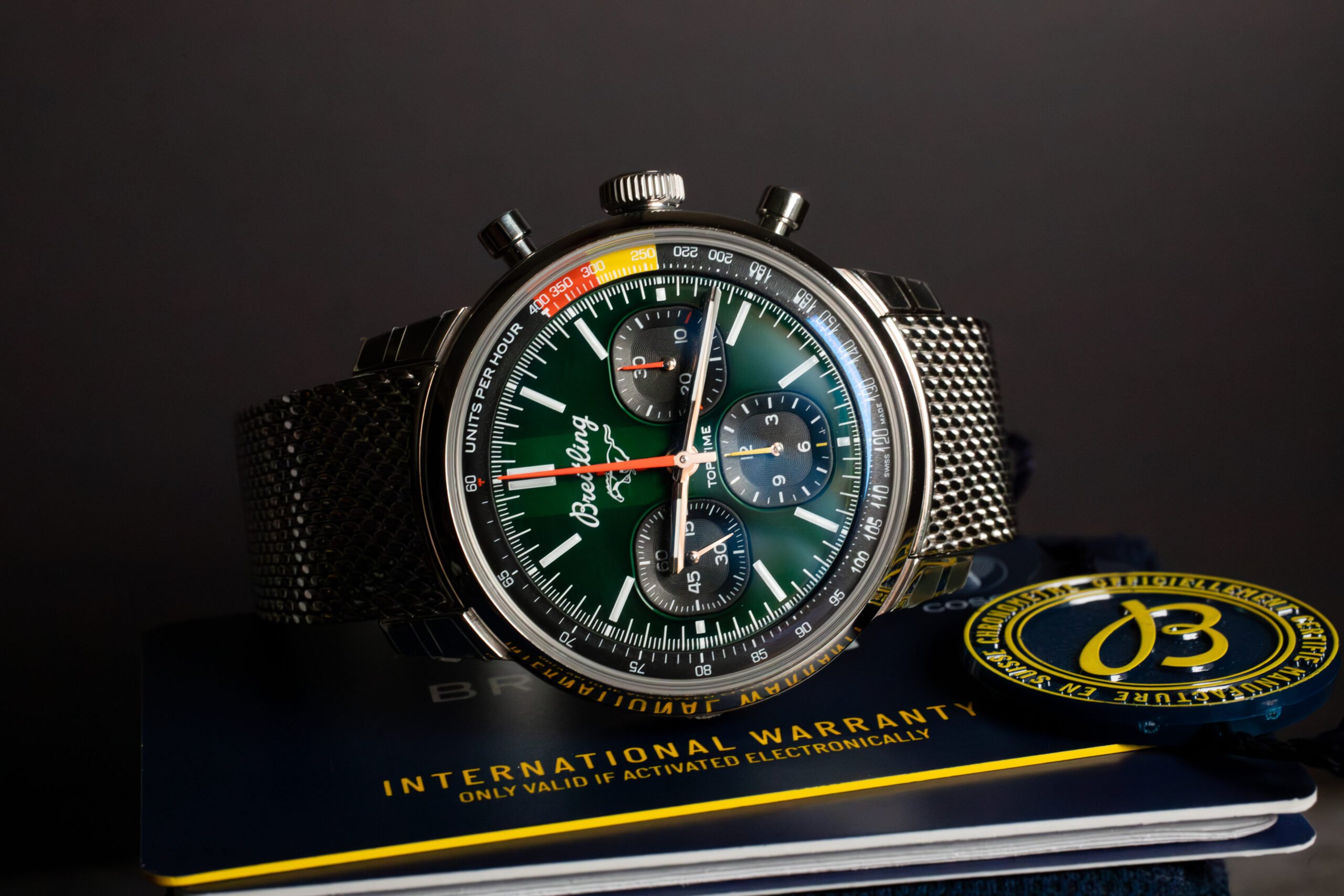 The distinctive green dial creates connection to Mustang’s racing heritage through colour association with classic American racing liveries whilst providing sophisticated aesthetic that distinguishes this tribute from conventional automotive chronographs. Green represents growth, energy, and American automotive innovation whilst creating distinctive visual identity that serves both Mustang heritage celebration and luxury chronograph aesthetics. The colour choice demonstrates thoughtful consideration of Mustang’s visual heritage whilst maintaining the elegance expected from Breitling luxury timepieces.