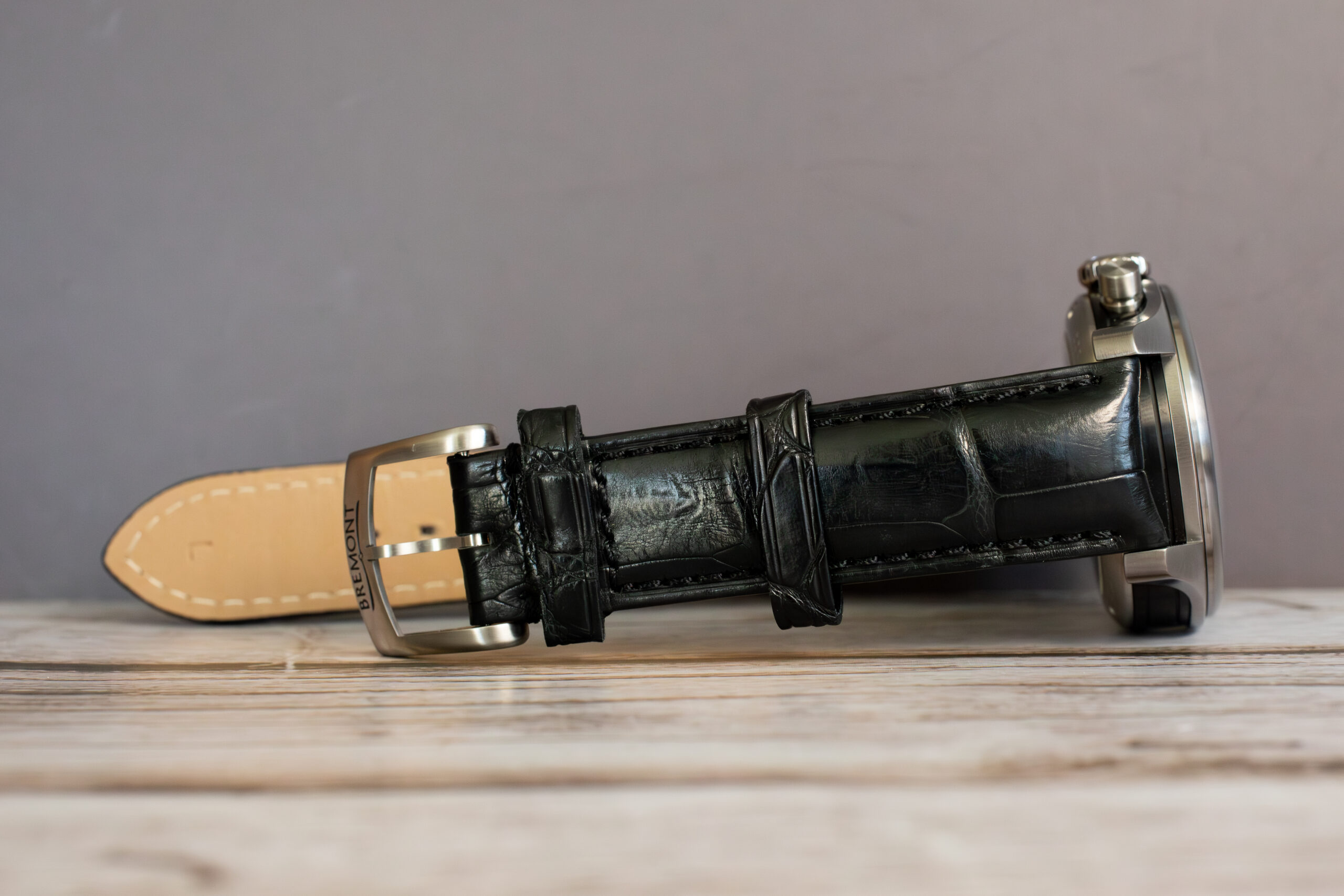 The BE-83AR flyback chronograph movement delivers comprehensive functionality through 39-jewel construction with sweep hours, minutes, flyback chronograph seconds, 30-minute and 60-second counters, plus GMT second time zone and date. The 13¼″ diameter movement with 7.90mm height demonstrates sophisticated engineering whilst the automatic operation provides convenience.