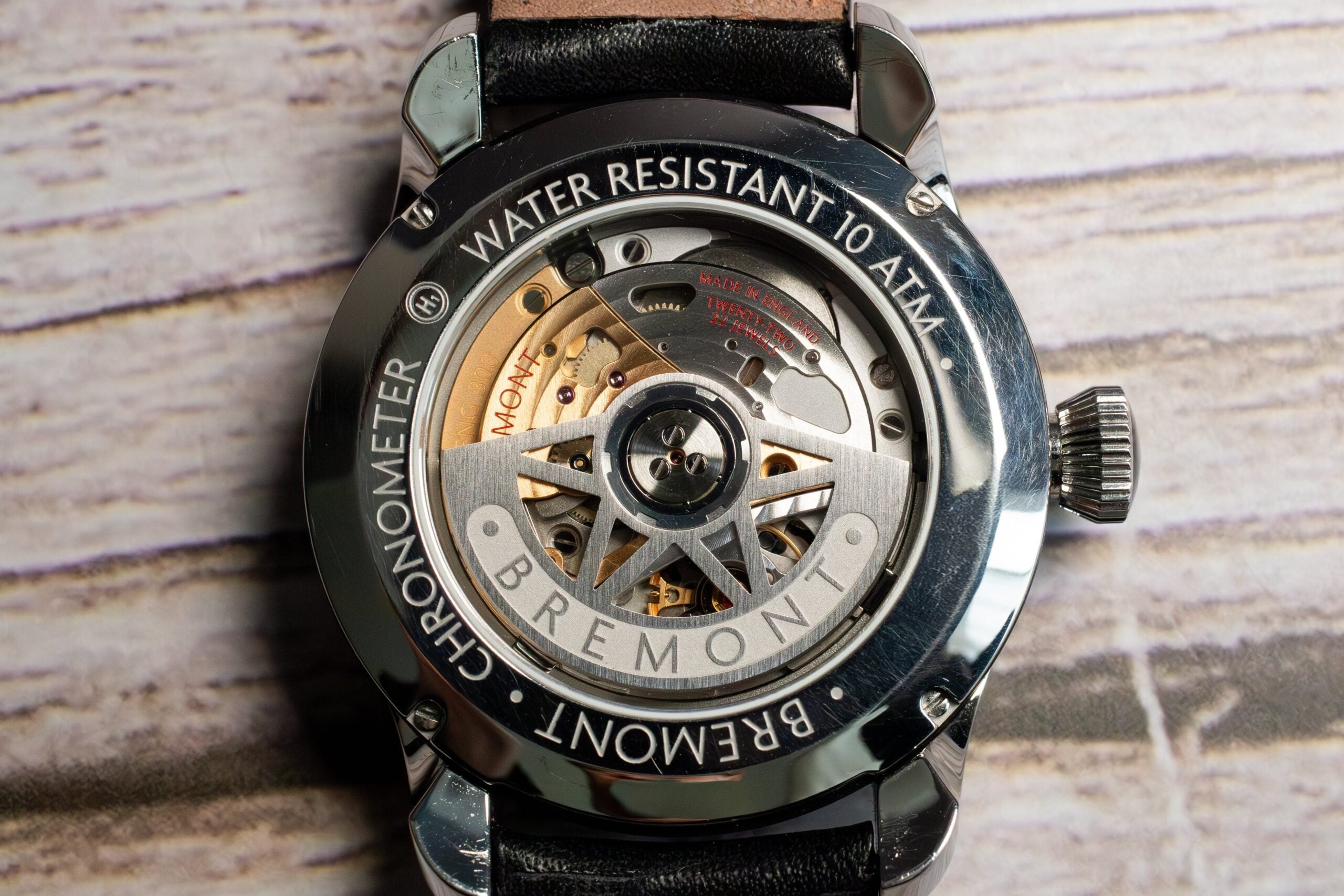 The Bremont ENG365 delivers exceptional 65-hour power reserve through 22-jewel construction with silicon escape wheel and free-sprung hairspring providing enhanced accuracy and magnetic resistance. The rhodium-plated bridges with decorative engraving showcase premium finishing whilst the custom tungsten rotor ensures efficient winding.