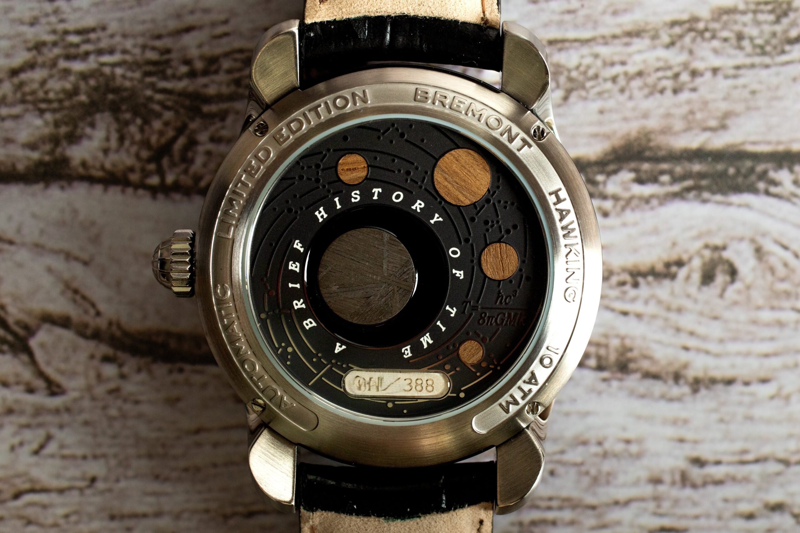 Featuring a unique design that incorporates elements directly connected to Hawking’s life and work, the watch transforms scientific heritage into a wearable piece of art. From the wooden discs inlaid in the caseback to the meteorite at its centre, every detail tells a story of cosmic wonder and human ingenuity.