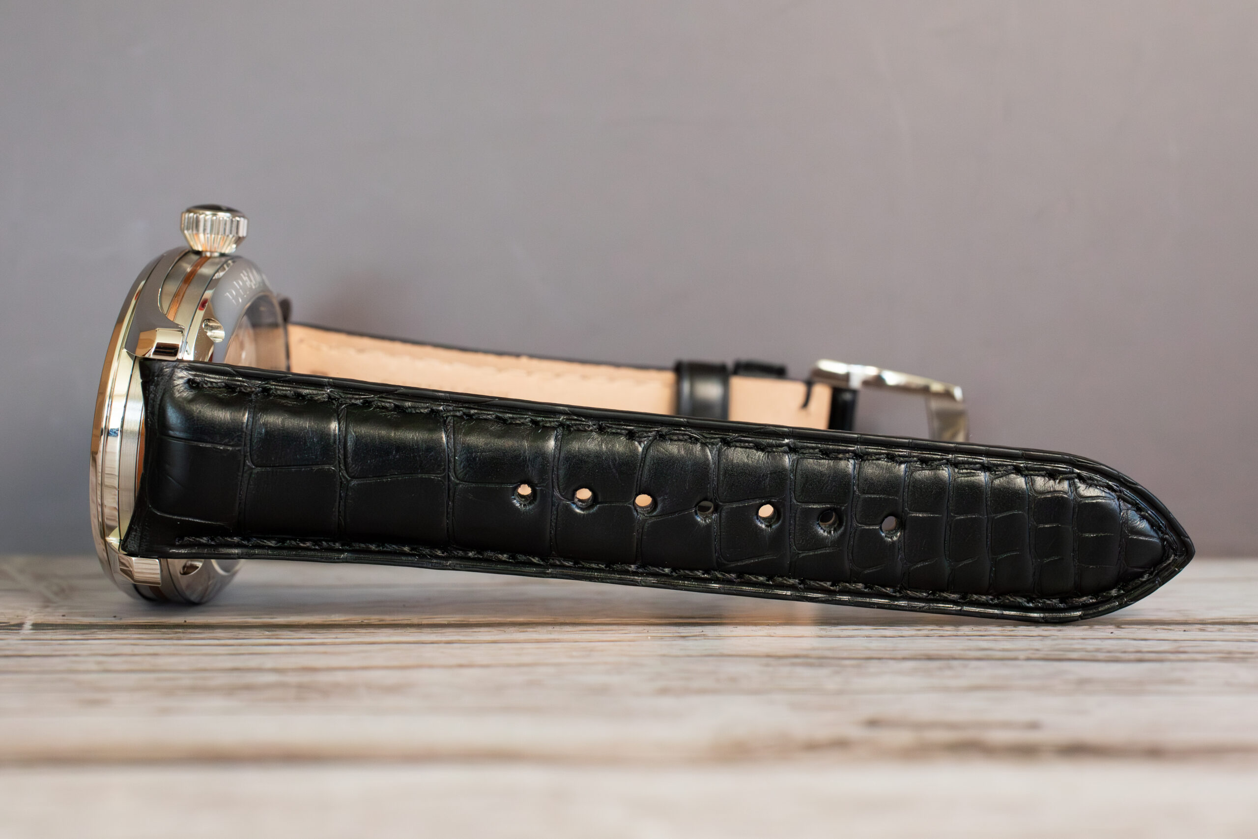 The domed sapphire crystal with anti-reflective coating ensures optimal clarity whilst the exhibition caseback with integrated domed crystal reveals the decorated movement. The 100m water resistance and bespoke SuperLumiNova coating provide practical functionality.