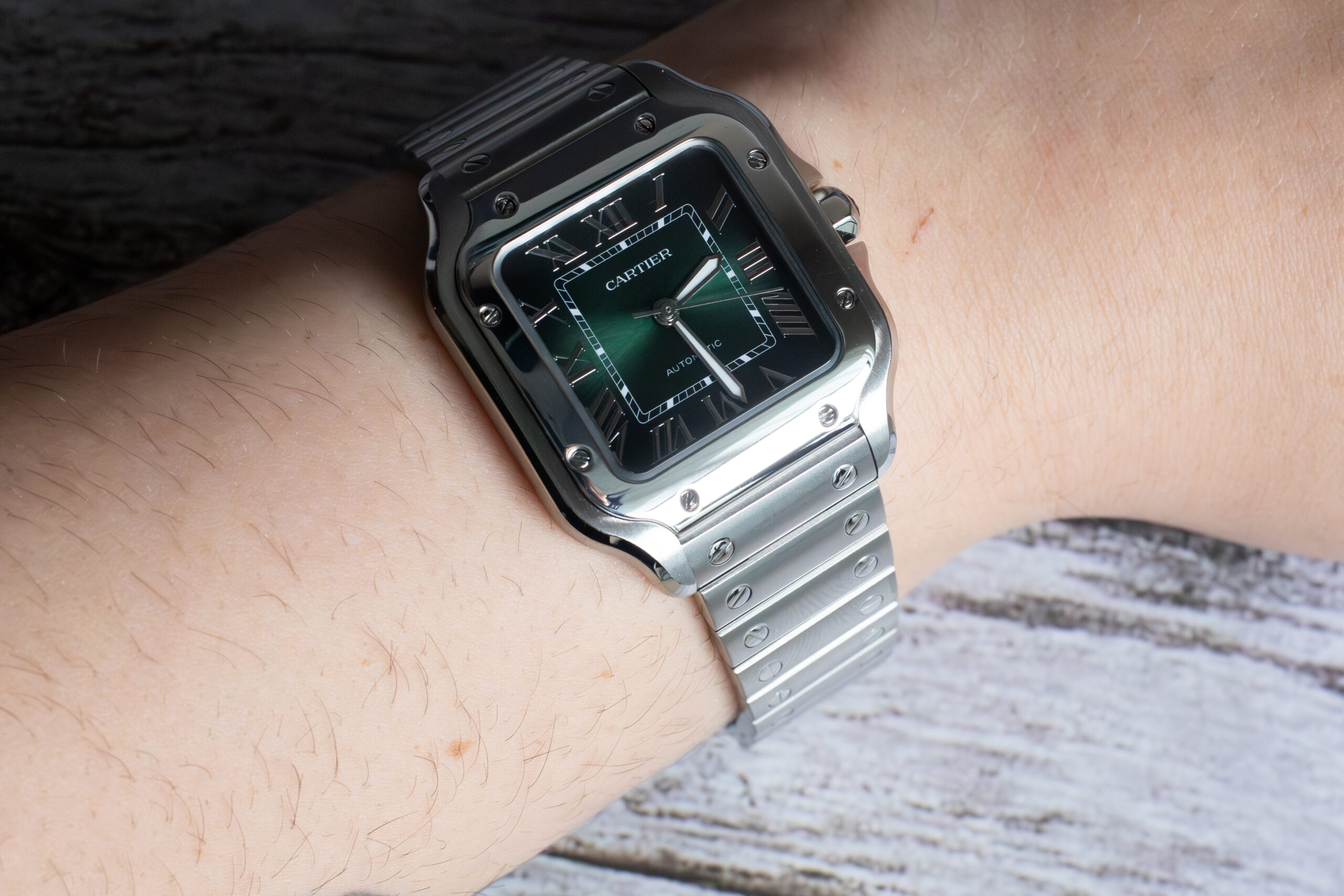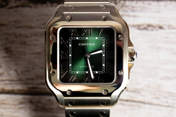 The colour selection also demonstrates Cartier’s ability to evolve classic designs through contemporary materials and techniques whilst preserving the essential character that makes the Santos instantly recognisable. The graduated effect requires sophisticated manufacturing expertise to achieve consistent quality and colour distribution, showcasing Cartier’s commitment to technical excellence in dial production. For collectors seeking distinctive Santos variants and enthusiasts who appreciate colour innovation in luxury watchmaking, the green dial provides compelling combination of traditional Santos heritage and contemporary aesthetic appeal that distinguishes this model whilst maintaining authentic Cartier character.