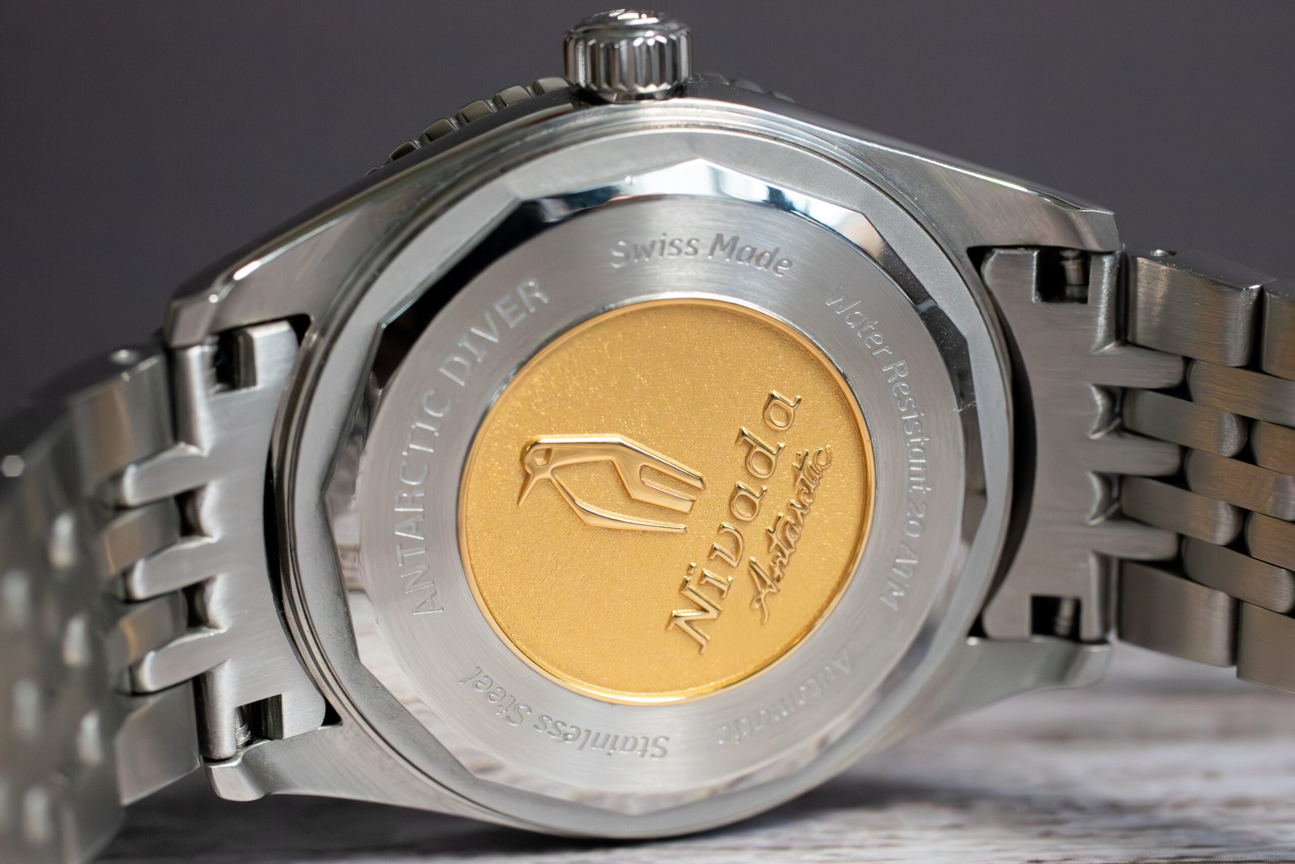 At 38mm with 12.9mm thickness, this delivers authentic period proportions that wear comfortably on modern wrists without the oversizing common in contemporary dive watches. The grey matte dial and bi-directional ceramic bezel maintain professional diving functionality while the Antarctic penguin caseback engraving connects to Nivada Grenchen’s polar exploration heritage.