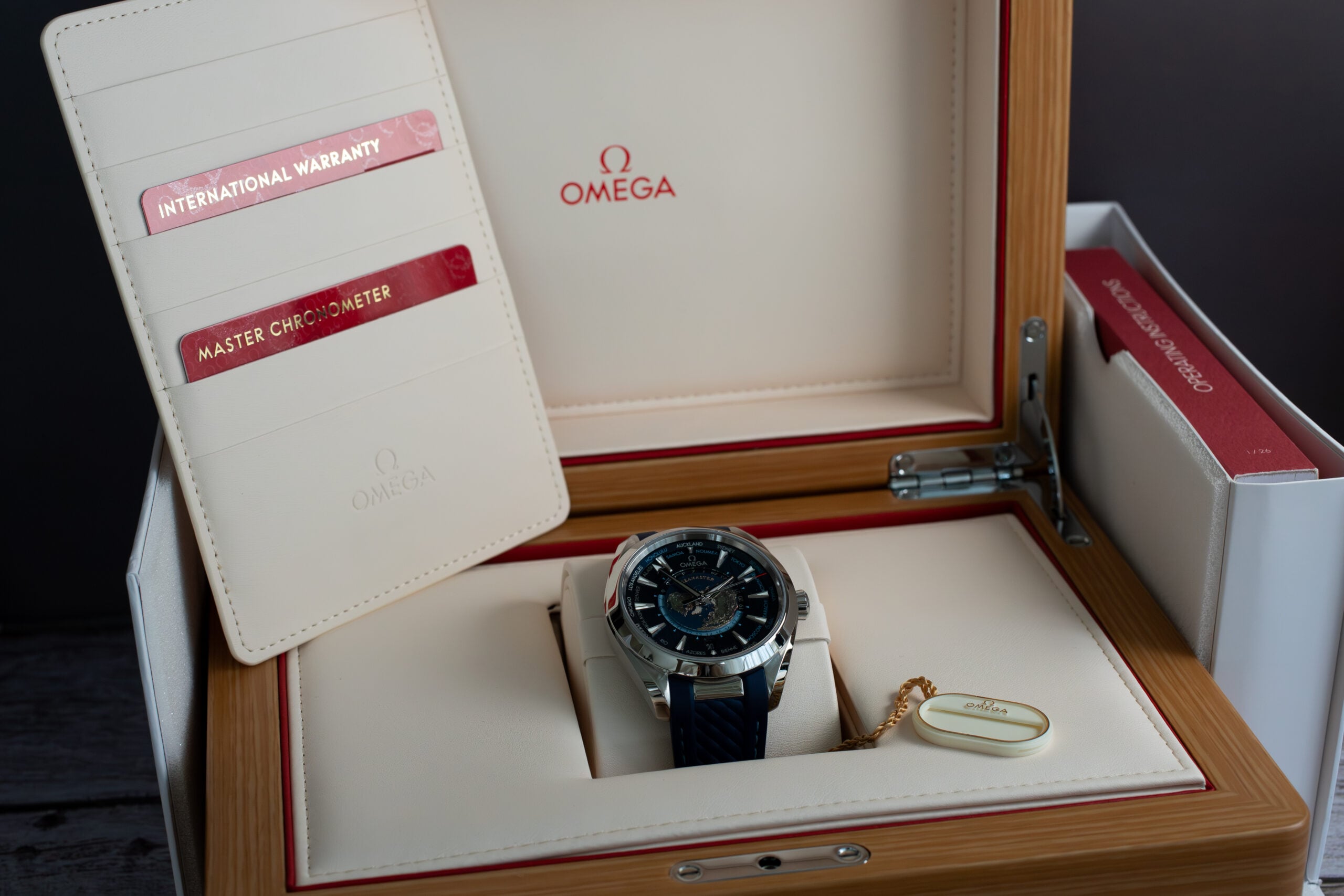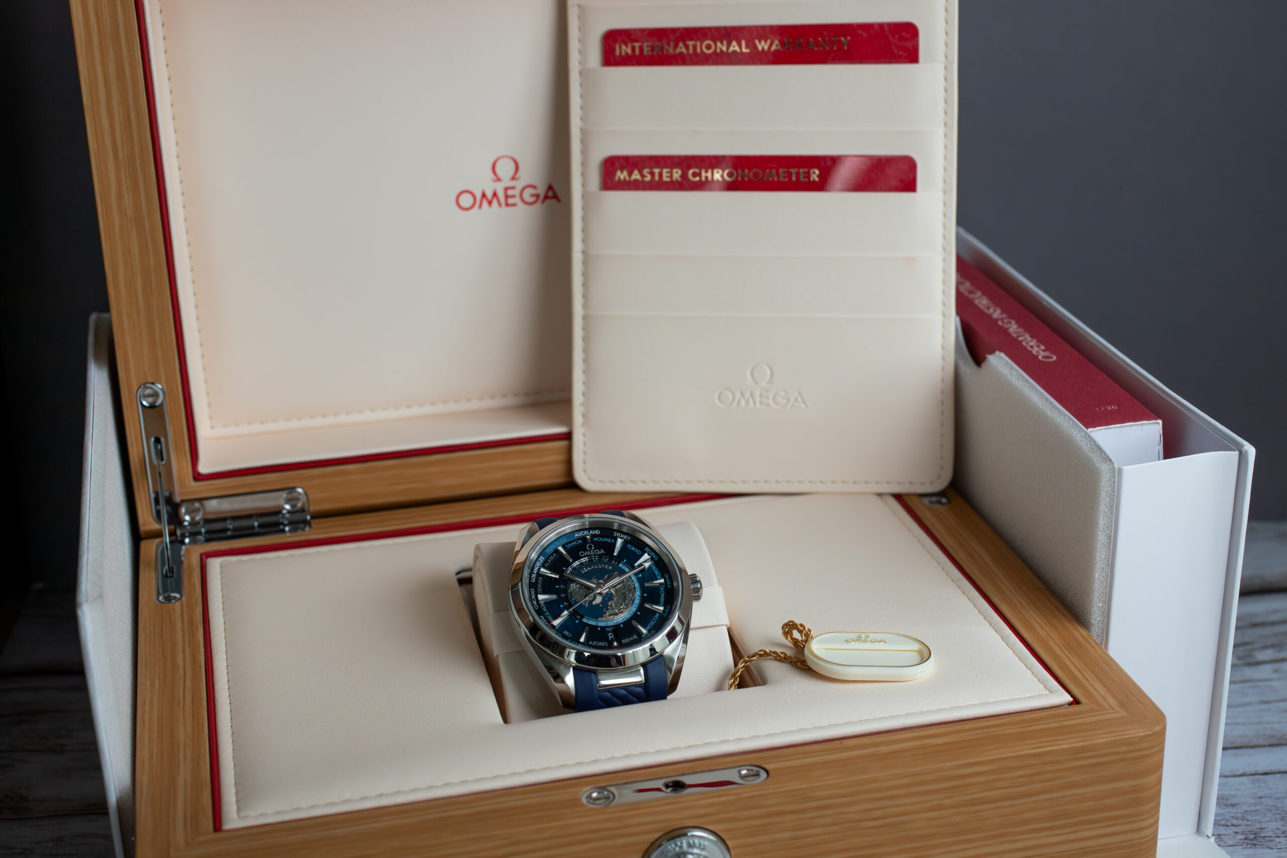 This Aqua Terra Worldtimer suits frequent international travellers seeking sophisticated GMT functionality with distinctive laser-ablated Earth depiction and proven Master Chronometer technology. The comprehensive world time capability and integrated rubber strap create practical luxury whilst the advanced movement ensures reliable multi-zone timekeeping for demanding travel schedules.