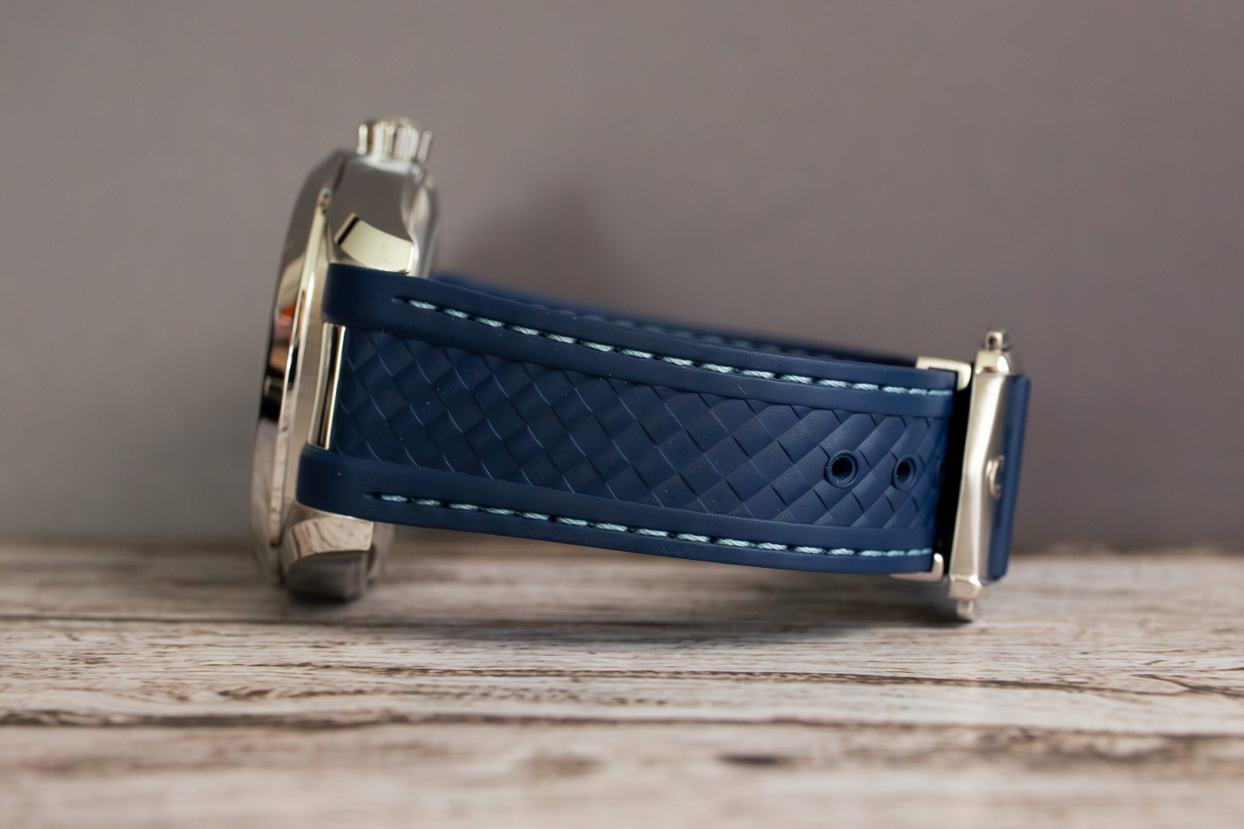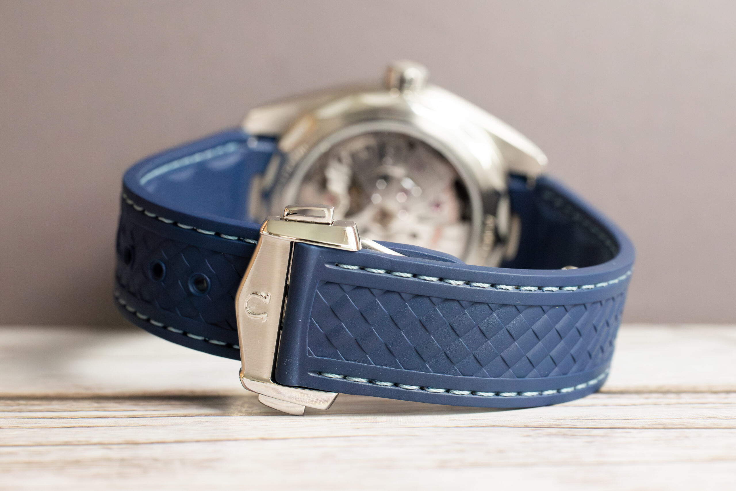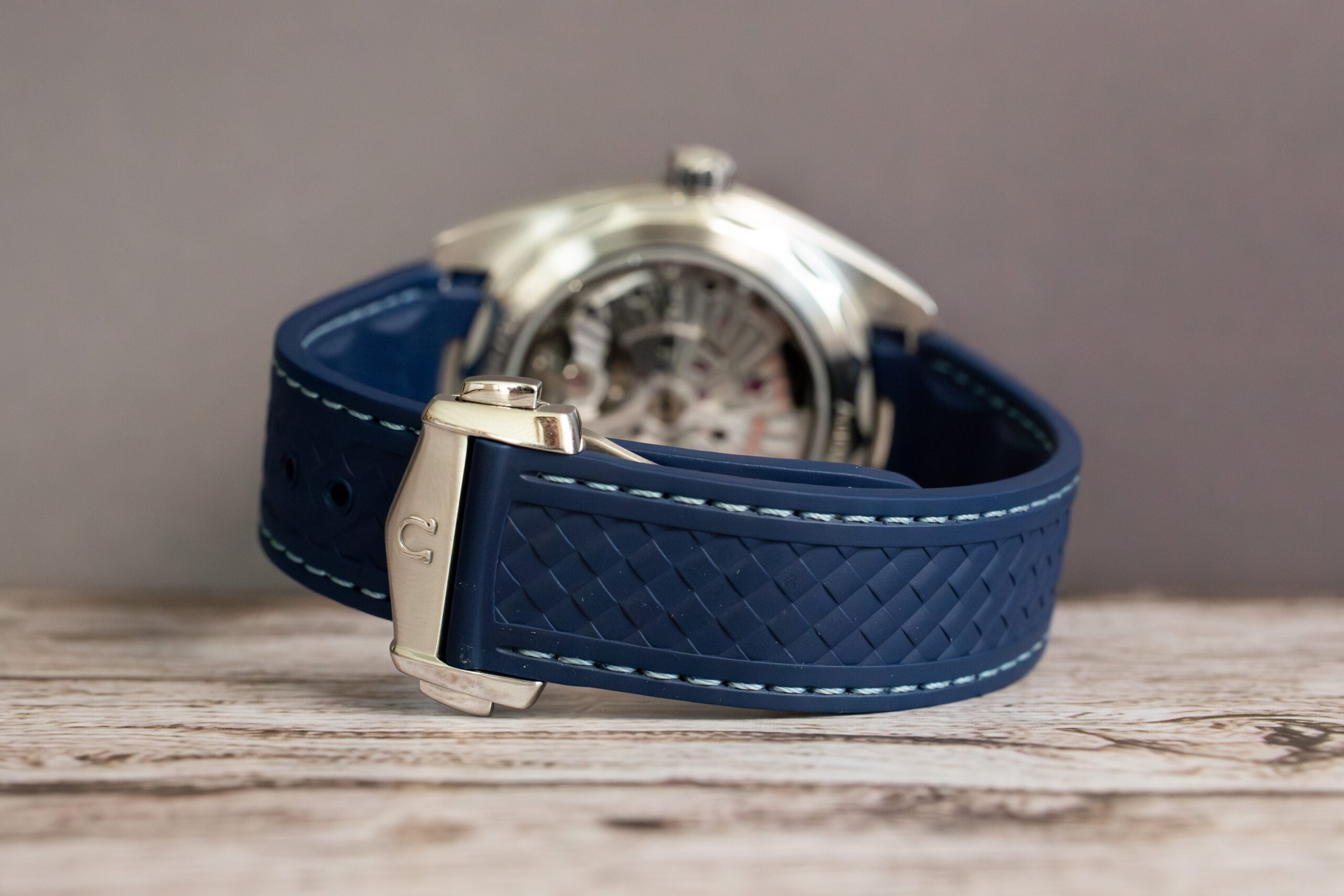 At 43mm with 14.12mm thickness, this provides substantial worldtimer presence through stainless steel construction whilst the structured blue rubber strap ensures comfort during international travel. The sun-brushed blue exterior dial with vertical teak stripes creates sophisticated depth whilst the 24-hour glass ring with light and dark blue sections indicates day and night across global time zones.