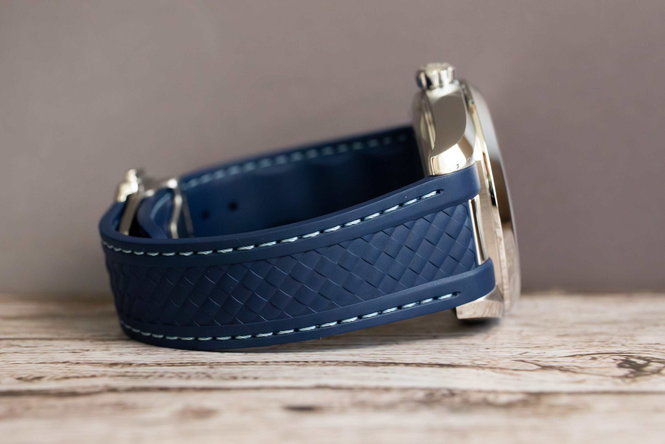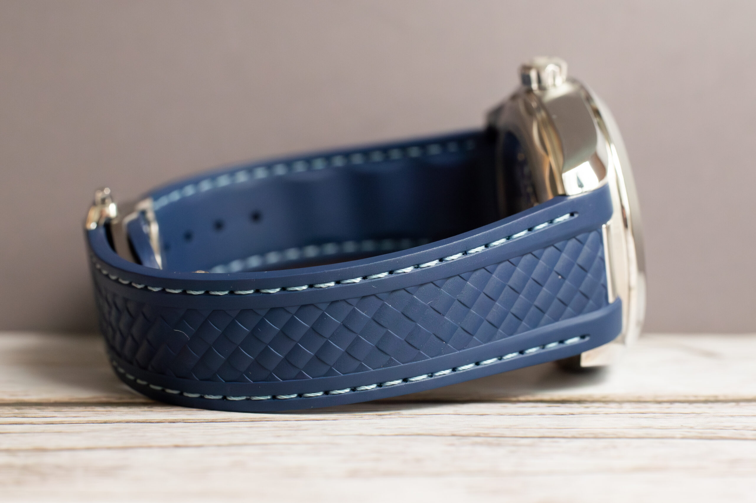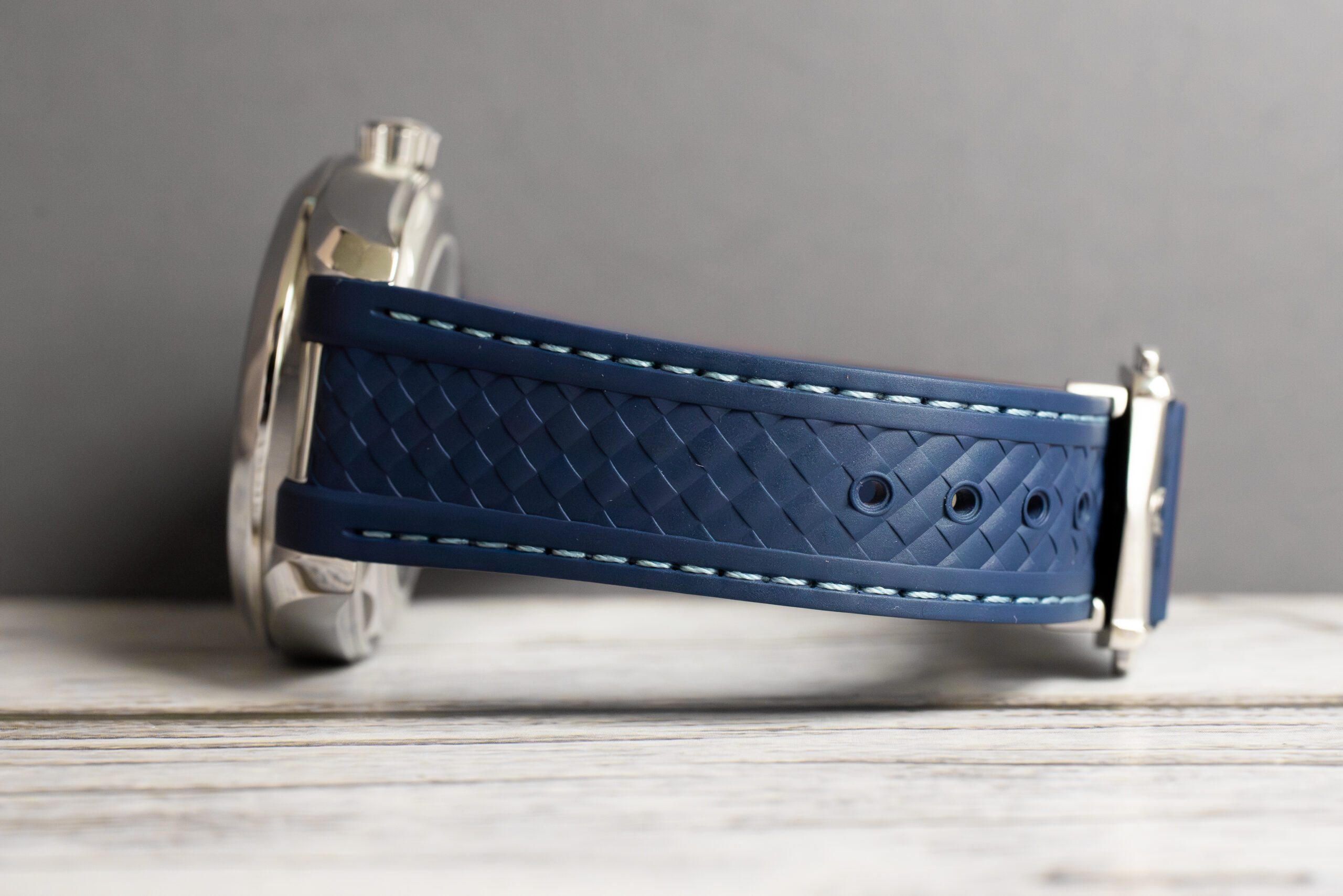 At 43mm with 14.12mm thickness, this provides substantial worldtimer presence through stainless steel construction whilst the structured blue rubber strap ensures comfort during international travel. The sun-brushed blue exterior dial with vertical teak stripes creates sophisticated depth whilst the 24-hour glass ring with light and dark blue sections indicates day and night across global time zones.