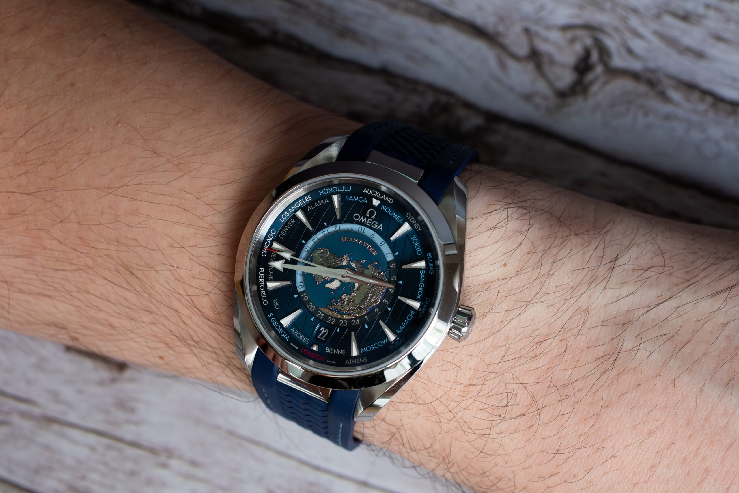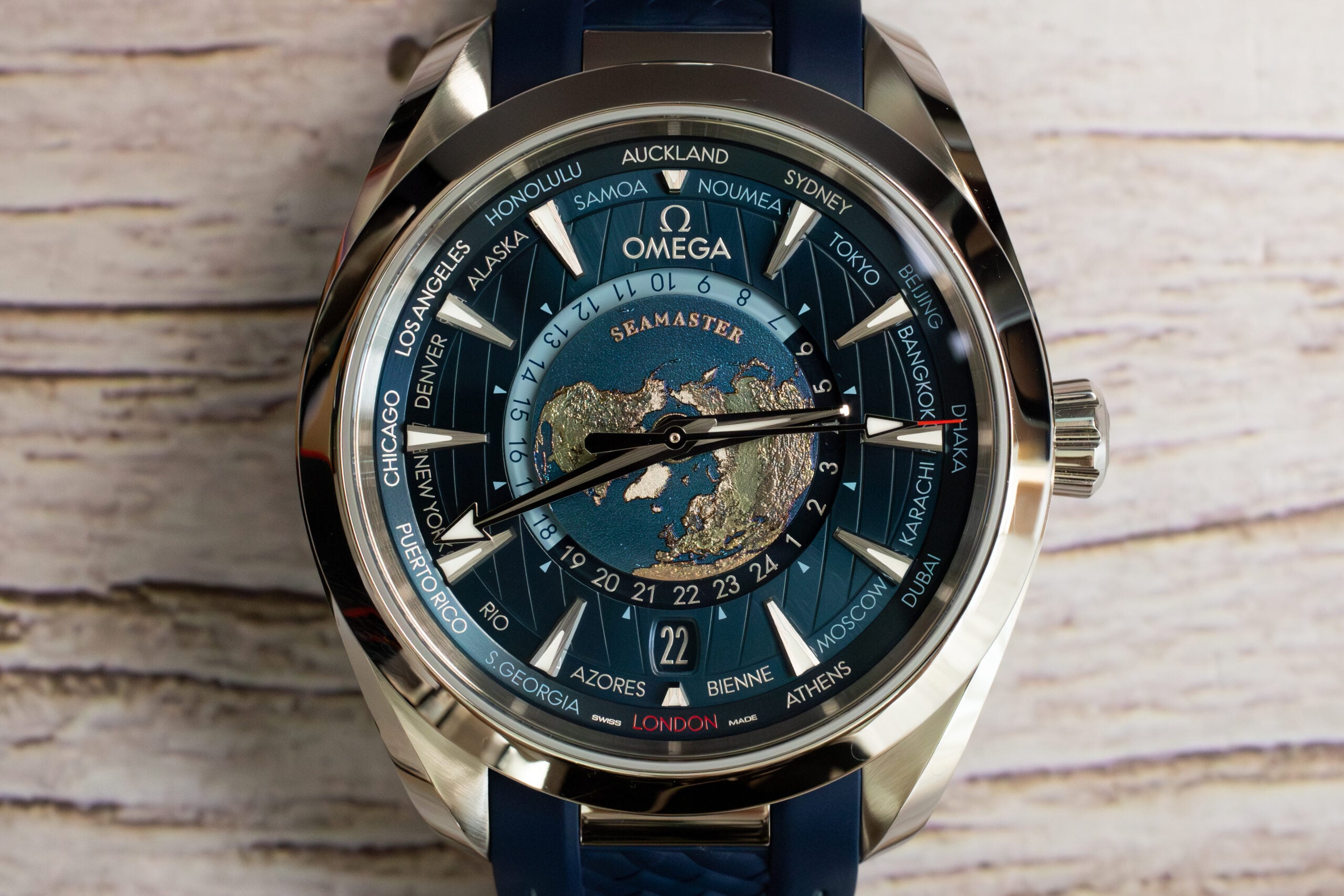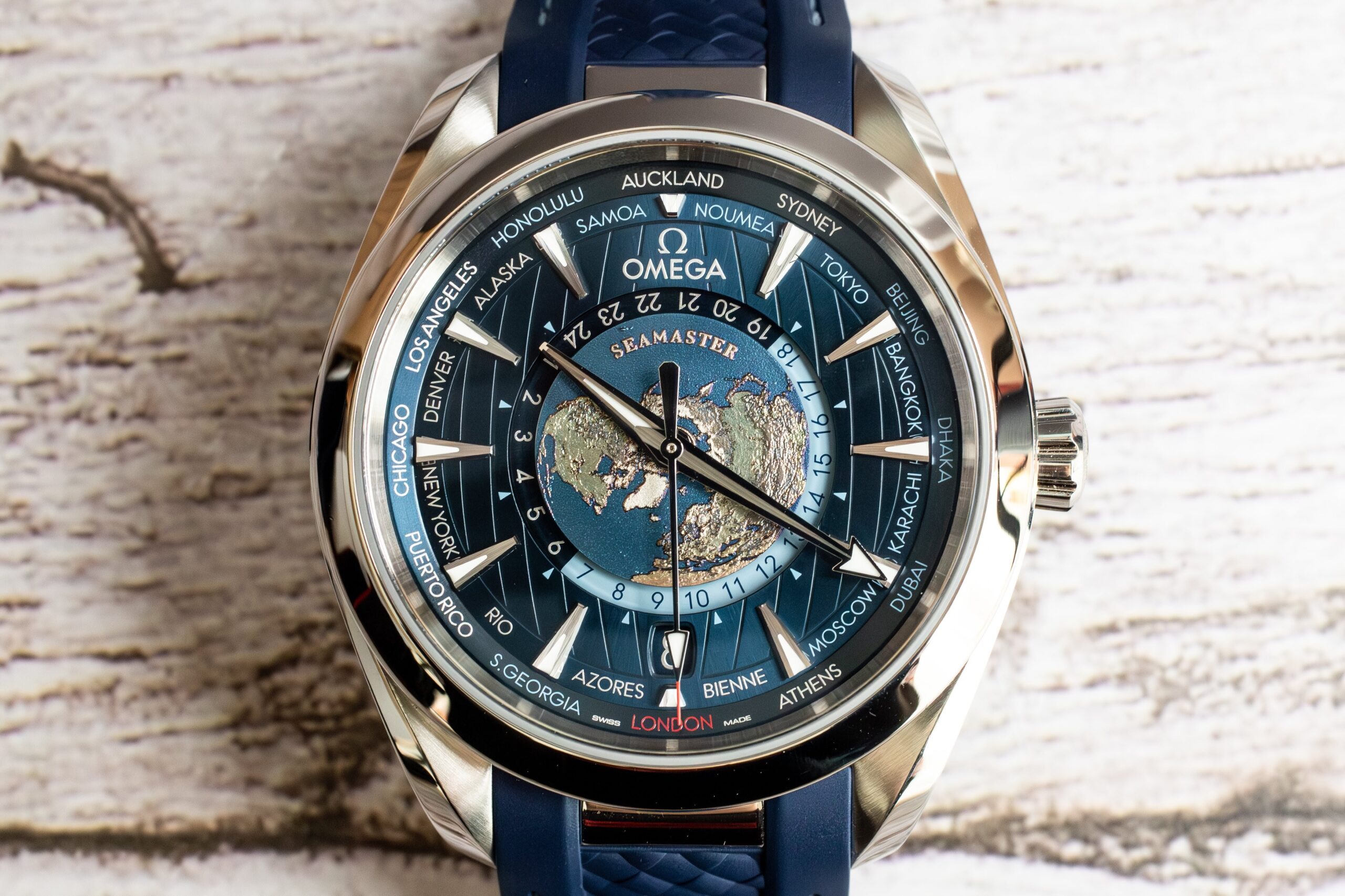 The OMEGA Seamaster Aqua Terra Worldtimer 43mm (Ref. 220.12.43.22.03.001) showcases sophisticated global travel functionality through laser-ablated Grade 5 titanium plate depicting Earth’s continents in relief whilst blue oceans are created through chemical reaction rather than paint. The integrated blue rubber strap with polished steel link creates seamless visual flow whilst the circle of destinations printed in red (GMT), silver (+1h summer), and blue (no daylight saving) enables comprehensive world time tracking.