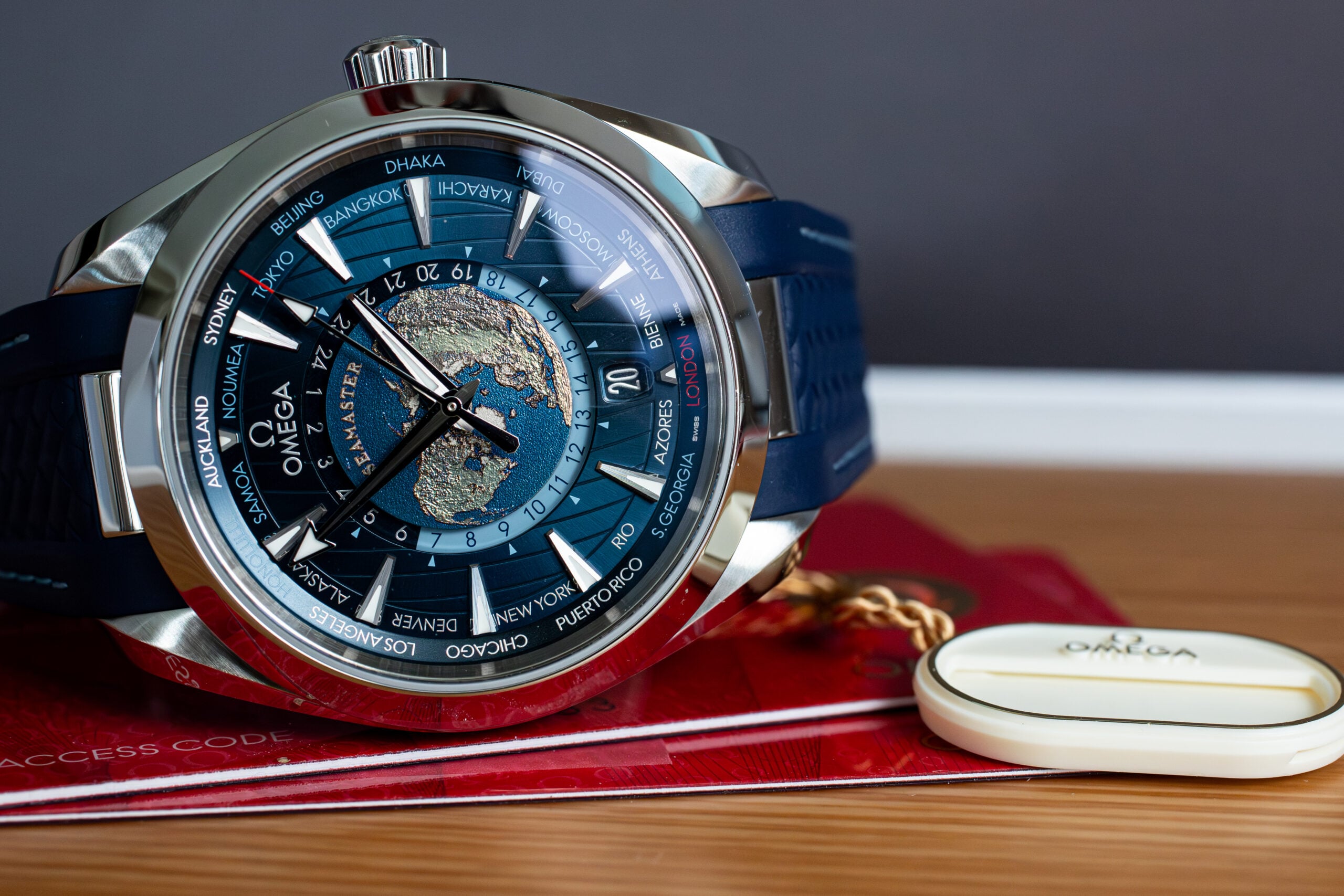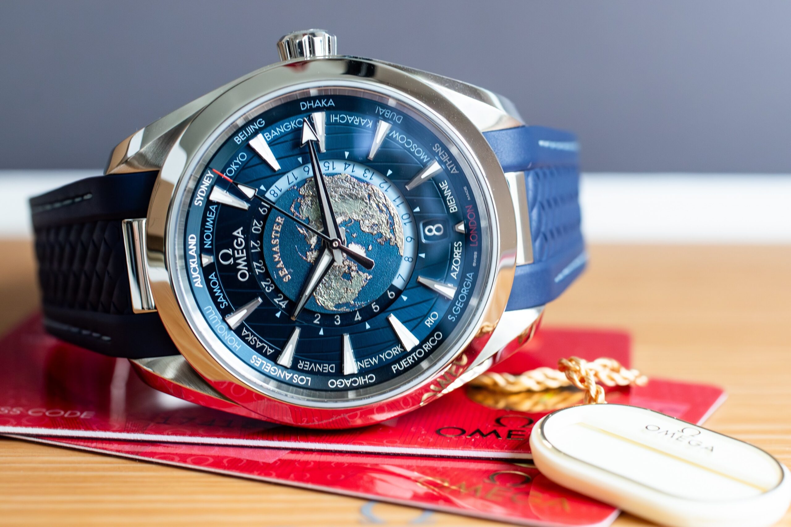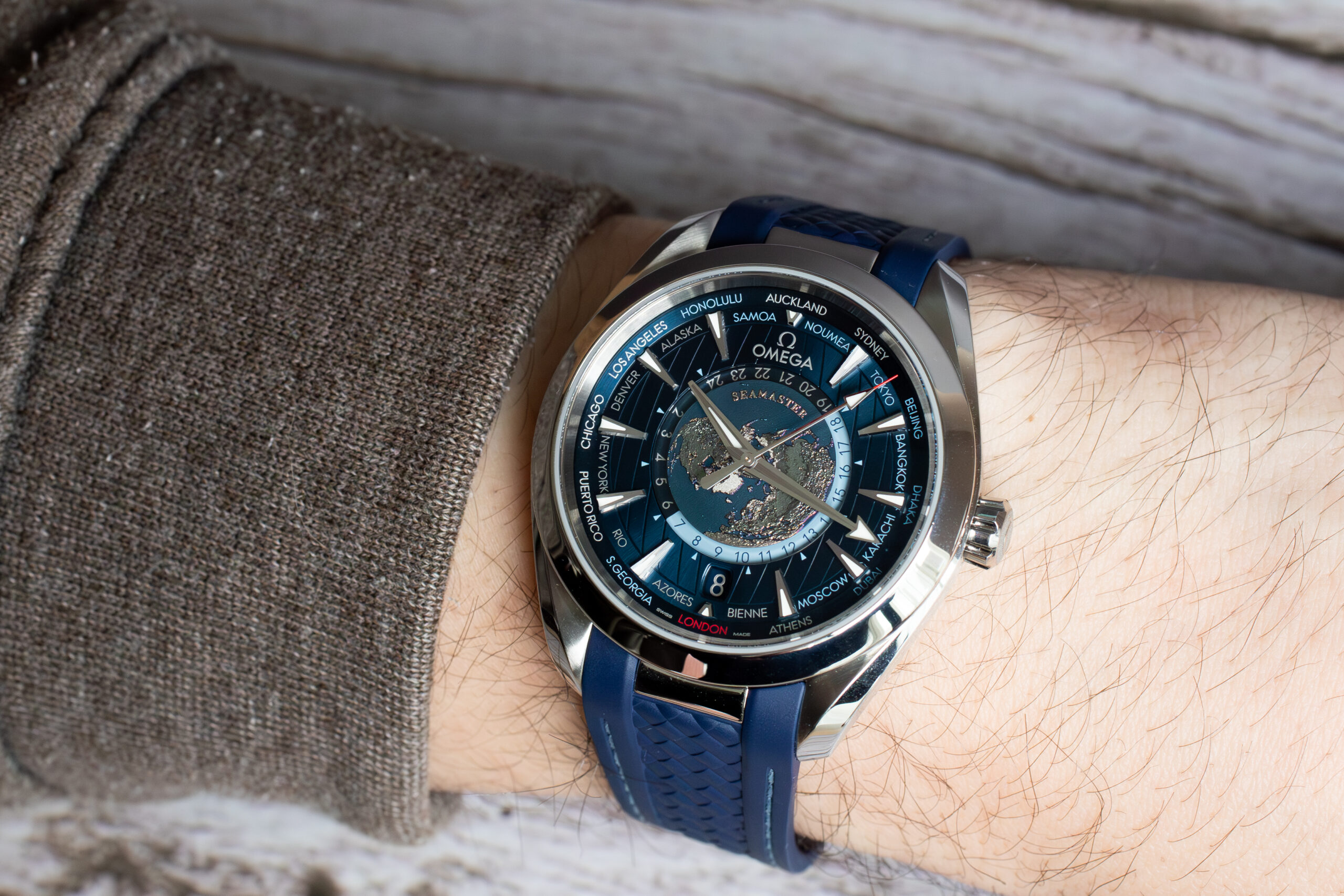 The OMEGA Seamaster Aqua Terra Worldtimer 43mm (Ref. 220.12.43.22.03.001) showcases sophisticated global travel functionality through laser-ablated Grade 5 titanium plate depicting Earth’s continents in relief whilst blue oceans are created through chemical reaction rather than paint. The integrated blue rubber strap with polished steel link creates seamless visual flow whilst the circle of destinations printed in red (GMT), silver (+1h summer), and blue (no daylight saving) enables comprehensive world time tracking.