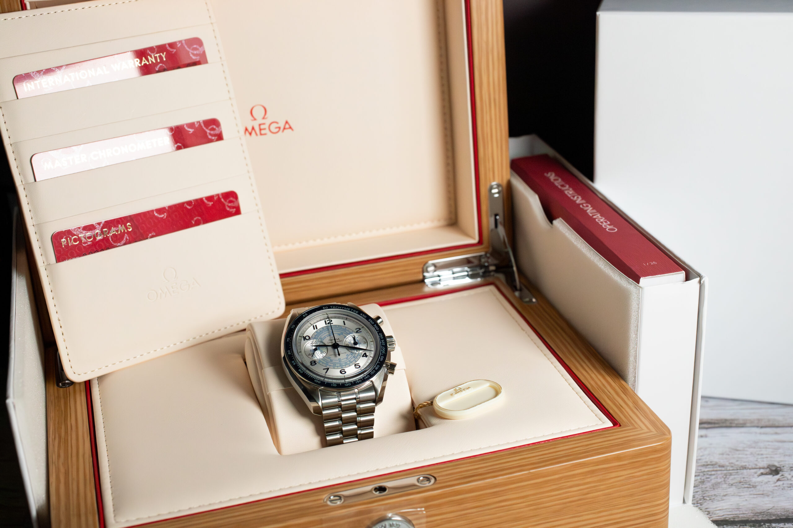 This Speedmaster Chronoscope suits collectors seeking vintage-inspired OMEGA chronograph with comprehensive timing scales and 1940s aesthetic character. The distinctive snail design and multiple measurement functions provide unique capability within the Speedmaster family whilst the Master Chronometer movement ensures contemporary reliability that honours OMEGA’s chronograph heritage.