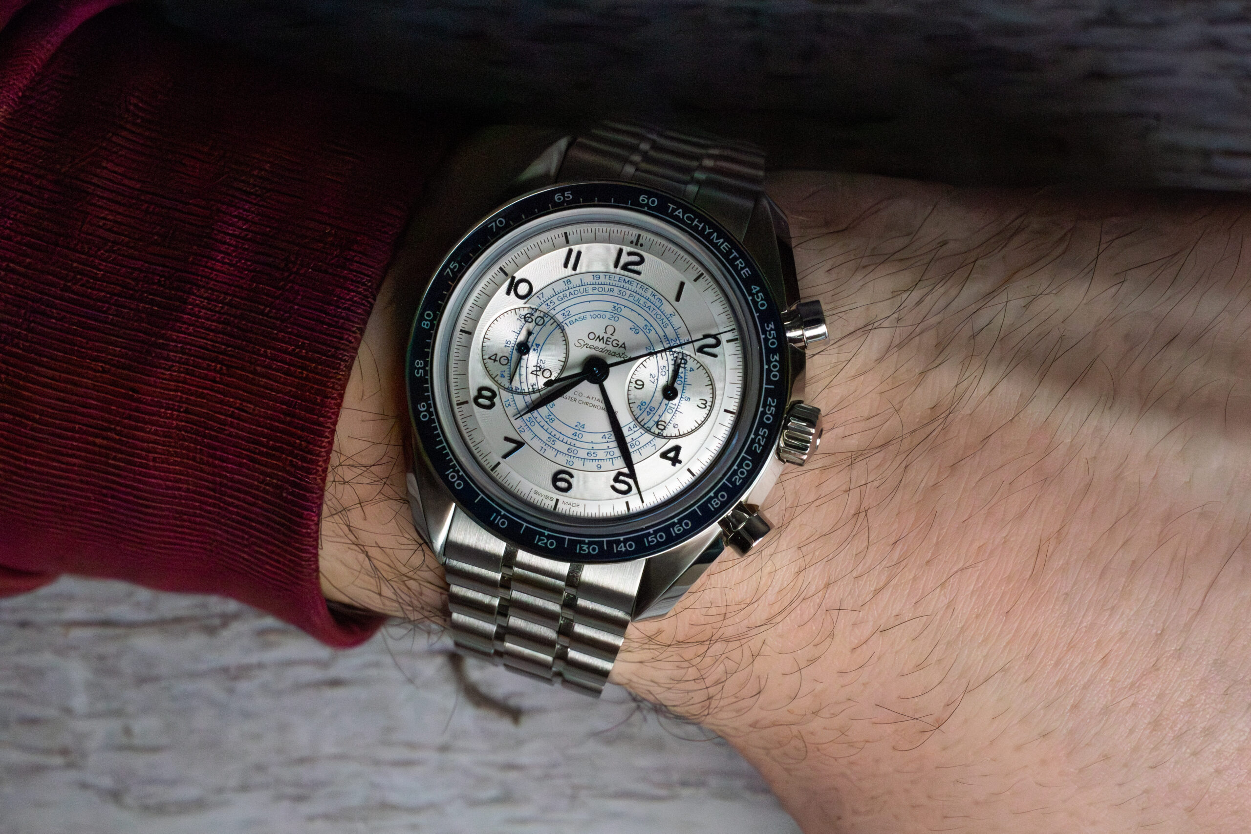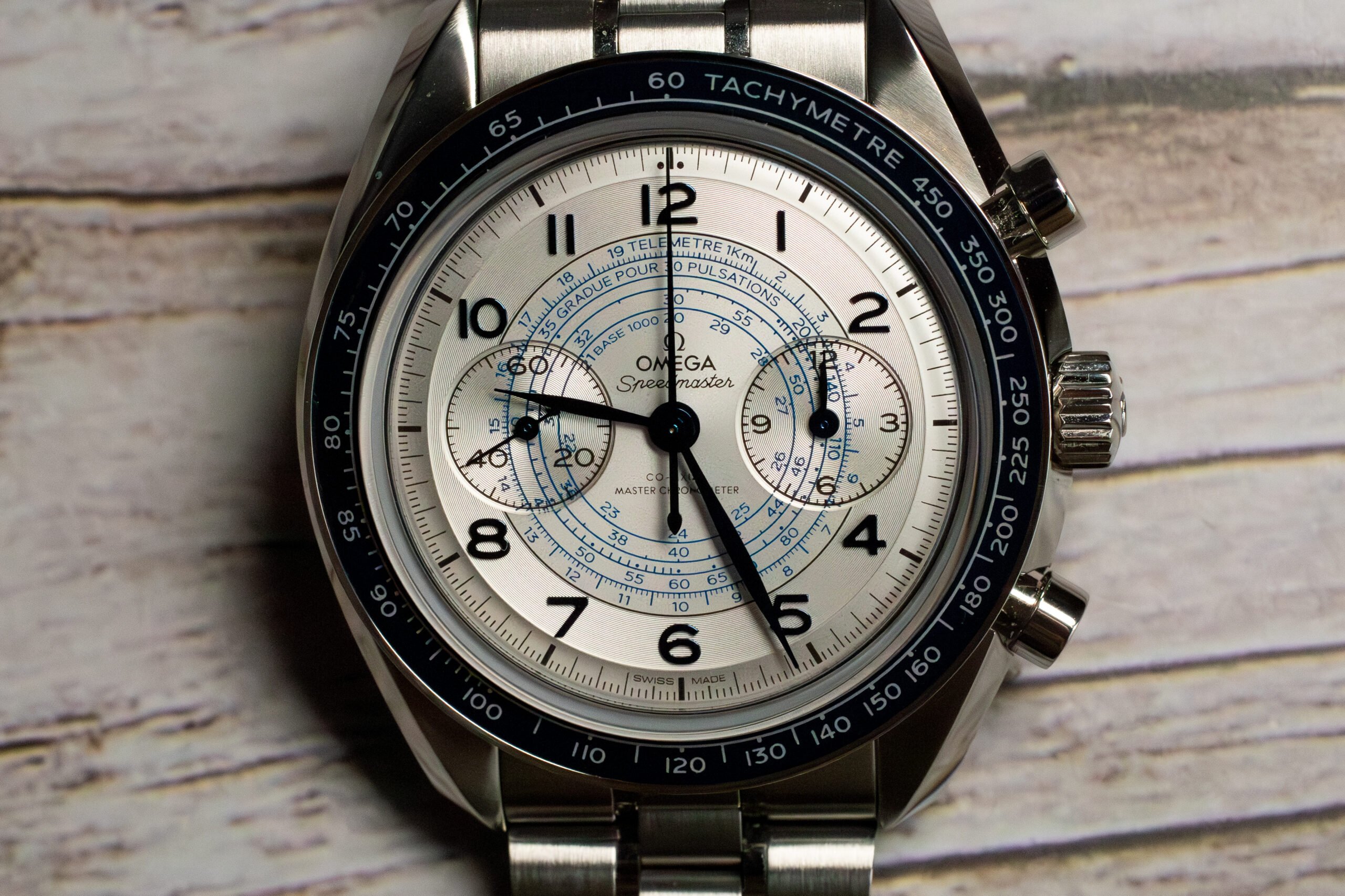 At 43mm with stainless steel construction, this provides substantial chronograph presence through classic proportions whilst the silvery dial with three timing scales creates comprehensive measurement capability for speed, pulse rate, and distance calculations. The elaborate dial design with 1940s “snail” configuration distinguishes this from conventional Speedmaster models whilst maintaining authentic chronograph functionality.