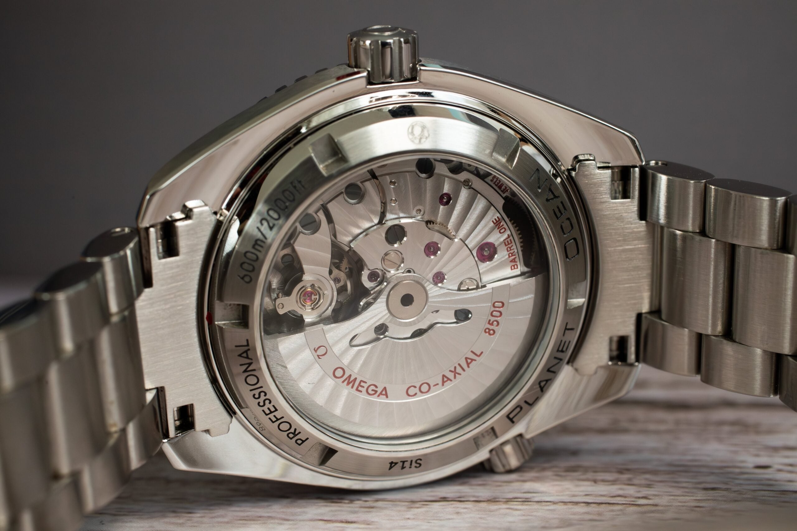 The Co-Axial Calibre 8500 delivers 60-hour power reserve through free sprung-balance with two barrels mounted in series ensuring reliable operation during extended diving missions. The Co-Axial escapement reduces friction whilst the bridges and oscillating mass feature exclusive Geneva waves decoration visible through transparent caseback.