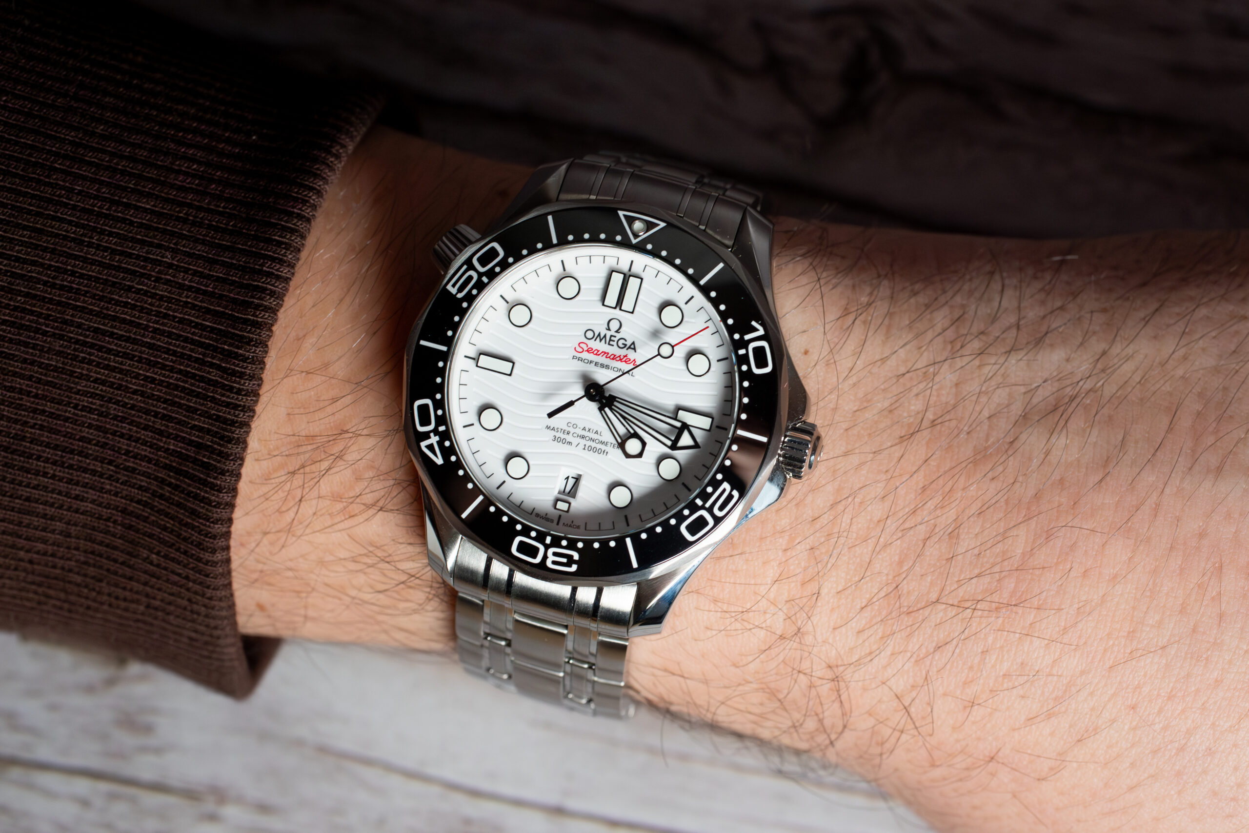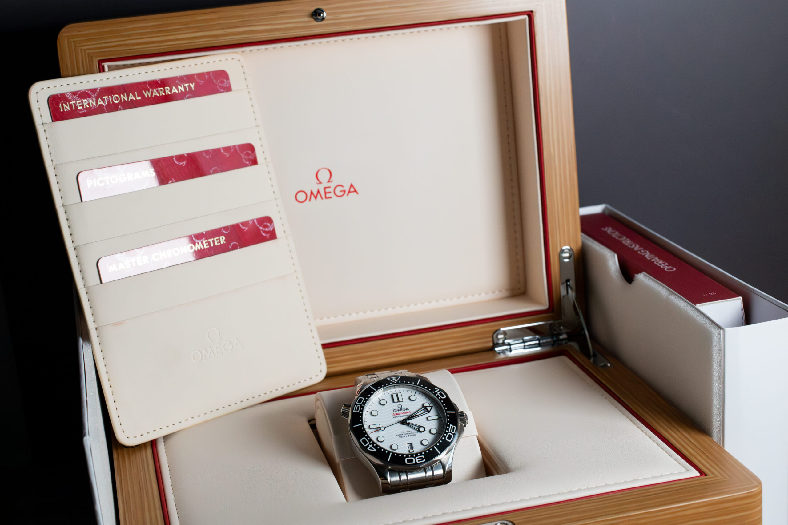 At 42mm with 13.56mm thickness, this provides classic Seamaster proportions that balance diving watch presence with daily wearability. The white ceramic dial offers genuine material advantages including superior scratch resistance and twice the lightness of steel, whilst the black ceramic bezel with white enamel diving scale ensures optimal contrast for underwater timing.