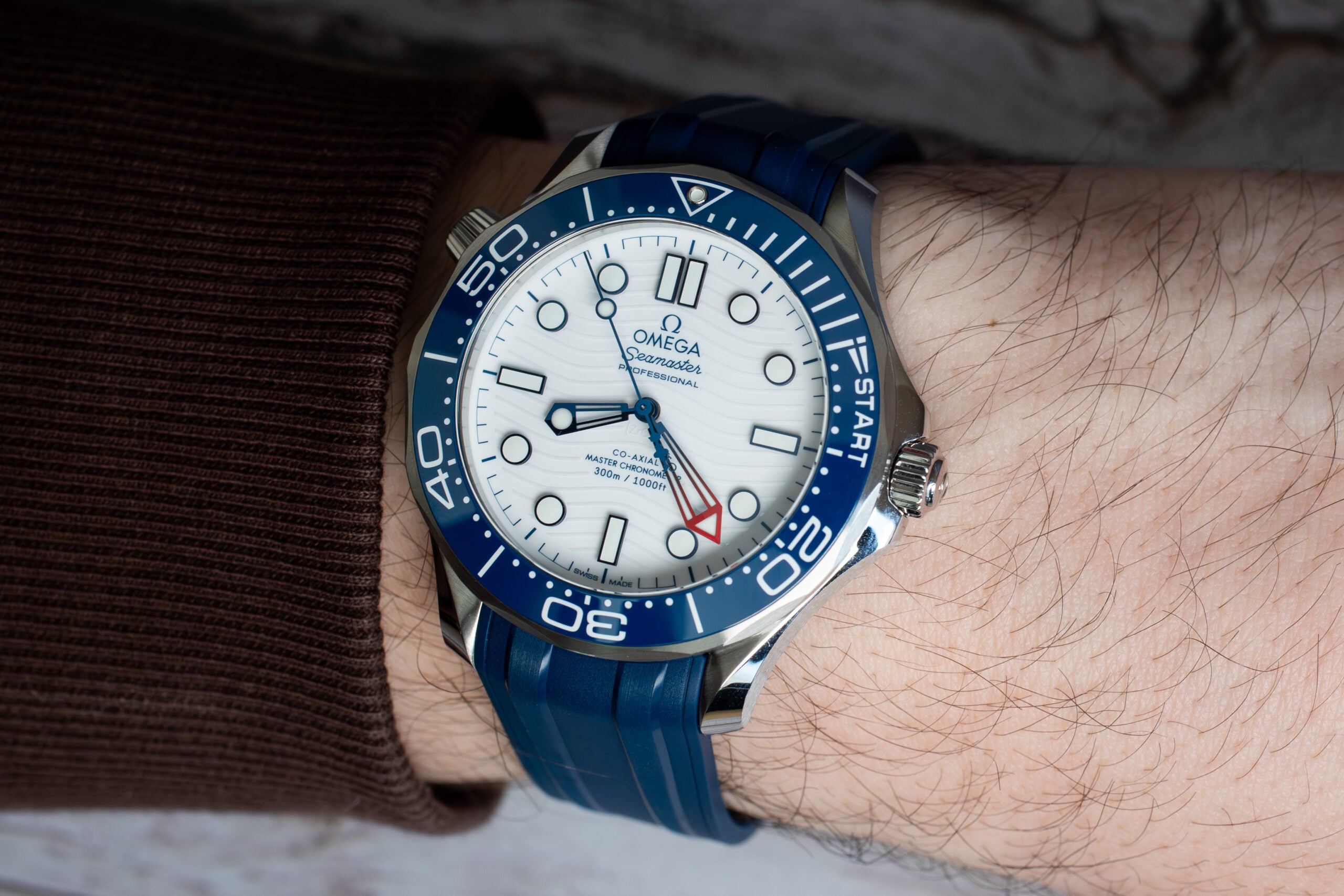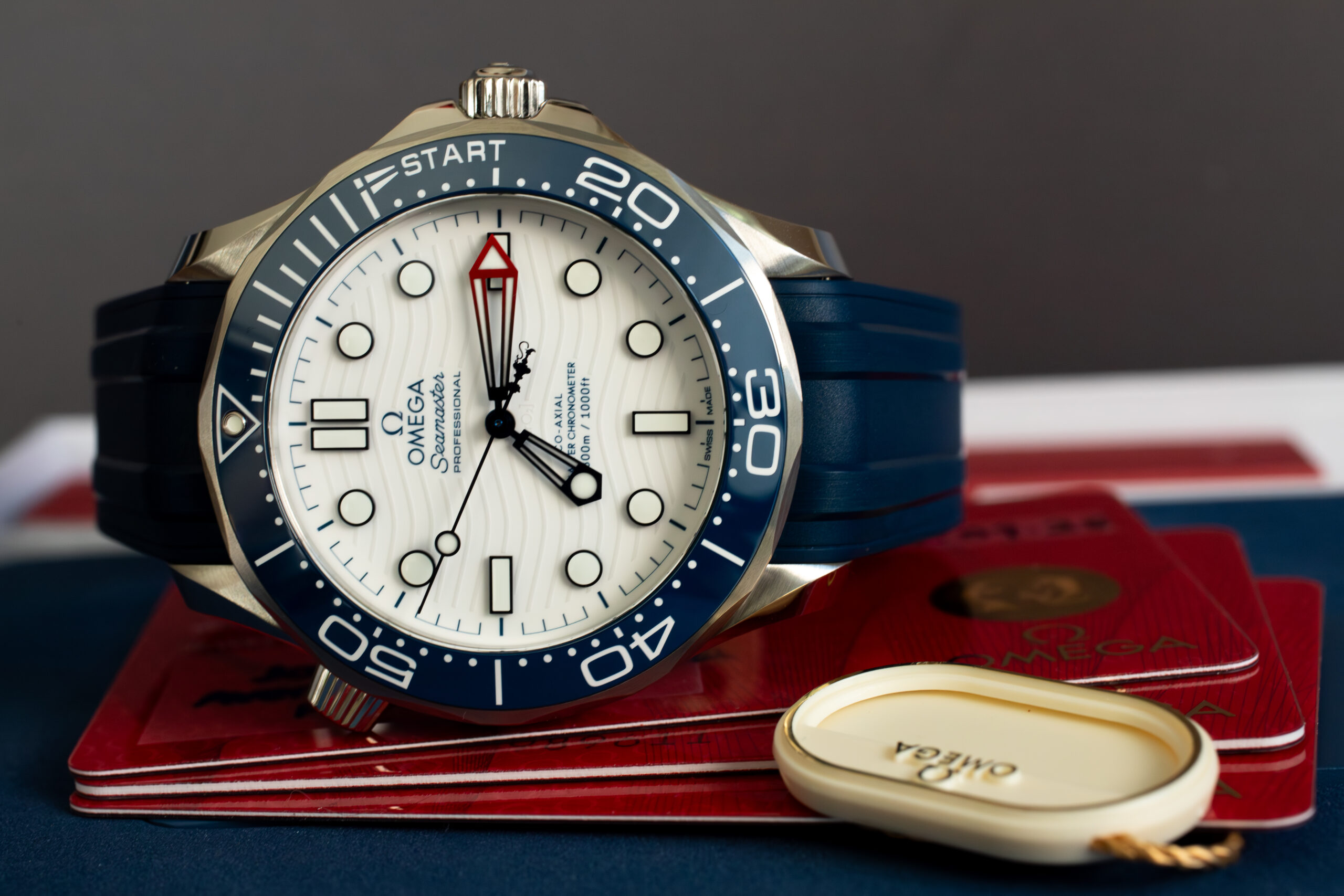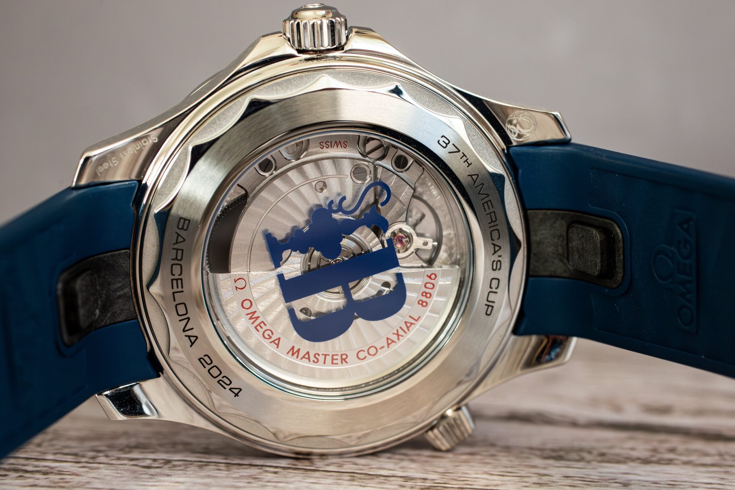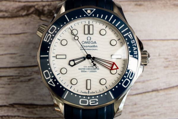 The OMEGA Seamaster America’s Cup 42mm (Ref. 210.32.42.20.04.002) celebrates OMEGA’s role as Official Timekeeper at the 37th America’s Cup through distinctive regatta scale on blue ceramic unidirectional bezel comprising two 5-minute pre-start sections and START section with regatta-inspired flag. The white ceramic matt-finish dial features laser-engraved waves in positive relief whilst the central seconds hand displays America’s Cup trophy counterweight in Barcelona blue creating authentic sailing connection.