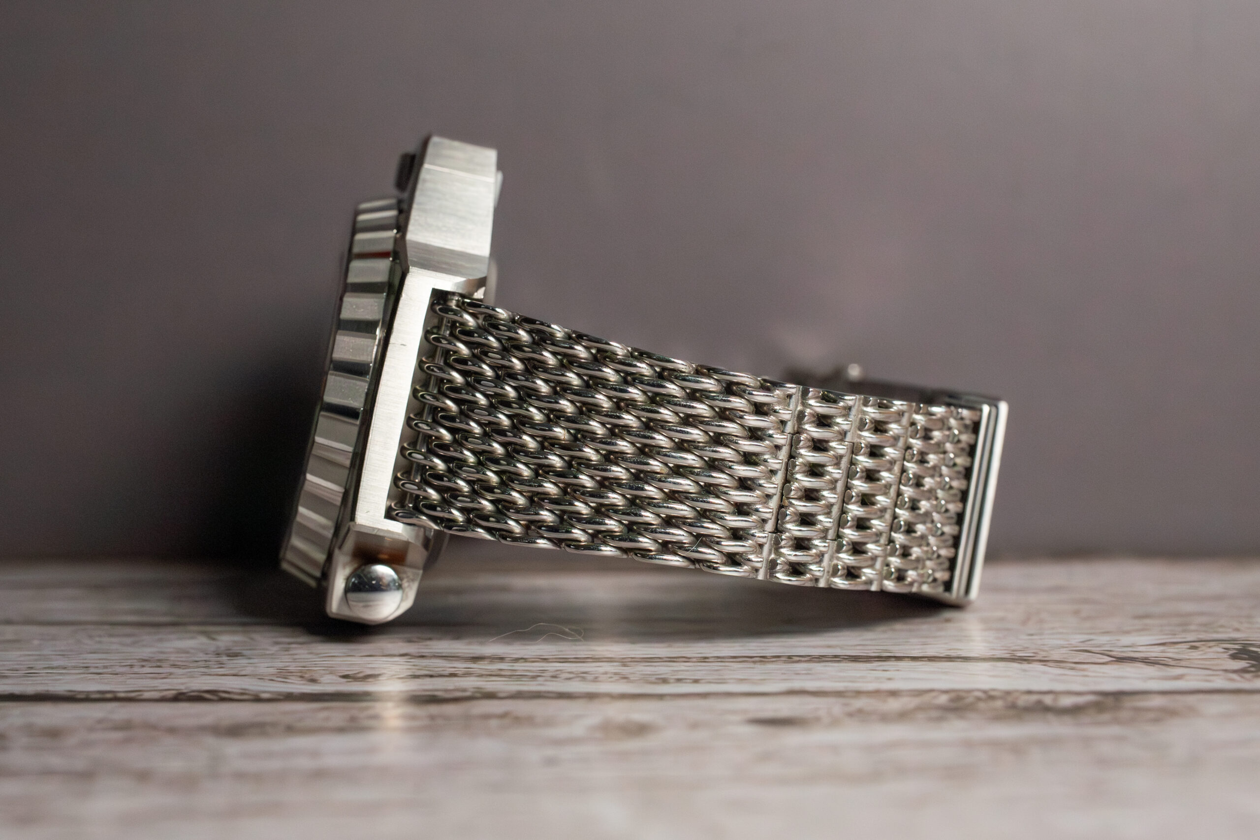 The “Sharkproof” bracelet provides exceptional durability and enhanced security essential for extreme diving applications where bracelet integrity affects equipment safety and operational confidence during demanding commercial diving operations. The construction offers superior strength compared to conventional bracelet designs whilst providing enhanced corrosion resistance essential for extended saltwater exposure during commercial diving work. The “Sharkproof” designation reflects authentic extreme diving construction rather than marketing enhancement alone.