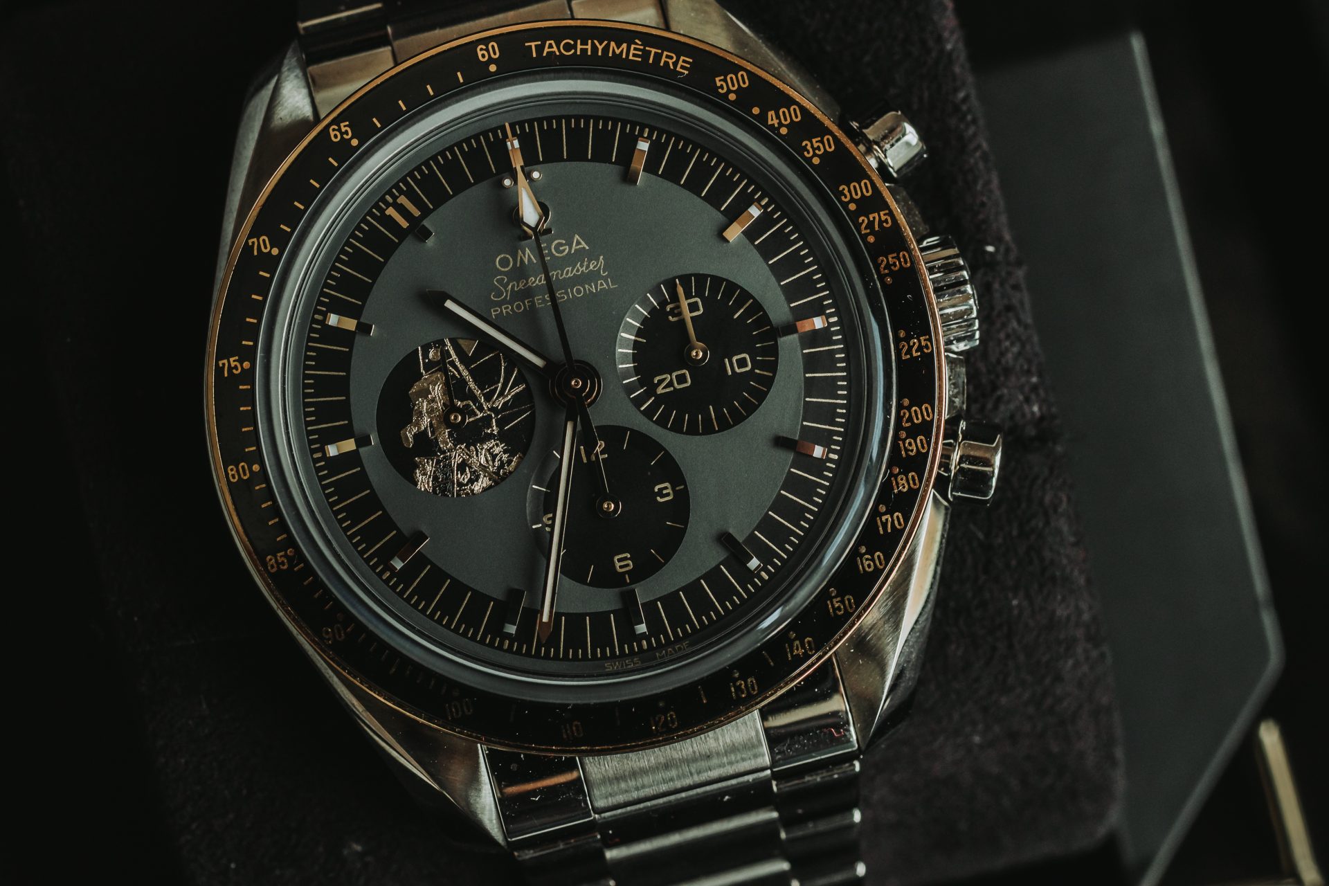 Moonshine™ Gold is a proprietary 18K gold alloy developed by OMEGA specifically for this anniversary edition. Its distinctive pale yellow colour is inspired by the moonlight shining against the dark night sky. Beyond its aesthetic appeal, this special alloy is more resistant to fading over time compared to traditional yellow gold, ensuring the watch maintains its distinctive appearance for generations. The use of Moonshine™ Gold for the bezel, hands, and applied elements creates a subtle yet luxurious contrast against the black dial, echoing the appearance of certain Apollo-era Speedmasters while adding a contemporary touch. This innovative material exemplifies OMEGA’s commitment to developing new metallurgical solutions that enhance both the beauty and durability of their timepieces.