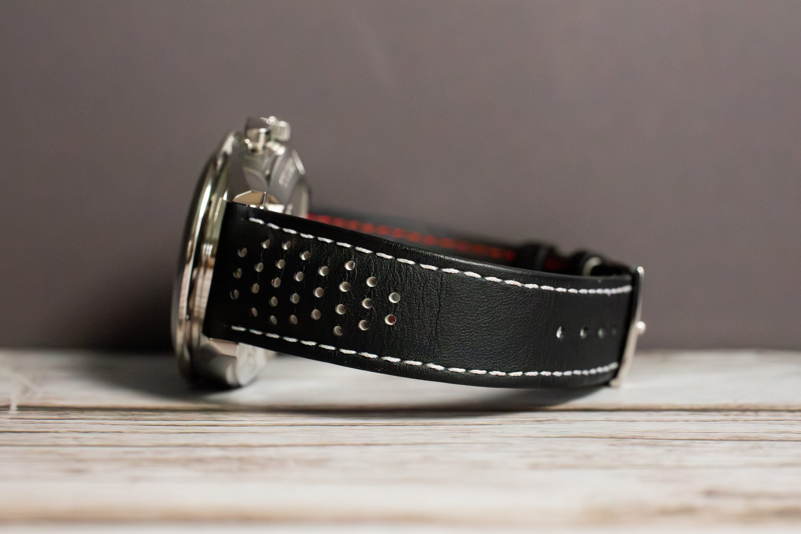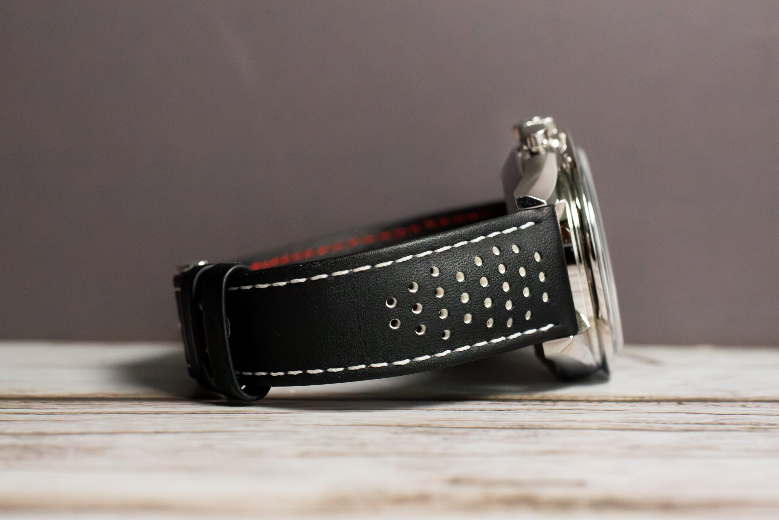 The black micro-perforated leather strap with white rubber interior creates distinctive comfort whilst the black ceramic bezel with white enamel pulsometer scale enables pulse rate measurements. The limited production number and original Seahorse medallion caseback authenticate the anniversary significance.
