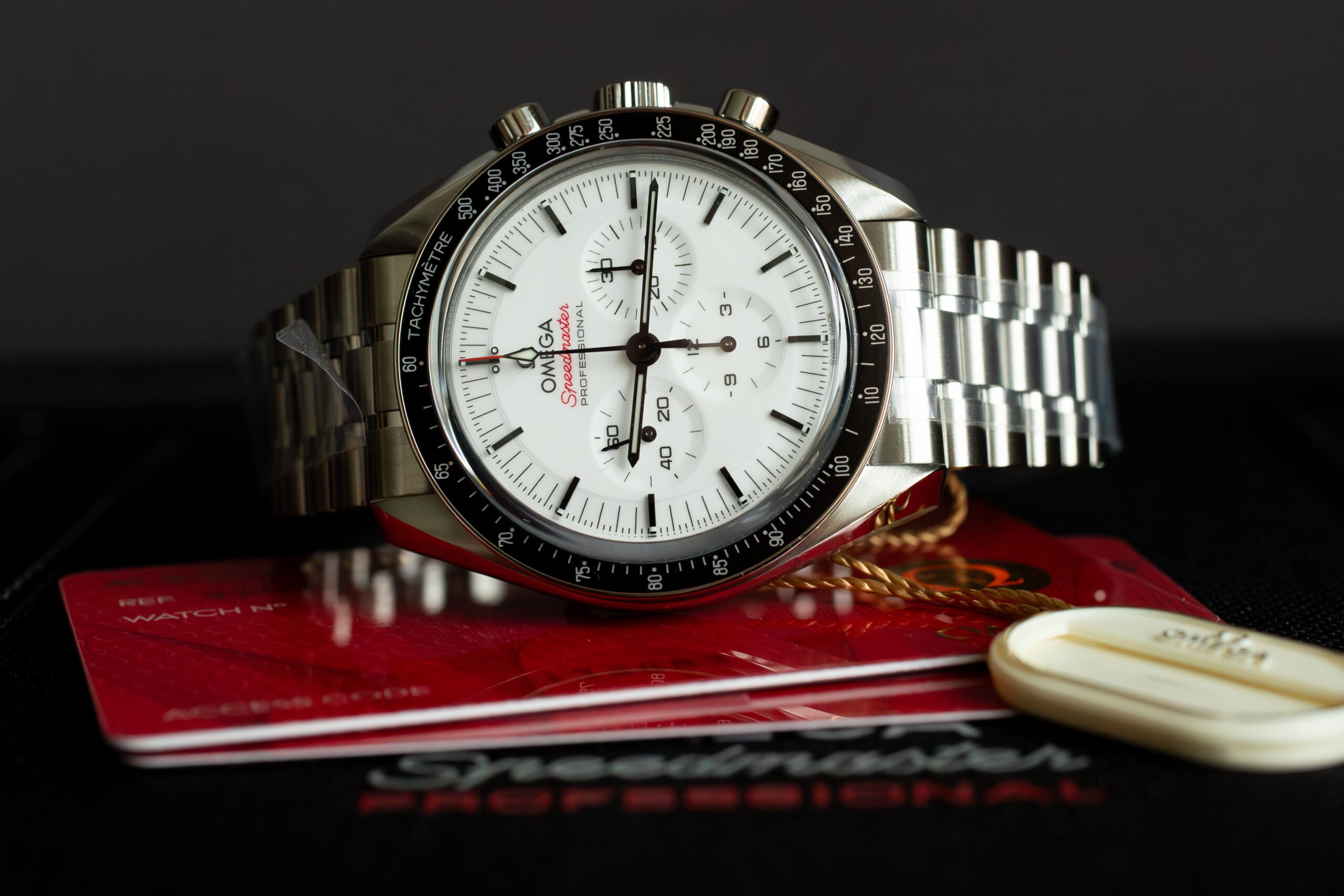 The white dial establishes distinctive character that differentiates this Moonwatch from traditional black dial variants while maintaining complete design fidelity to heritage proportions and layout. The colour choice creates sophisticated aesthetic that suits both casual and formal wearing occasions, providing versatility that appeals to collectors seeking single watch capable of spanning diverse dress codes. The white lacquered finish requires meticulous manufacturing to achieve consistent colour and prevent yellowing over time, demonstrating OMEGA’s commitment to dial quality that maintains pristine appearance throughout ownership.