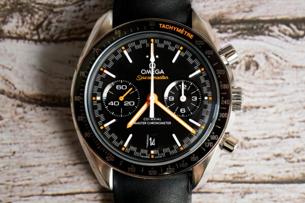 The OMEGA Speedmaster Racing Chronograph represents the pinnacle of modern chronograph engineering, combining exceptional precision with a design that pays homage to the brand’s motorsport heritage. With its 44.25mm stainless steel case and striking black ceramic bezel featuring a Liquidmetal™ tachymeter scale, the watch captures the essence of high-performance automotive design. The distinctive racing-style minute track and carefully crafted dial elements tell a story of speed, precision, and technical excellence.
