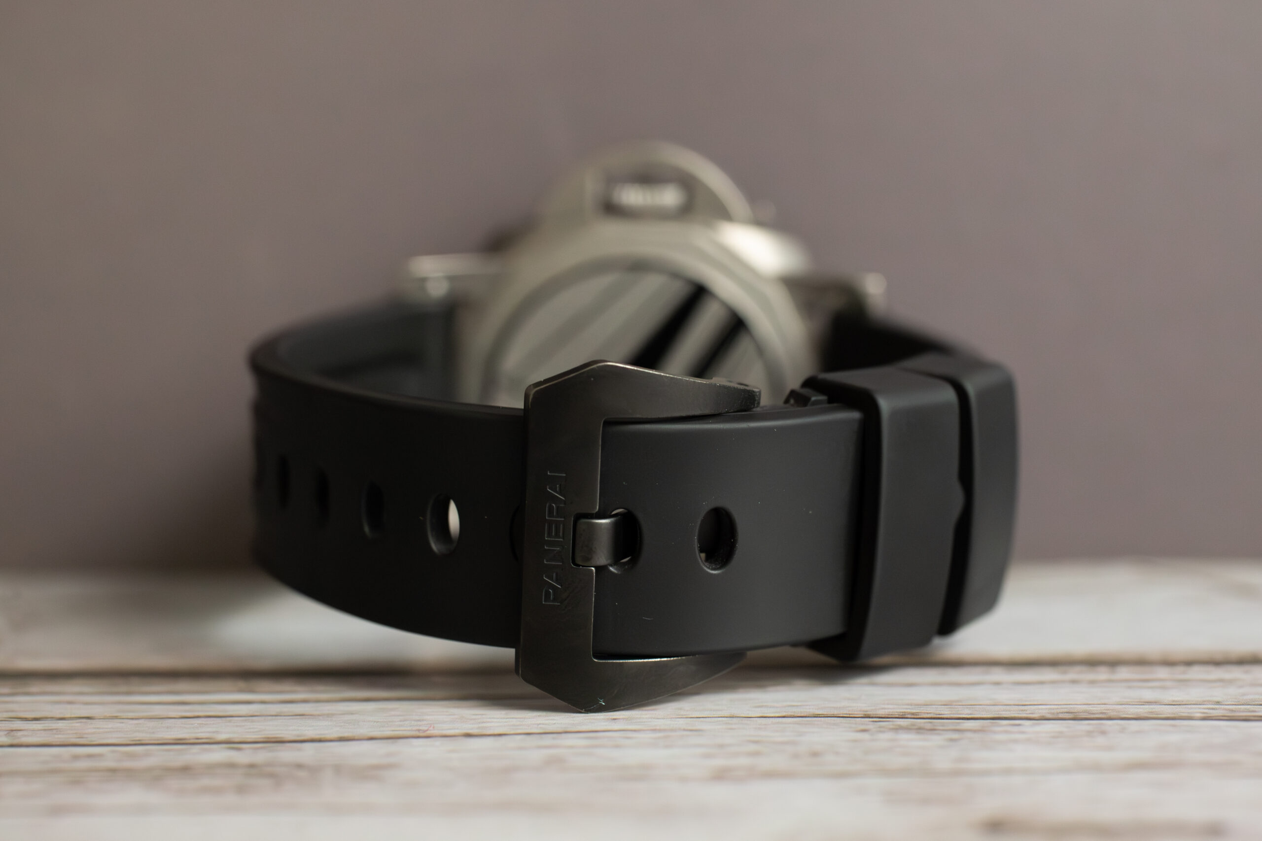The 42mm sandblasted titanium case wears lighter than steel while maintaining the distinctive Luminor presence. At 14.4mm thick, it’s substantial without being cumbersome, and the Safety Lock crown system gives it that unmistakable Panerai identity. The Carbotech bezel adds visual depth and genuine durability advantages in marine environments.