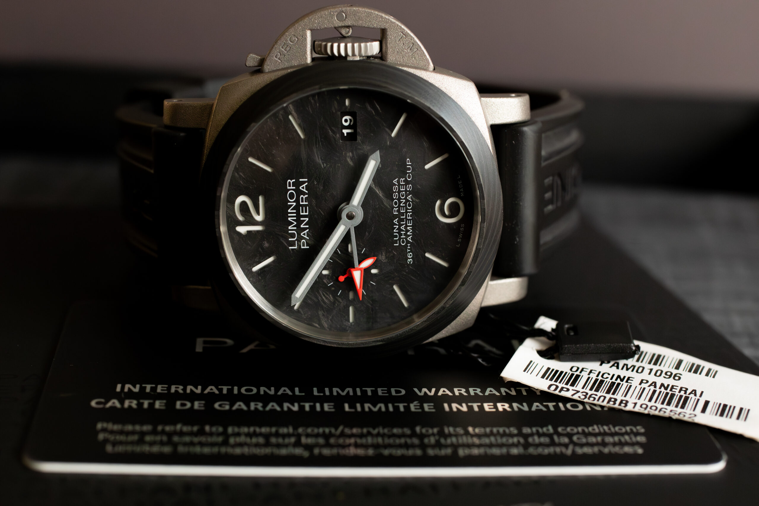 The Panerai Luminor Luna Rossa GMT 42mm (Ref. PAM01096) combines genuine America’s Cup heritage with Panerai’s most advanced materials technology. Limited to 250 pieces, this GMT features a ScafoTech™ dial made from actual Luna Rossa AC75 yacht carbon fiber – not a marketing gimmick, but recycled material from the racing boat itself.