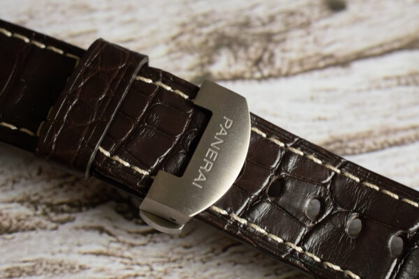 At 24mm lug width tapering to 22mm clasp, this provides optimal proportional balance for Luminor 44-48mm and Radiomir 1940 45-47mm models whilst the authentic alligator leather offers superior durability and luxury texture compared to conventional alternatives. The dark brown colouration provides versatile sophistication that complements both casual and formal attire.