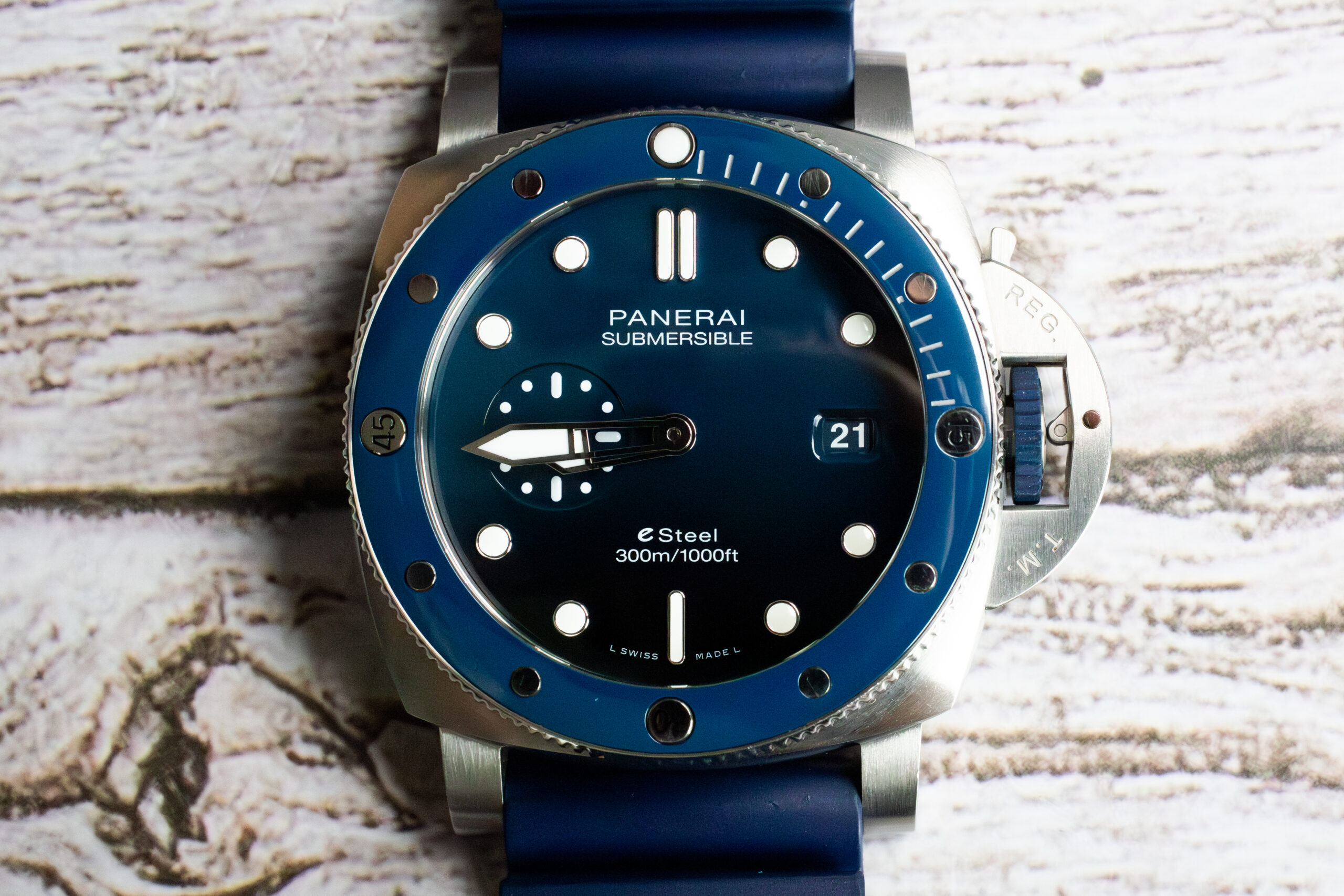 The recycled PET blue strap continues the sustainability theme whilst providing comfort and durability for underwater operations. The 300m water resistance and unidirectional rotating bezel meet serious diving requirements whilst the crown protection device features special eSteel engraving highlighting the innovative construction.
