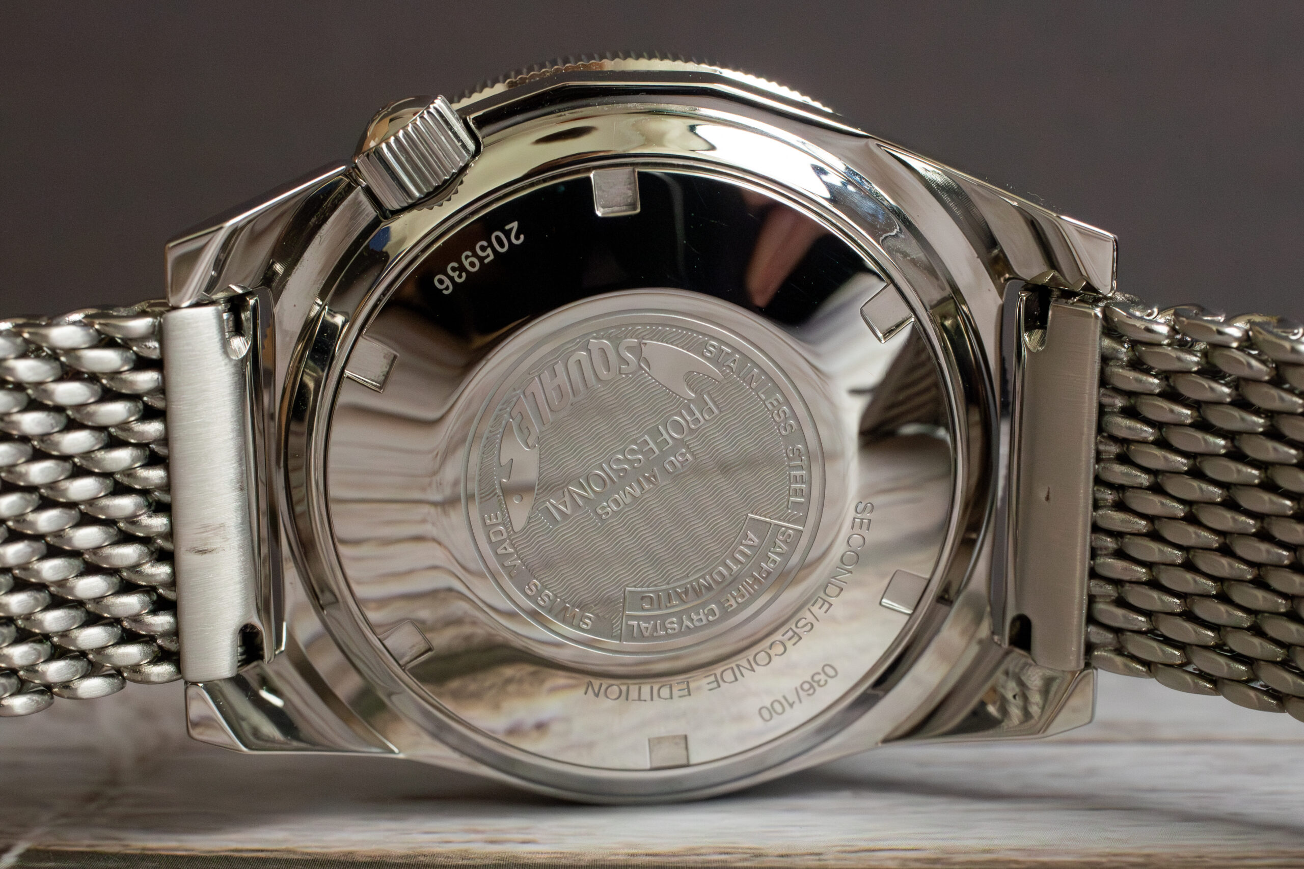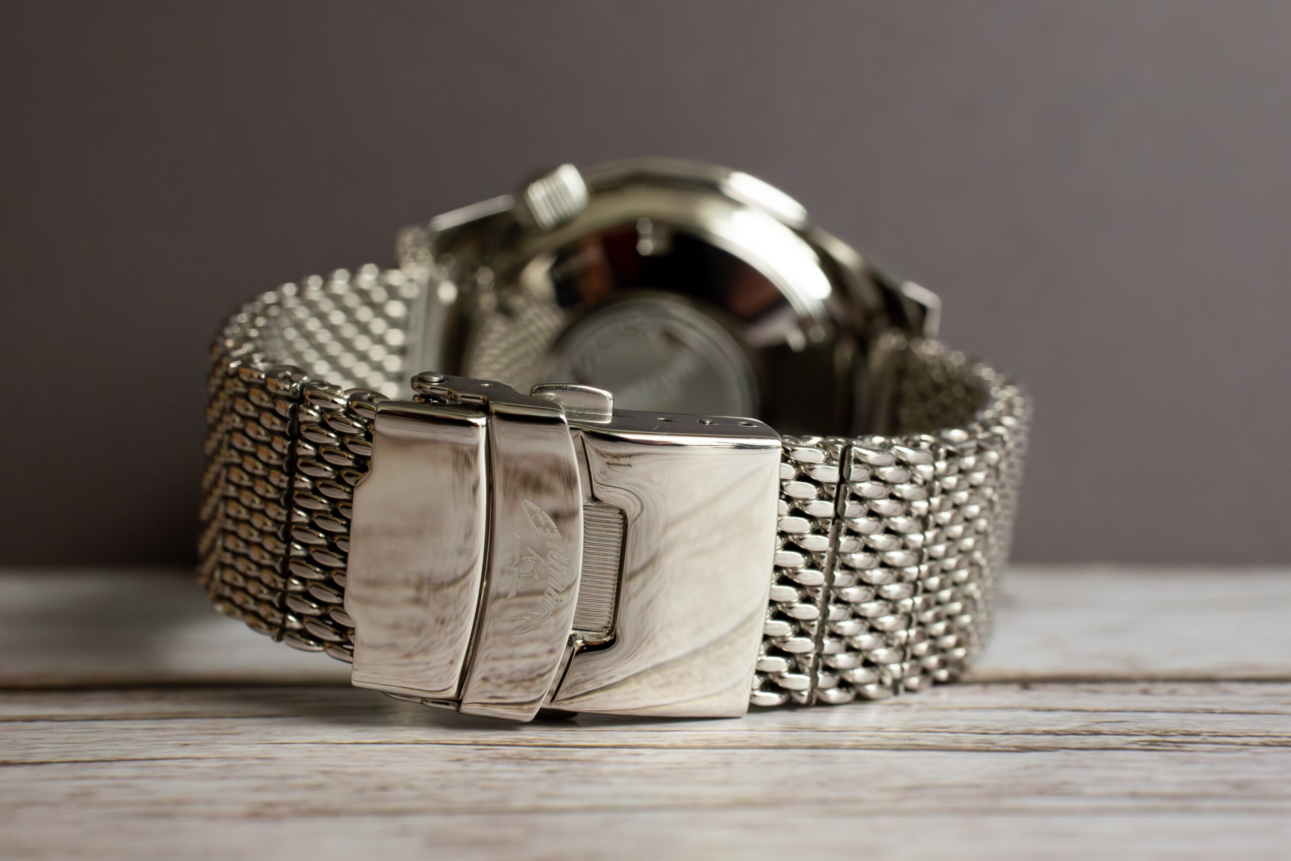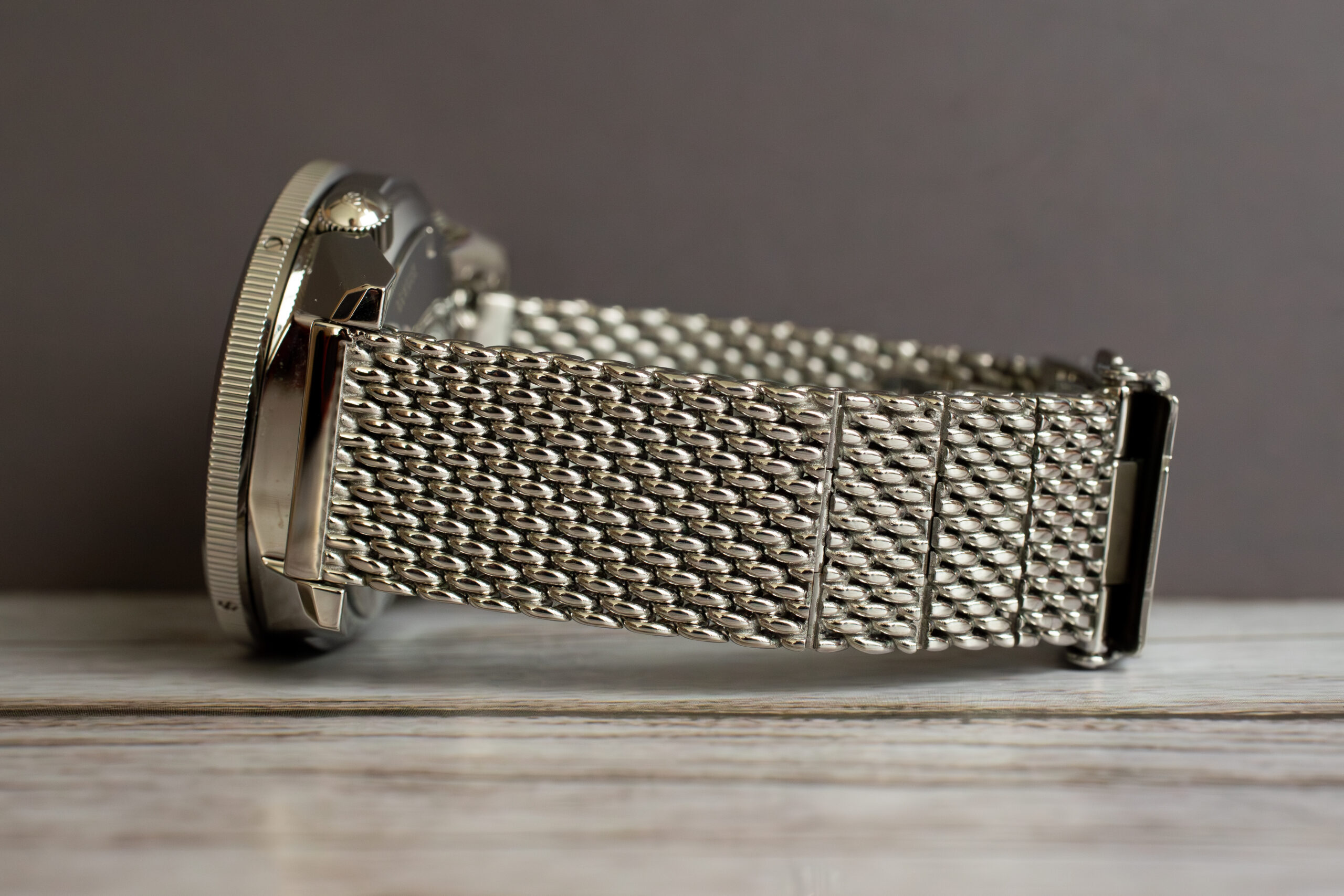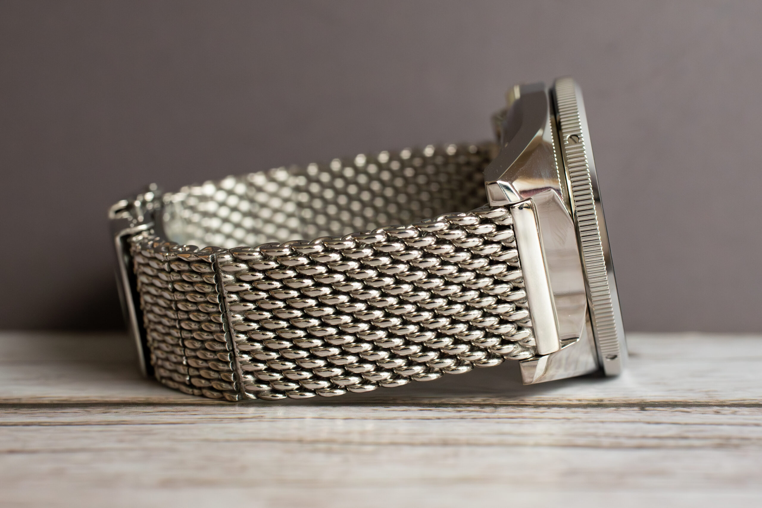 The classic steel Milanese mesh bracelet with folding clasp creates sophisticated presentation whilst the shark attack design element adds distinctive character that differentiates this from conventional diving watches. The combination maintains serious diving functionality with playful aesthetic approach.