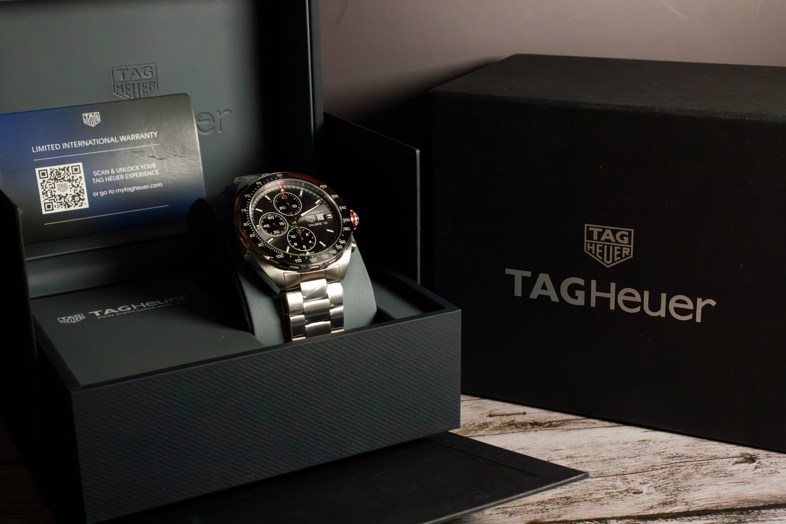 The larger case also enables robust construction capable of withstanding racing environments including vibration, G-forces, and impact conditions common in professional motorsport whilst maintaining chronograph precision throughout demanding competitive profiles. The substantial presence commands appropriate attention for professional racing equipment whilst ensuring optimal legibility during high-stress racing situations. For racing professionals and motorsport enthusiasts who require authentic racing chronograph capability, the 44mm sizing provides optimal balance between visibility, functionality, and durability that serves genuine racing requirements whilst maintaining the sophisticated aesthetics expected from luxury sports chronographs and TAG Heuer manufacturing excellence.