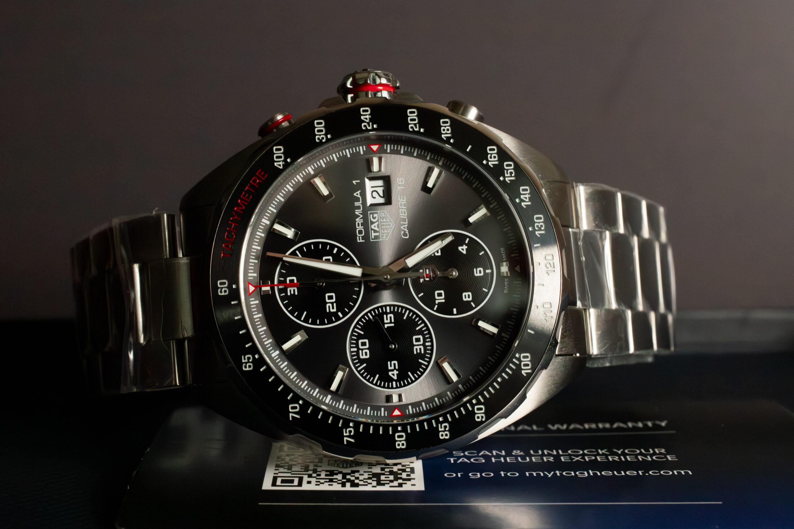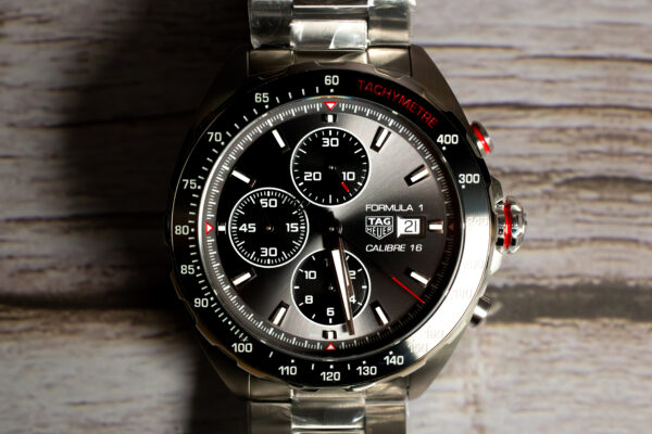 The anthracite grey dial creates sophisticated aesthetic that distinguishes this Formula 1 chronograph whilst maintaining the high-contrast legibility essential for professional racing timing operations where clear reading could affect competitive performance and safety procedures. The sunray-brushed finish enhances visual depth whilst the colour choice provides distinctive alternative to traditional black racing chronographs without compromising the visibility required for demanding motorsport applications. The grey treatment demonstrates TAG Heuer’s ability to combine contemporary design preferences with functional racing requirements.