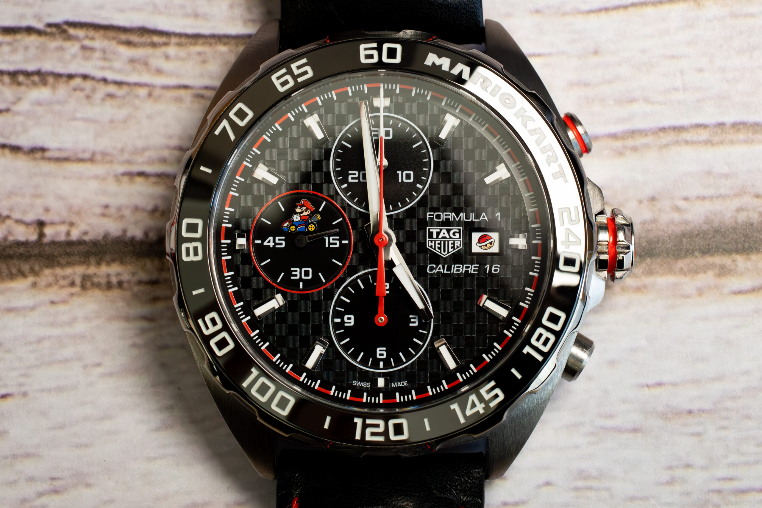 The TAG Heuer Formula 1 x Mario Kart Limited Edition 44mm (Ref. CAZ201E.FC6517) celebrates the iconic Nintendo franchise through distinctive collaboration featuring Mario himself in his kart within the small seconds subdial and finish line checkerboard dial pattern. Limited to 3,000 pieces, this showcases red lacquer accents on the pusher and crown referencing Mario’s signature colour whilst the M logo emblazoned on the crown creates unmistakable gaming connection.