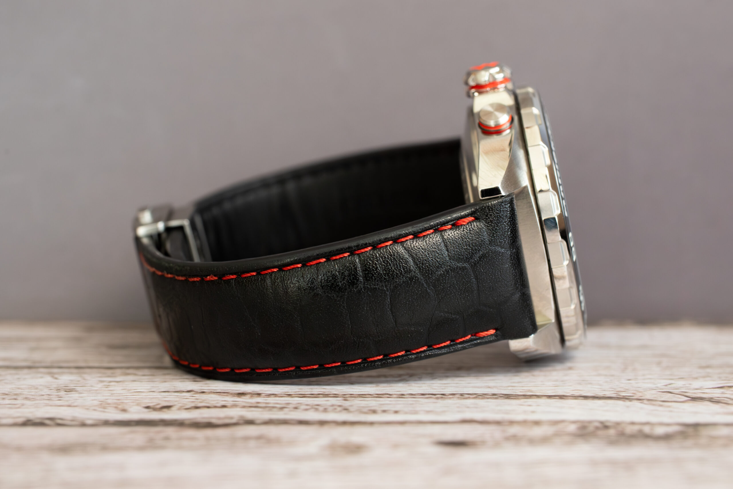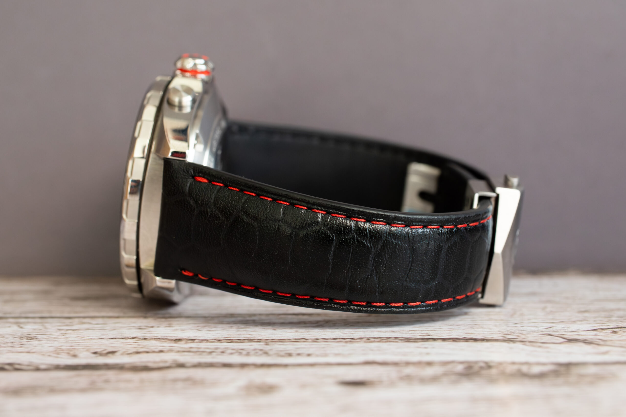 At 44mm with stainless steel construction, this provides substantial sports watch presence through shiny black ceramic tachymeter bezel whilst the black dial incorporates several date numerals replaced with instantly recognisable Mario Kart items and symbols. The textured black leather strap with custom embossed pattern and red lining creates cohesive gaming aesthetic whilst maintaining racing watch character.