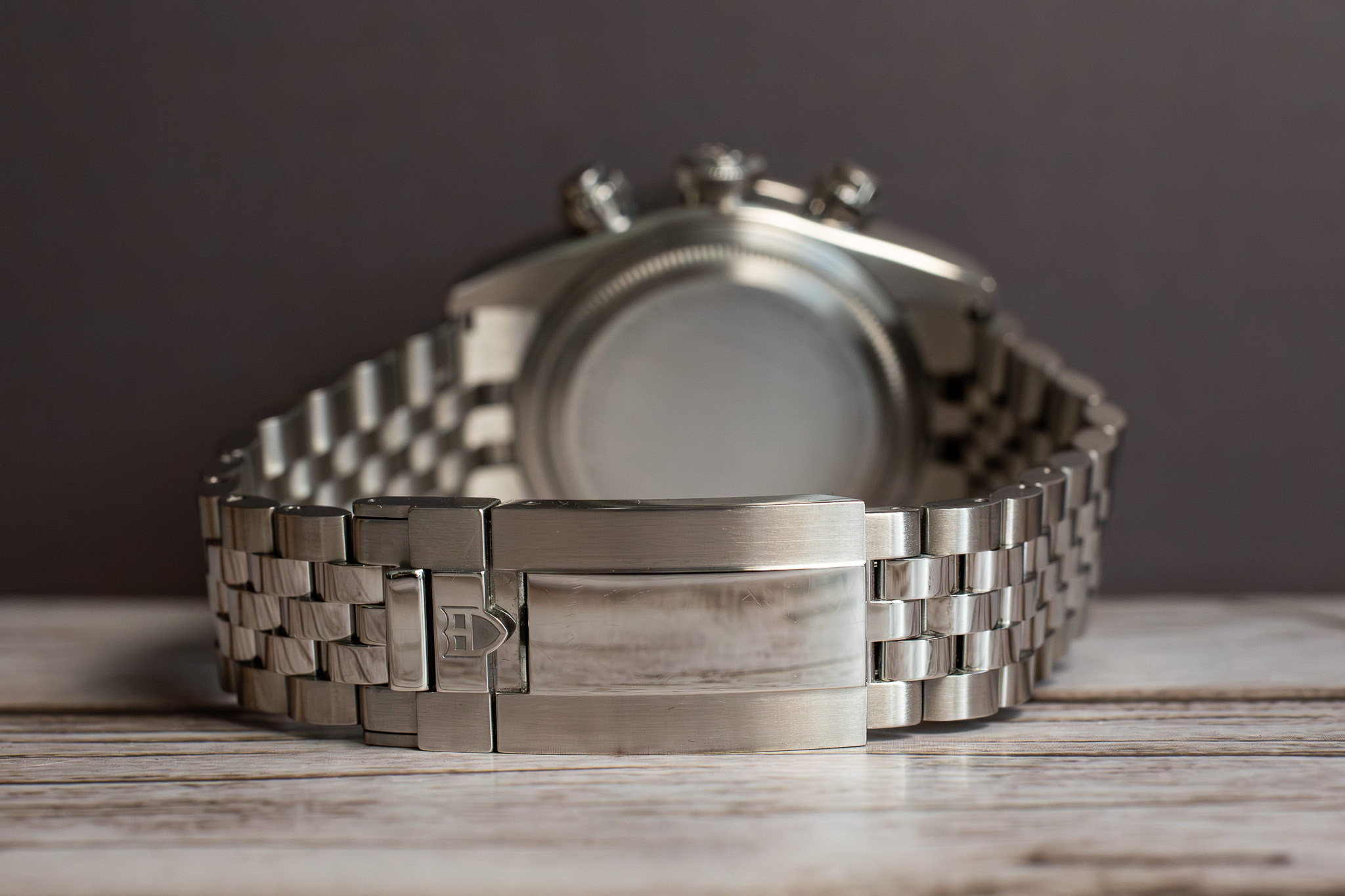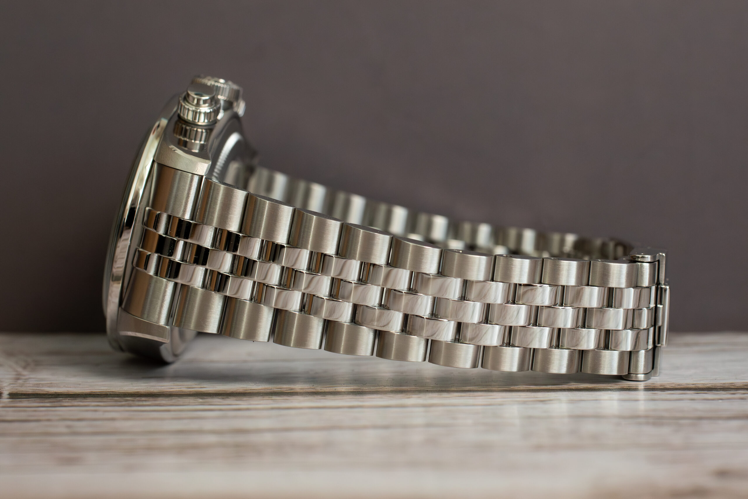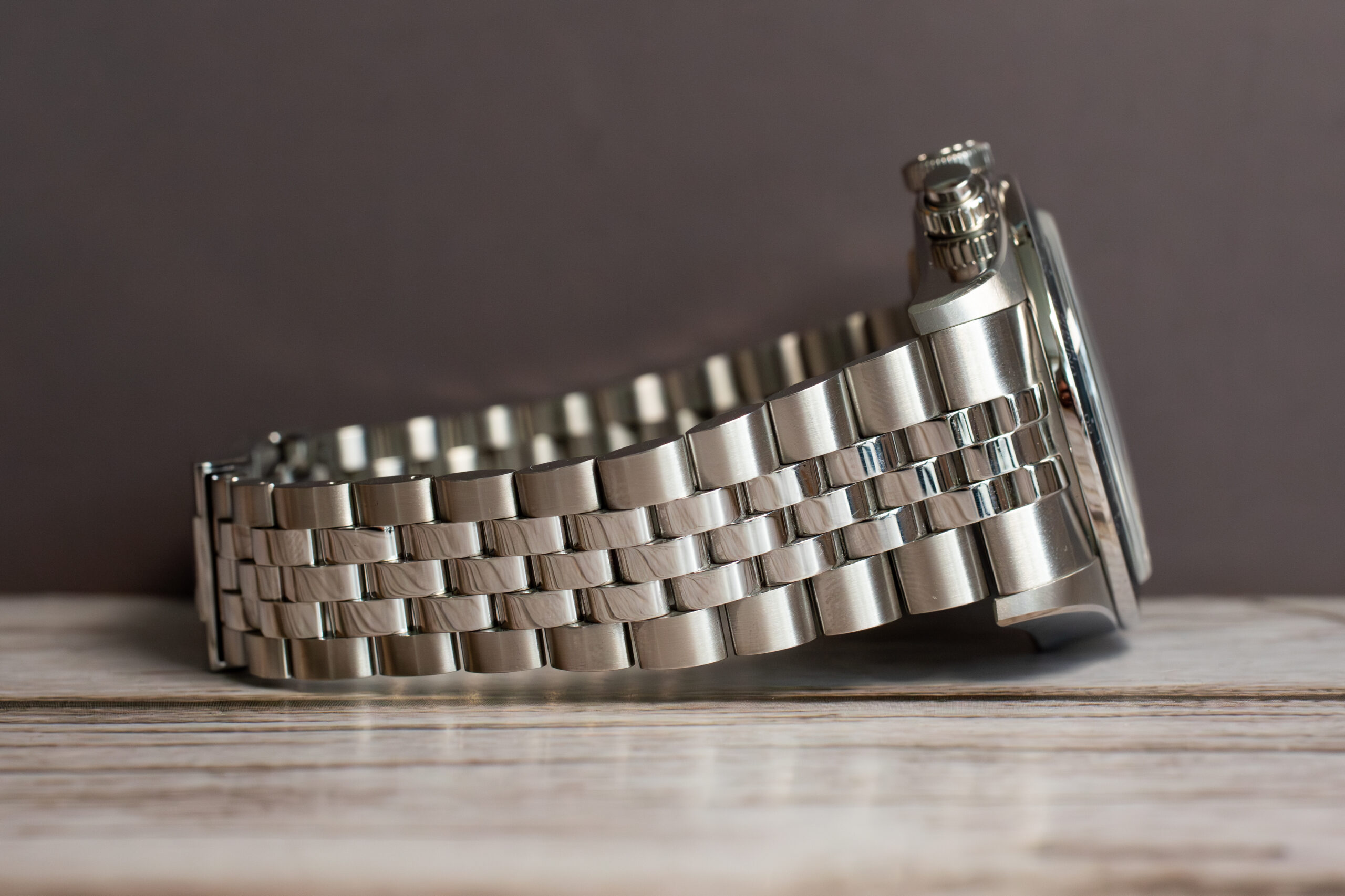 The domed sapphire crystal ensures optimal clarity whilst the 5-link stainless steel bracelet with T-fit rapid adjustment clasp provides 8mm adjustment window through ceramic ball bearings for secure closure. The 200m water resistance maintains diving capability despite chronograph complexity.