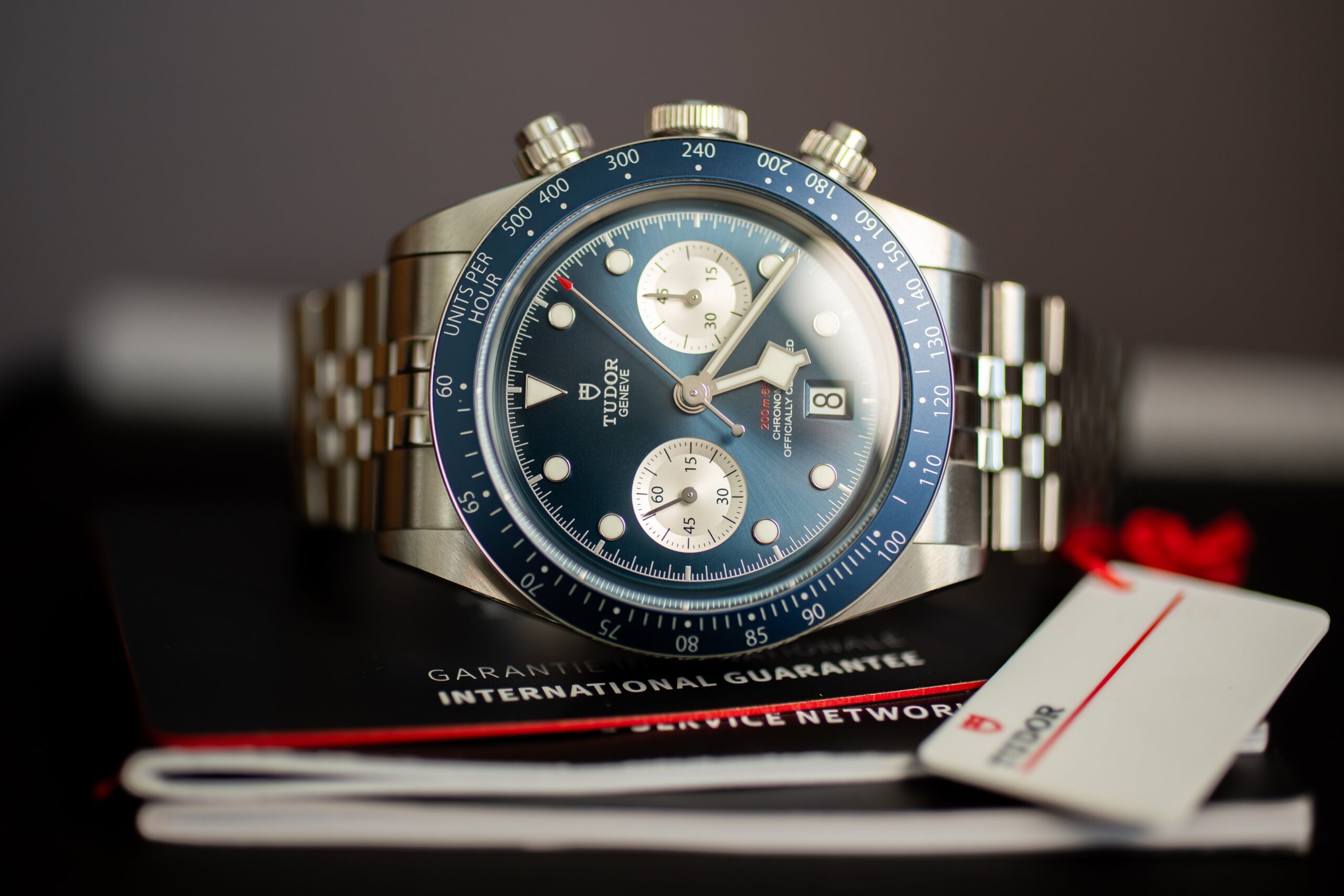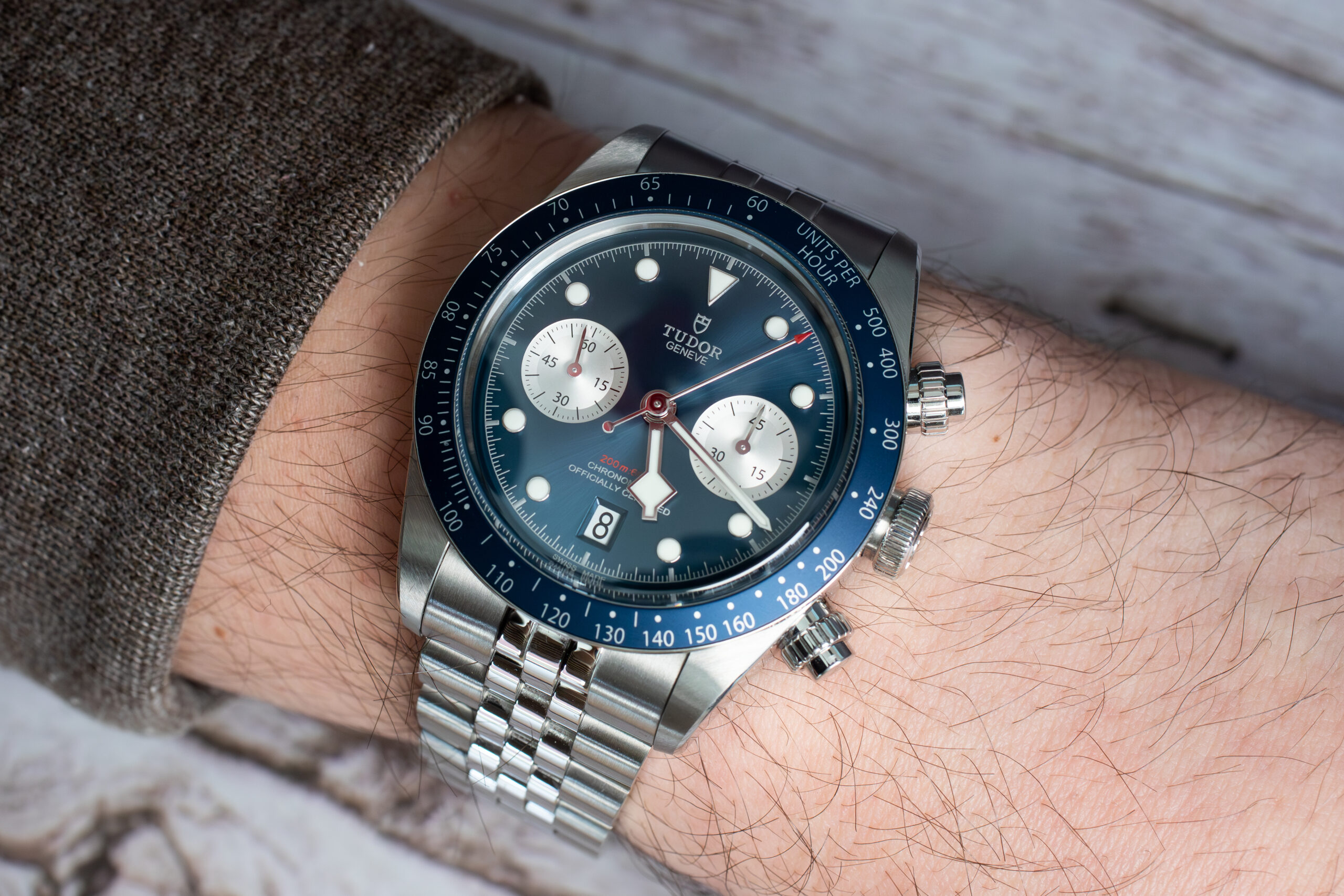 At 41mm with 14.4mm thickness through stainless steel construction, this provides refined chronograph proportions whilst maintaining the recognisable Black Bay characteristics including satin-brushed and polished finishes, bevelled lugs, and TUDOR rose-signed crown. The fixed stainless steel bezel with tachymetric scale insert in blue anodised aluminium creates cohesive aesthetic whilst the pushers inspired by first generation TUDOR chronographs honour historical design.
